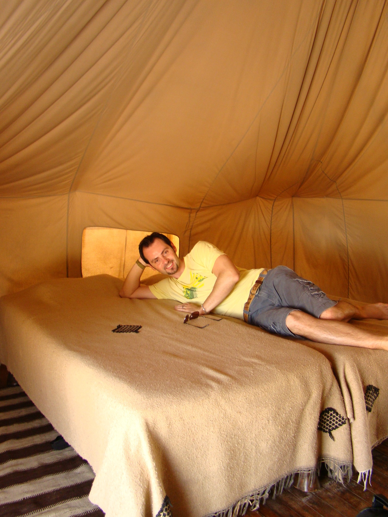 Next we checked out our accommodations which were these awesome tents (about 2 feet off the ground) standing about 12 feet tall at the apex. Inside were beds for 4 people, moroccan rugs and a couple of oil lamps for the night. Each tent was also equipped with its own bathroom (sink, shower and toilet), outside and fenced in (no ceiling so it felt very open – which was cool but also a little concerning as neighboring tents were only feet away). More on this later.