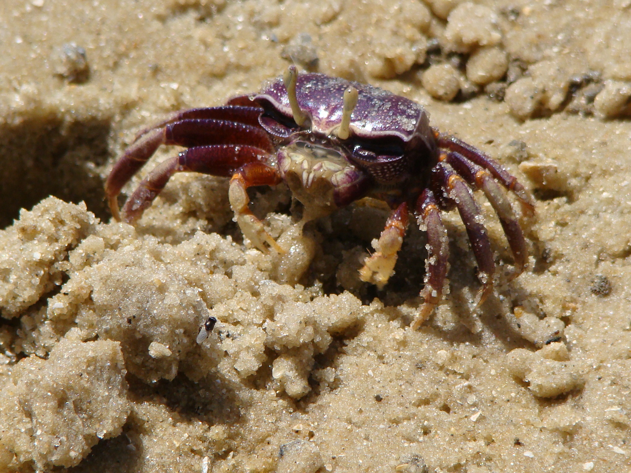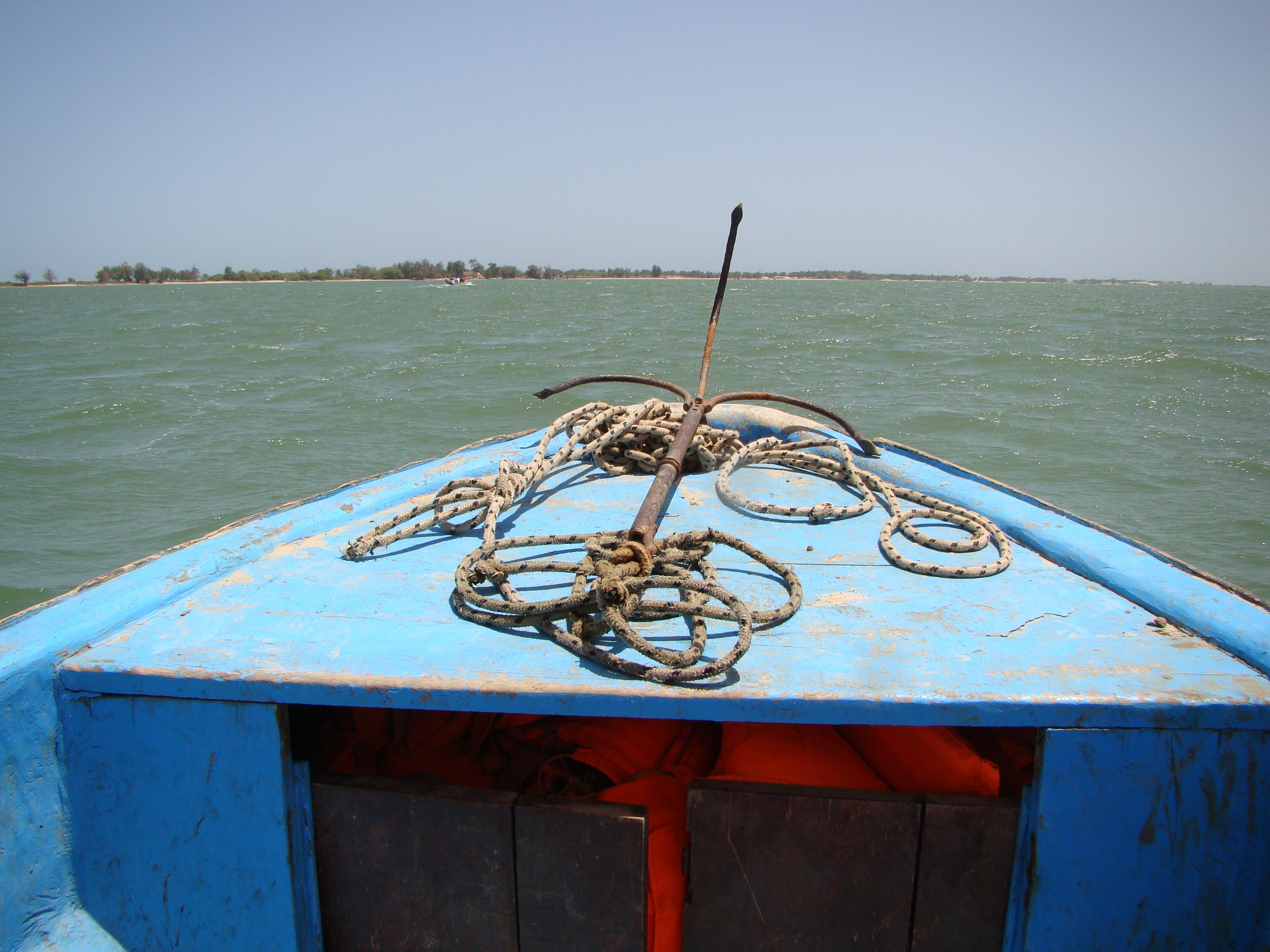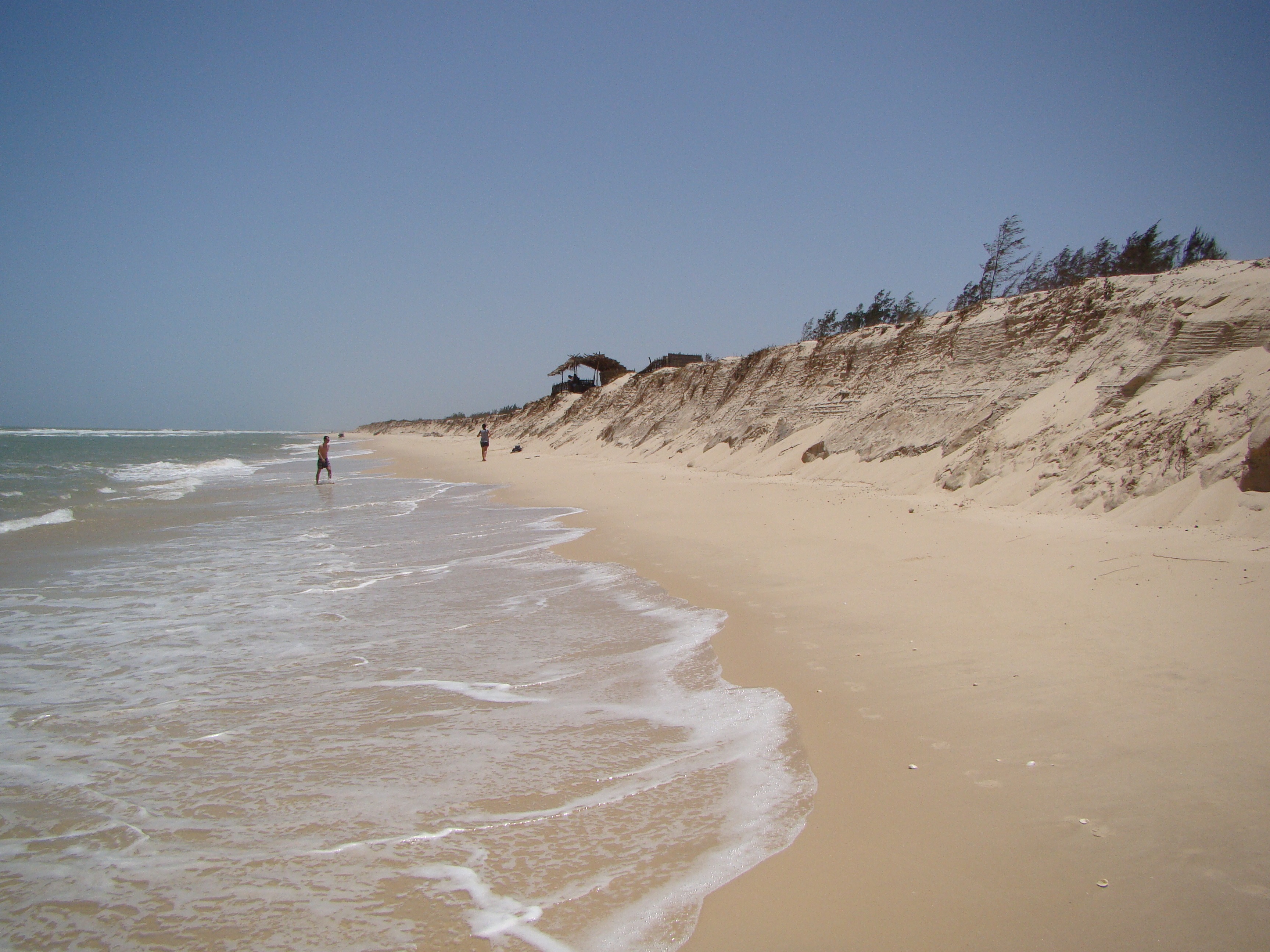This was a small piece of paradise amongst the arid countryside in the north of Senegal. This is also where we took our first “pirogue” ride across the estuary. The pirogue is the traditional fishing boat of Western Africa (nowadays it’s also used for transporting tourists). We traversed the lagoon and found ourselves at the “Campement Ocean et Savane” a beautiful tiny beachfront retreat with a very cool restaurant under a huge tent. All this was located on Langue de Barbarie (the stripof land separating the Senegal river from the ocean which was about couple hundred feet wide). Naturally we took advantage of both worlds and went into the Atlantic Ocean first which had a constant flow of waves and a strong current. The beach itself was only about 30-40 feet wide and access to it was via a 15 foot drop off a sand dune. The beach was completed deserted and from the top of the dune we spotted many crabs that ran away as soon as we descended upon their territory. Cooling off in the ocean was very necessary. Soon after it was just about lunch time.