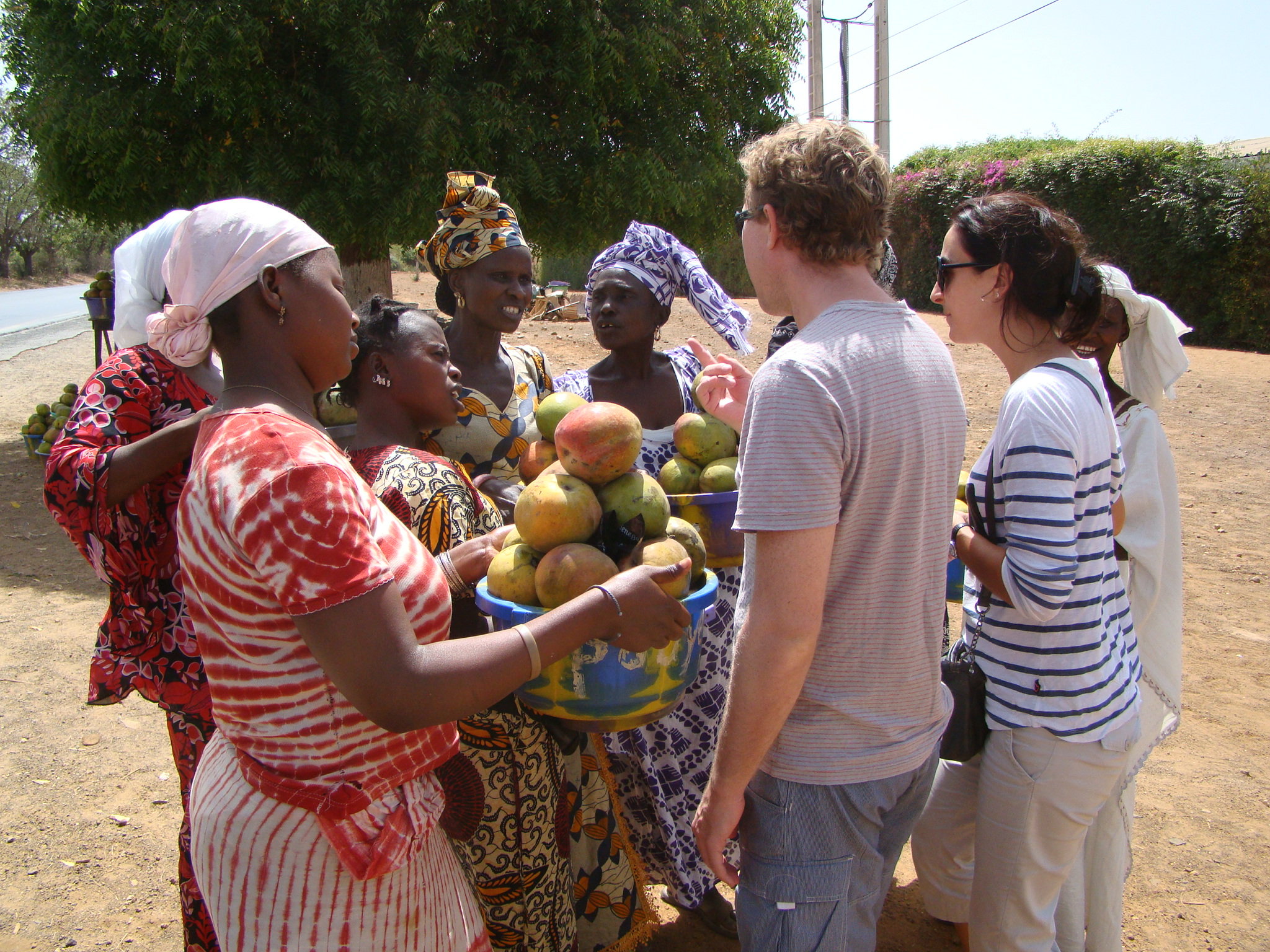 As we finally reached the countryside, the landscape was mainly dry (and sandy) but filled with these amazing looking trees called “baobab trees” (they have a corklike bark that is fire resistant and can store hundreds of liters of water, and their leaves are used for medicines and condiments – some baobabs have been proven to be over 2,000 years old). We also saw tons of animals: goats, donkeys, horses, sheep, birds (hawks and vultures), dogs and even a couple monkeys! At one point, we stopped at some roadside shops and checked out the local hand-made woven goods – baskets, bowls and other arts and crafts. Philippe and Charlotte bought a few things, while Brigitte took a bunch of pics and I engaged with two little boys in juggling a soccer ball. All I could think was that it was hot outside, really hot as in 100+ degrees fahrenheit and these ladies selling goods and their kids are out in this sun all day every day (it really makes you appreciate air conditioning). Although the moment you step in the shade it feels 20 degrees cooler…
