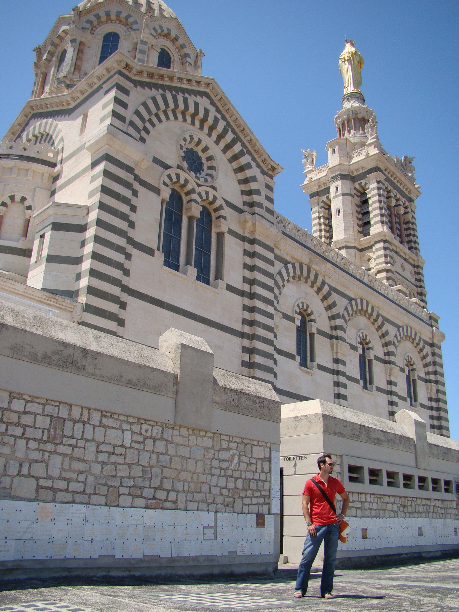 Our alternate plan consisted of walking around Marseille and seeing some of its other important landmarks. We started with the Notre-Dame de la Garde, a beautiful Neo-Byzantine basilica located atop the highest point in Marseille (a 530-foot tall hill). Notre-Dame de la Garde is visible from any point in Marseille and it was quite a hike to reach it. What started out as a chapel back in the 13th century became a beautiful basilica constructed from limestone which today stands guard for the people of Marseille. We checked out the crypt first located on the lower level of the basilica and then made our way inside the chapel part. To our surprise it was very different from most churches we’ve seen thus far on our trip. The design and decor was very colorful and ornate. The walls on one side were decorated with several rows of wartime medals as well as a fine collection of paintings displaying naval ships and fishing boats from the last couple of centuries. On the opposite wall there were numerous other paintings of Marseille and the countryside depicted throughout the same era. What struck us most was how busy and colorful it was inside but everything seemed to have its place and was thus in harmony. Brigitte snapped a few photos and then we made our way outside for more pictures. Standing atop the 530-foot hill offered us some pretty amazing views of Marseille, the Old Port, and the Mediterranean Sea. The other amazing component here was the wind (at 40 mph) which at this altitude really kicked ass. We fought our way to take a few pictures of the panorama but most had to be taken time and time again.