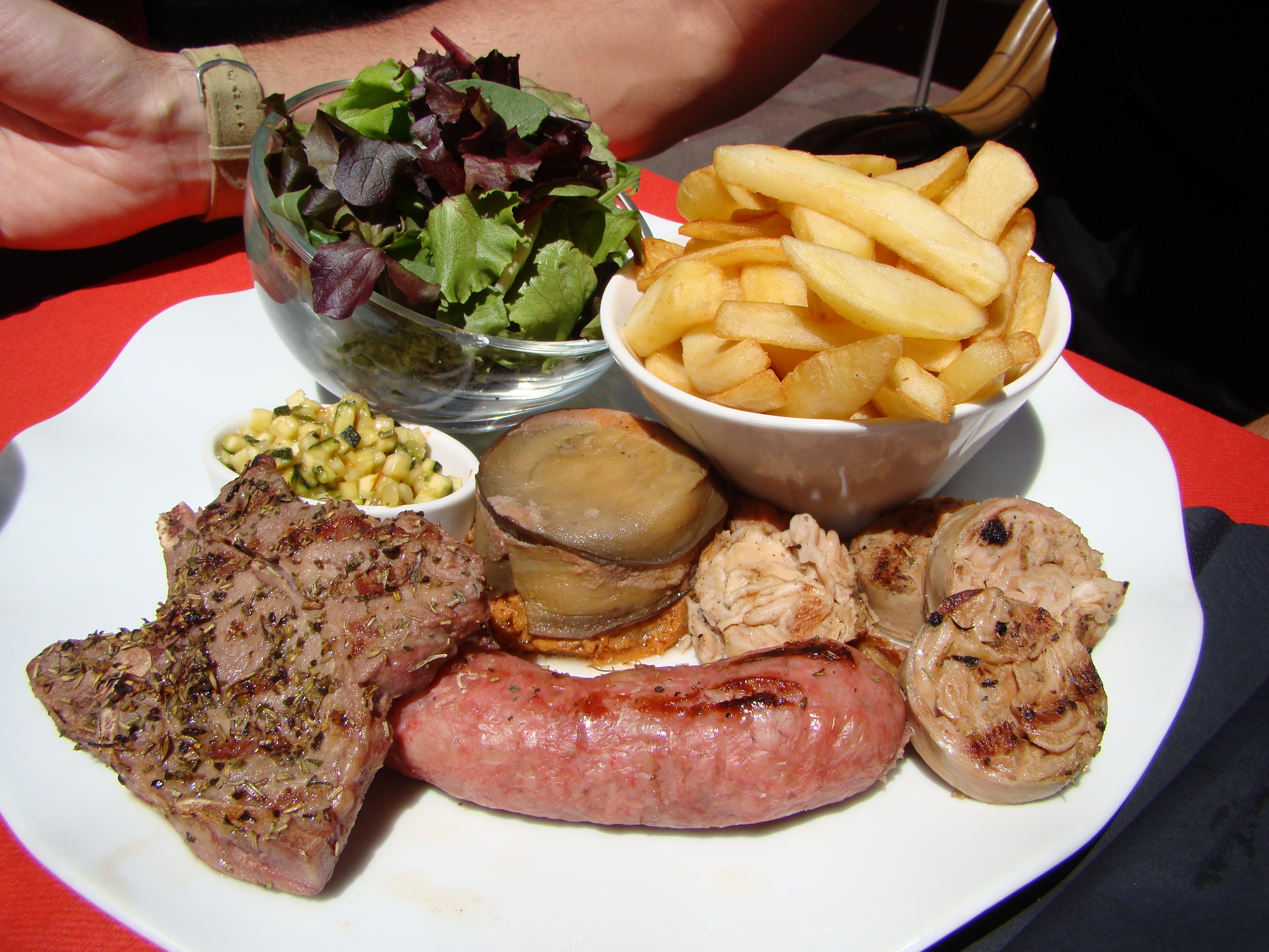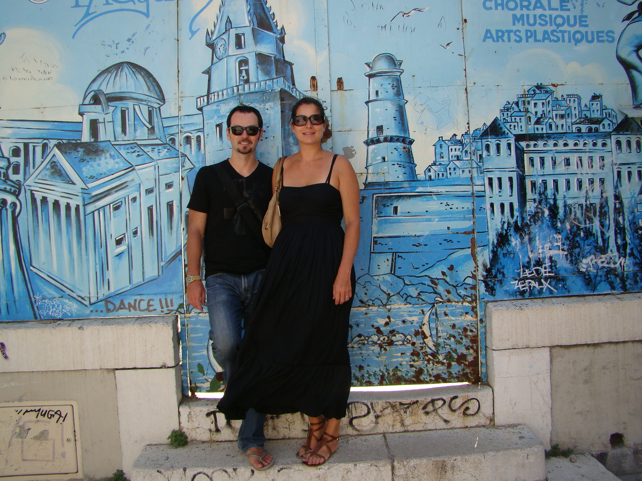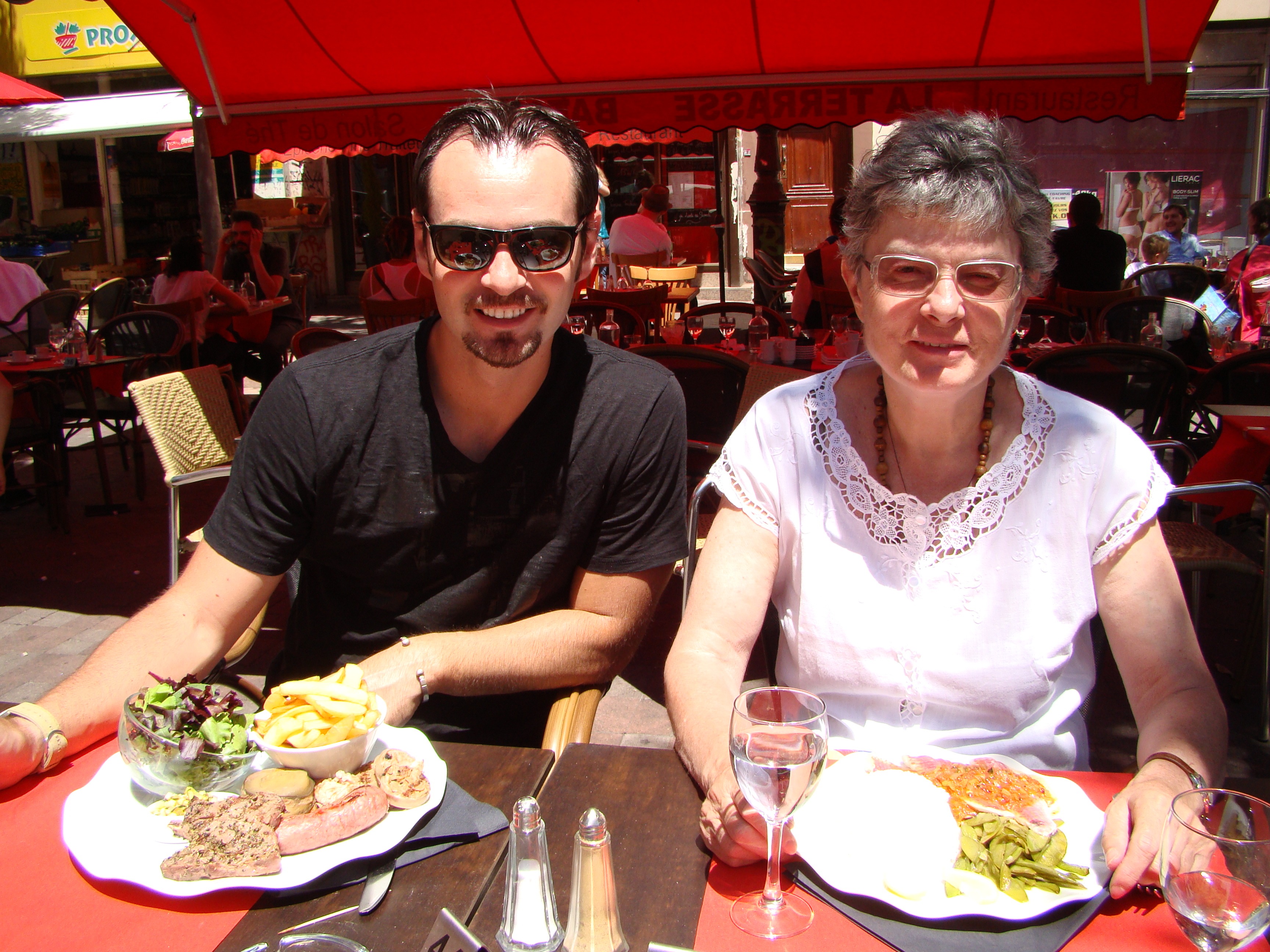 We spent the next day with Brigitte’s aunt Danielle who’s been living in Marseille for most of her life. We started out by having lunch in the Cours Julien followed by an expert tour of the city. Lunch was great and I got to try a real Andouille sausage (made primarily from pig intestine) as part of the mixed grill plate I ordered. It’s definitely an acquired taste which works well with mustard. Danielle has intimate knowledge of the city so we made our way towards the old town where Marseille emanated from centuries ago. We started out going by the house where her parents (Brigitte’s grandparents) actually met. Next we stopped in front of an unassuming building displaying a giant French flag on rue Thubaneau. This is a memorial to the Marseillaise (the French anthem). The name of the song was originally “War Song for the Army of the Rhine” but it soon became the rallying call to the French Revolution and was adopted as La Marseillaise after the melody was first sung on the streets by volunteers from Marseille. Hence the new name.