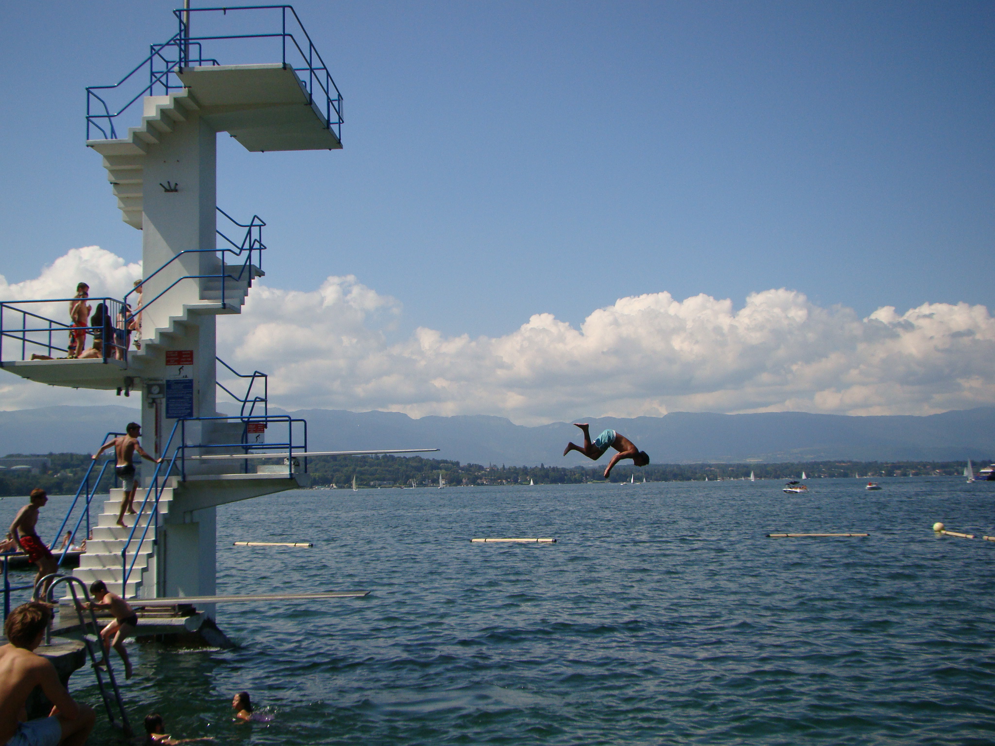 For the next couple of days we decided to pop into Geneva one more time and hang with Dawda, Claire and Aden. Sunday was a gorgeous day so we made the best of it by going to Geneva Beach – a perfectly manicured grass park edging on Lake Geneva comprised of several swimming pools, orderly beach lockers, concession stands, etc. Oh and a very erect diving platform over the lake with its highest point topping off at about 35 feet – something I instinctively blocked out of my mind as reassurance of never giving one ounce of thought to the notion of free fall. But then again, what’s a day at Geneva Beach without jumping into the lake from the diving platform? At least that was Dawda’s disposition.. but why I chose to follow suit and plunge from that height (which for many is but a hop), I still can’t comprehend. Right before taking that proverbial leap of faith I told myself, when ever will you have the opportunity to crash into Lake Geneva at free-fall speed right after one of your best friends did it without a second thought. Not to mention that I would’ve become the laughing stock of several much younger children who were at the top of the platform right behind me anxiously awaiting their turn. If you don’t like heights (and I certainly don’t), then don’t test yourself unless you can handle the repercussions – which for me meant a delayed case of extreme nausea followed by projectile vomiting and headache. Not only that but I was also sidelined for Claire’s delicious pasta dinner that night and Dawda’s uncorking of a 2000 Layer Cake Merlot – which Brigitte said was delish. Playing Johnny Bravo served me right.
