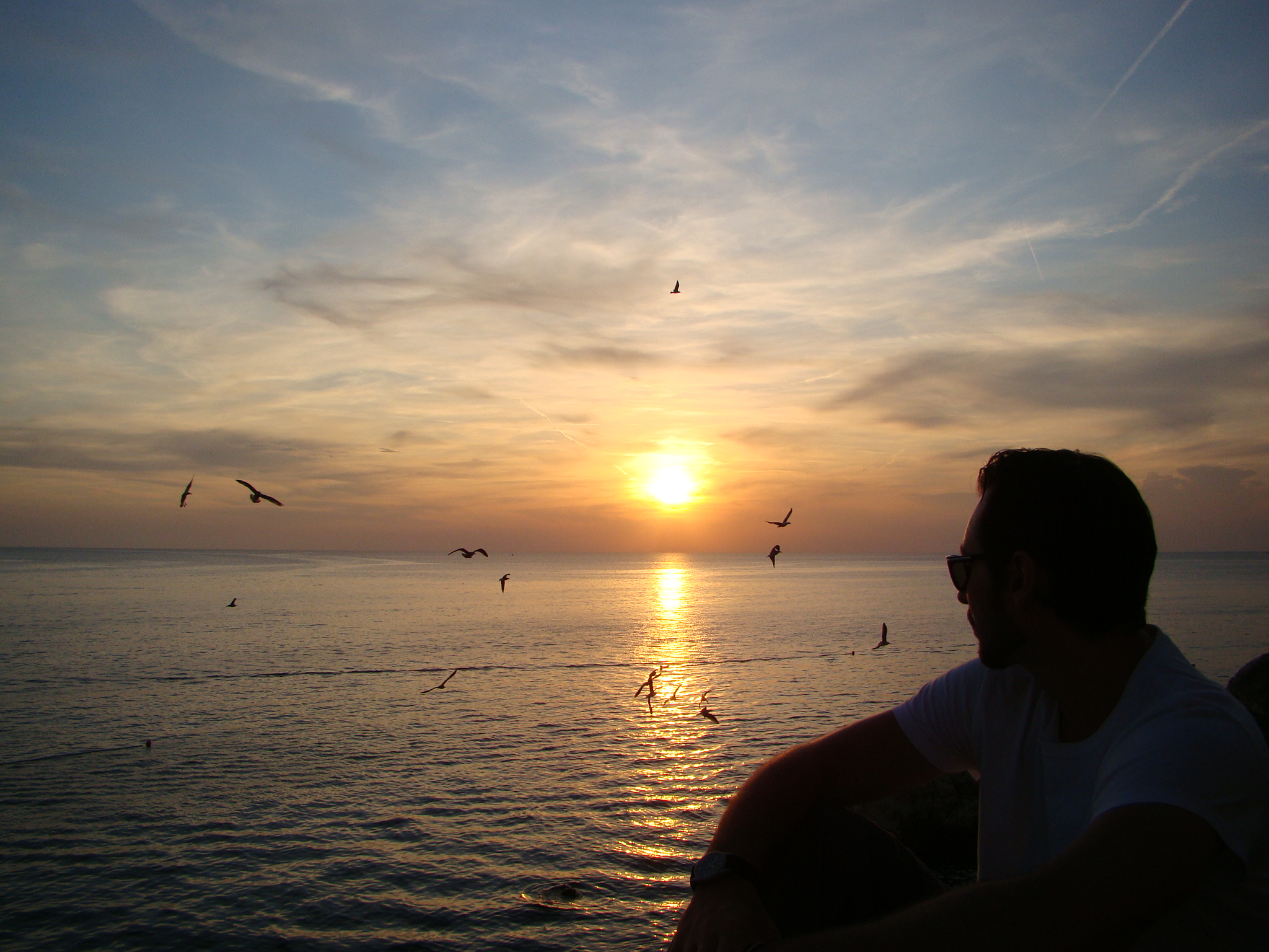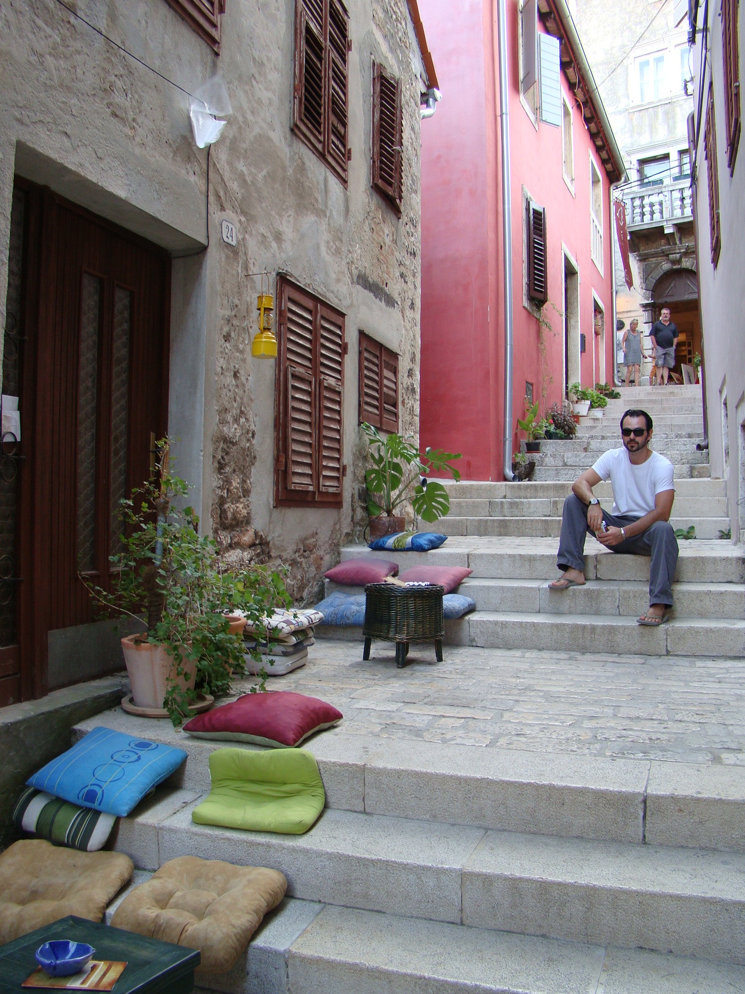 After Pula we made our way back to Rovinj where we took a little beach break for a couple of hours. Then we roamed the streets of the city once again taking in the perfect little town’s splendors. Our first pit-stop was at a winebar, sitting at the sidewalk table observing the passersby and hearing a concoction of languages being spoken (Serbo-Croatian, Italian and German). Down by a waterfront we’d find Vile Joze, our dinner place specializing in local cuisine. We both ordered fish as the main course but it was the appetizer that completely stole the show – grilled squid in the local olive oil with chopped garlic accompanied by a potato spinach side. Un-f’ing-believable! Neither of us could remember the last time we had anything so tasty yet so simple. To wash it all down we went with a bottle of the local Malvazija, a zesty and minerally white wine that’s easy to drink with or without food. There was no room for desert so instead we opted for an after dinner drink at Valentino, an imaginative bar making the best out of the jagged limestone formations that serve as the boundary between the bar and the sea. Soft turquoise colored cushions were sporadically placed on the rock making for front-row seating to the sunset show. Hand in hand we watched the fiery red star give in to the horizon.