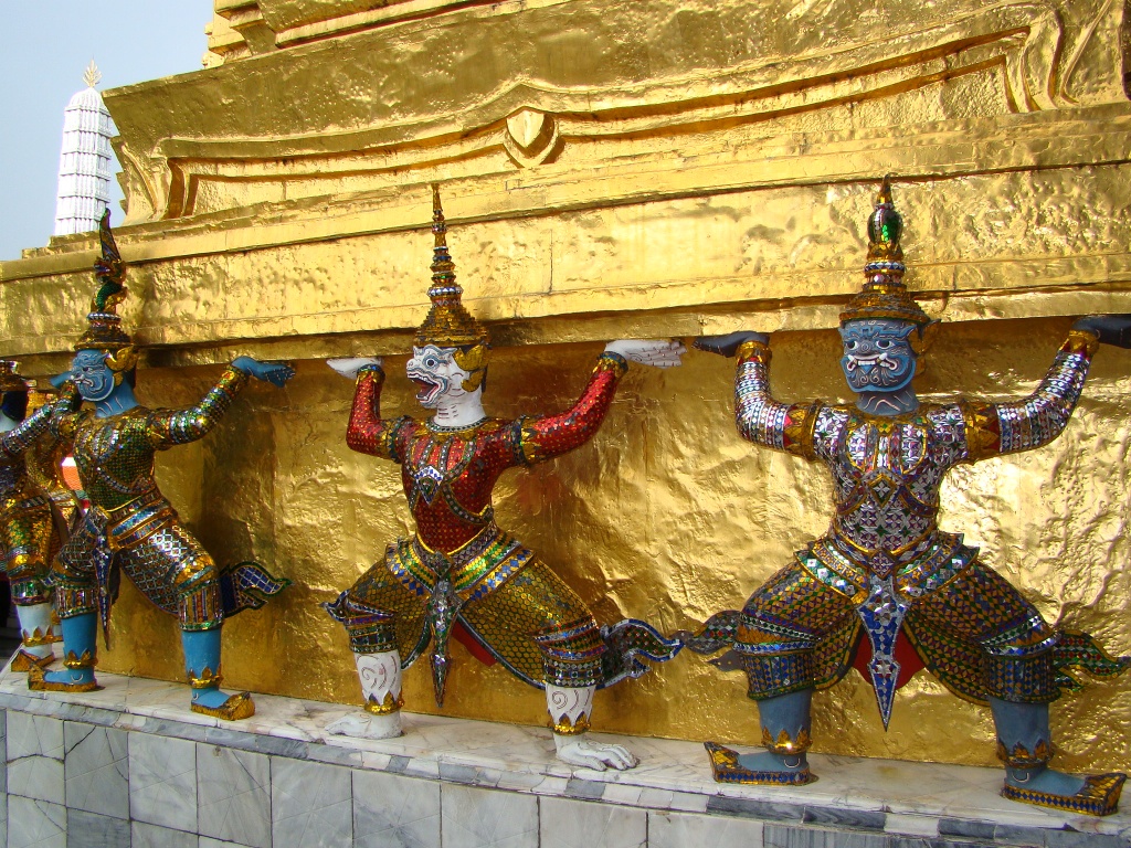 The next day we set out sightseeing and started with the Wat Mahathat, one of the oldest shrines and headquarters for the monastic order of Thailand. Along the way we stumbled upon a series of street vendors of which a couple specialized in numismatics (my kind of crew). Then it was on to the Standing Buddha, a 100-foot tall statue (of Buddha), significant for being a place of homage. From there our tuk tuk weaved through traffic and brought us to Wat Saket/Golden Mount, another Buddhist temple built in during the 18th century – from there we enjoyed views of Bangkok’s expansive layout, a mix of modern sky-rise towers (businesses and hotels), temples and low-rise residential buildings. The next stop on our tuk tuk ride was the Grand Palace, an enormous complex established in 1782 as the royal residences, throne halls and various administrative buildings. Numerous temples, halls, statues and monuments comprised the incredible assortment of richly decorated buildings. Rich as in what appeared to be thousands of decorative tiles or pieces that can truly be appreciated in close proximity. From a distance the appearance was still magnificent but the level of work and craftsmanship becomes intimately evident up close. The vast array of colors also played to my delight. The other significant factor was the inclusion of mythical animals as part of the Buddhist faith – monkeys serving as guardians decked out in traditional warrior gear. Several murals depicted these intrepid warriors in various battle scenes. And then there’s was the Emerald Buddha temple or Wat Phra Kaew. Considered the most sacred Buddhist temple in Thailand, it houses the statue of Emerald Buddha (actually carved out of a single jade stone). It’s symbolic of Buddha’s ascension into Nirvana and no-one is allowed to touch the jade statue except the Thai King who changes Buddha’s outfit three times a year based on the seasons (for good fortune).