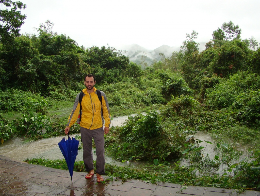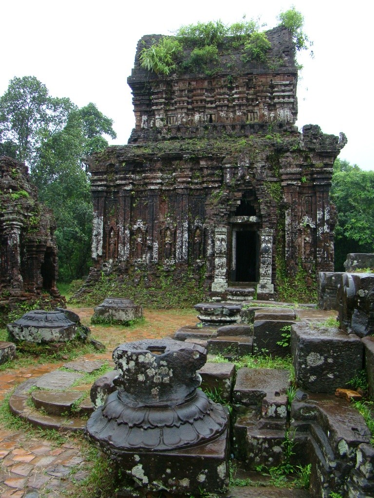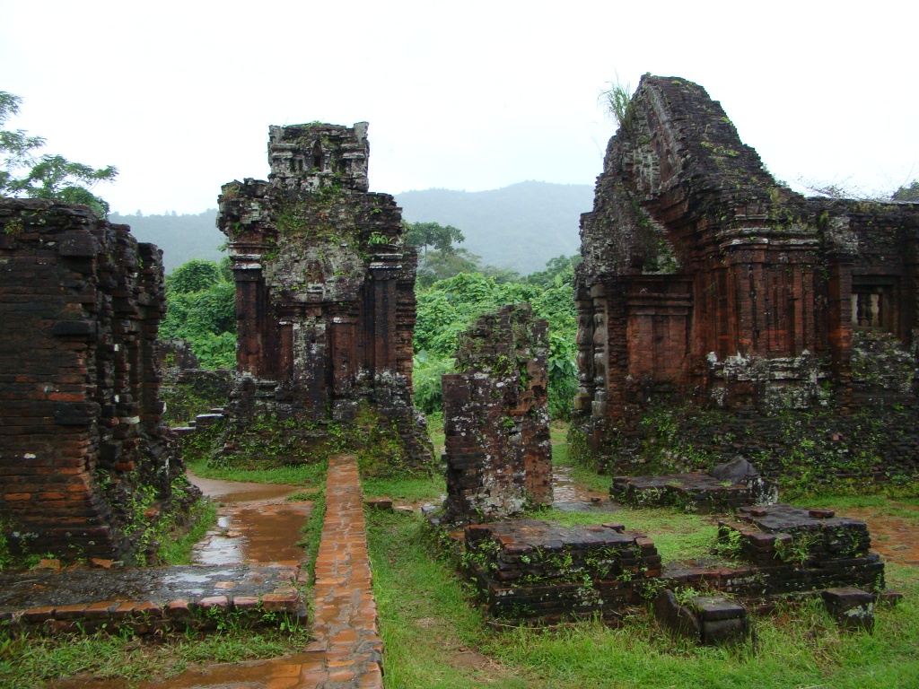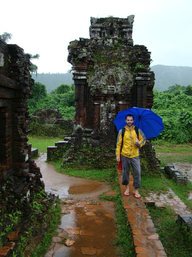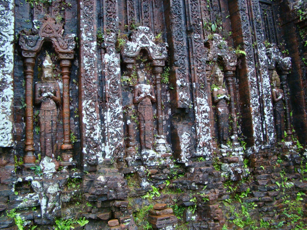 For the next day we had arranged an 8am pick-up (private car), for a trip to My Son to visit the Champa Hindu Temple ruins. Constructed between the 4th – 13th centuries, the temple complex was (and still is), regarded as engineering marvel (as no mortar was utilized). The 1-hour drive through the countryside painted a clear picture of rural life. At times the landscape seemed to stretch indefinitely from rice field to rice field, some occasionally tended to by lonely farmers sporting traditional conical straw hats. Although accompanied by heavy rain for the entire drive, upon our arrival at Champa luckily only light drizzle stayed with us during our visit. Accessible only by footpath, the red brick temples emerged from the misty jungle making for an incredible sight and surrounding. It was one of those “Indiana Jones” moments of uncovering a hidden gem. Still alive today were some of the delicate details adorning the temples – sculptures of various deities, spiritual characters, priests, etc. We had fun identifying them and putting Brigitte’s camera to work.