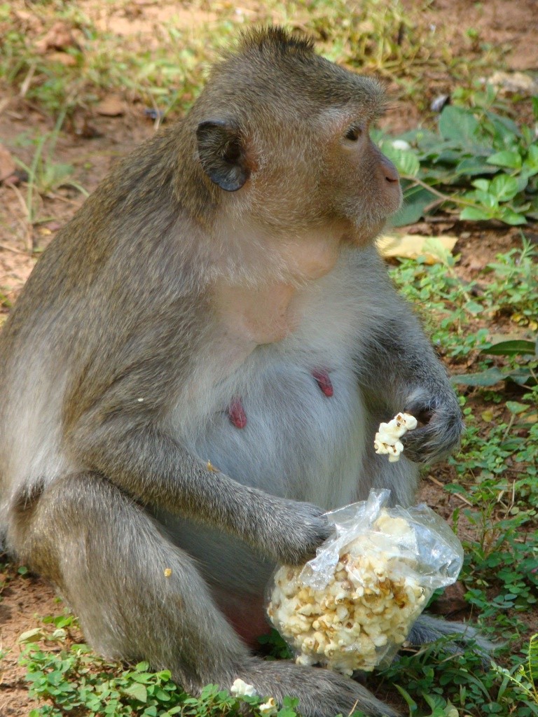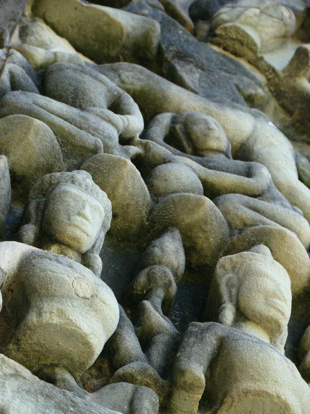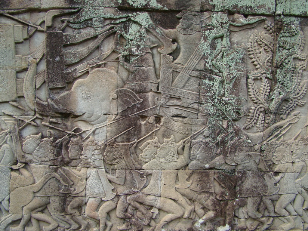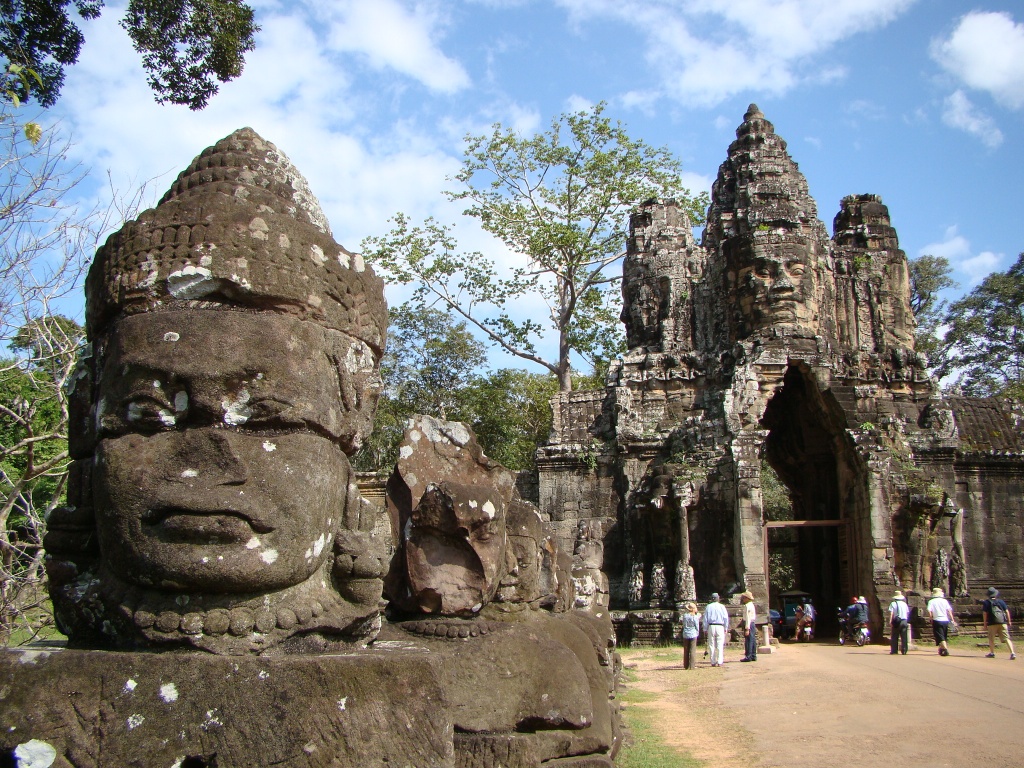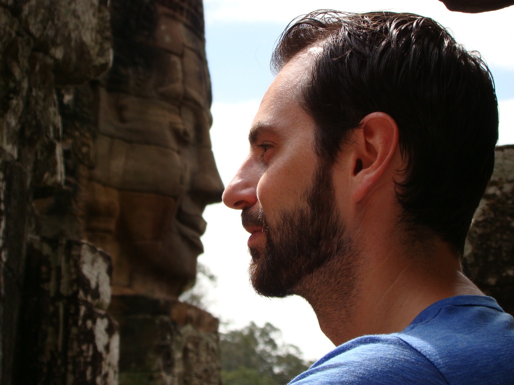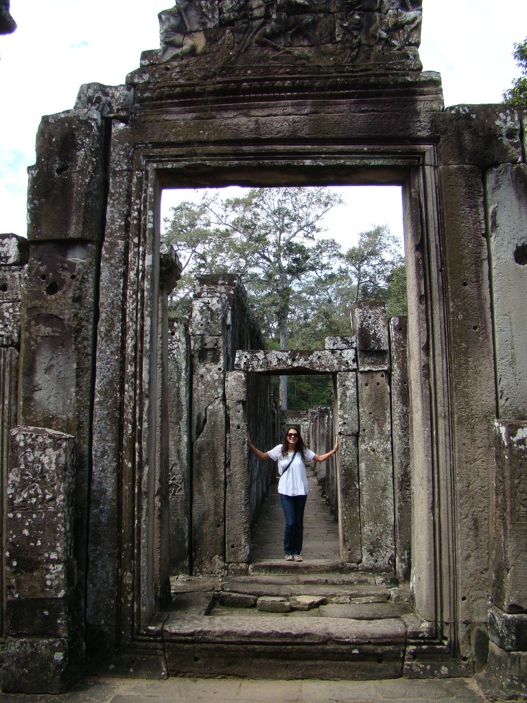 Chameroun (or Mike), picked us up at 8:30am the following morning and we tuk tuk’ed our way to the Angkor complex. Unknown to us was the fact that Angkor Wat is just one of over a thousand temples built by the Khmer Empire during their rule of Southeast Asia between the 9th and 15th centuries (the empire spanned across modern day countries like Thailand, Laos, Myanmar, Malaysia and Vietnam). The descendants of the Khmer people are present day Cambodians and the legacy of the Angkor temples speaks of their glorious past. We also quickly learned that we would be seeing several temples in our 2 day tour, not starting with Angkor Wat. Instead we kicked off with the Angkor Thom complex (meaning “Great City”), which houses the amazing Bayon temple (or Temple of Beaming Faces”), among other galleries and smaller temples. En route we passed by a small colony of roadside hungry yet friendly monkeys and just couldn’t resist – they were too cute. So we stopped and fed them some bananas which they quickly snatched from my hand. Then it was on to the heavily guarded South Gate which offered a sample of what laid ahead. Two rows of warriors or guardians carved from stone lined the road that led up to the elaborate South Gate – a massive head centered in the middle of the gate is said to be symbolic of the Khmer King (Jayavarman VII), who commissioned the “Great City” during the 12th century. Brigitte started her photo session while Mike gave us more historical background on the city and temples. He also told us that Bayon has 51 towers each with 4 faces, the same one we saw on the South Gate. Whether the faces represent the king or Buddha is still debatable between historians and archeologists but undeniably the faces of Bayon made for an awesome sight. Being in the presence of vestiges from such a historic powerhouse of an empire felt empowering, spiritual and jolly! After climbing down from Bayon, we made our way past the Elephant Terrace, a 900 foot long terrace taking its name from the elephant carvings on its walls. According to Mike this is where elephants used to get trained during the days of the Khmer Empire. The impressive terrace also comprised other carvings – lion headed guards (singhas) and mythical bird/man warriors (garudas).