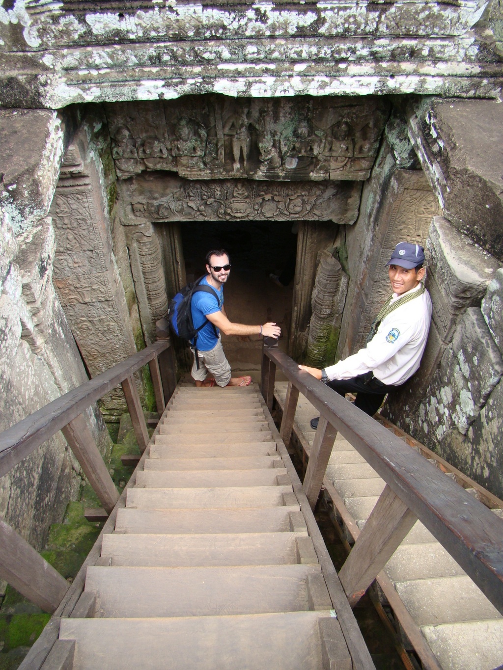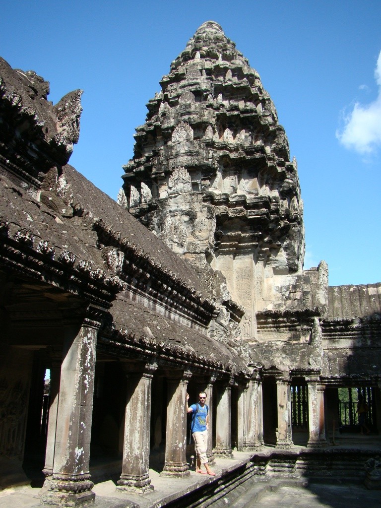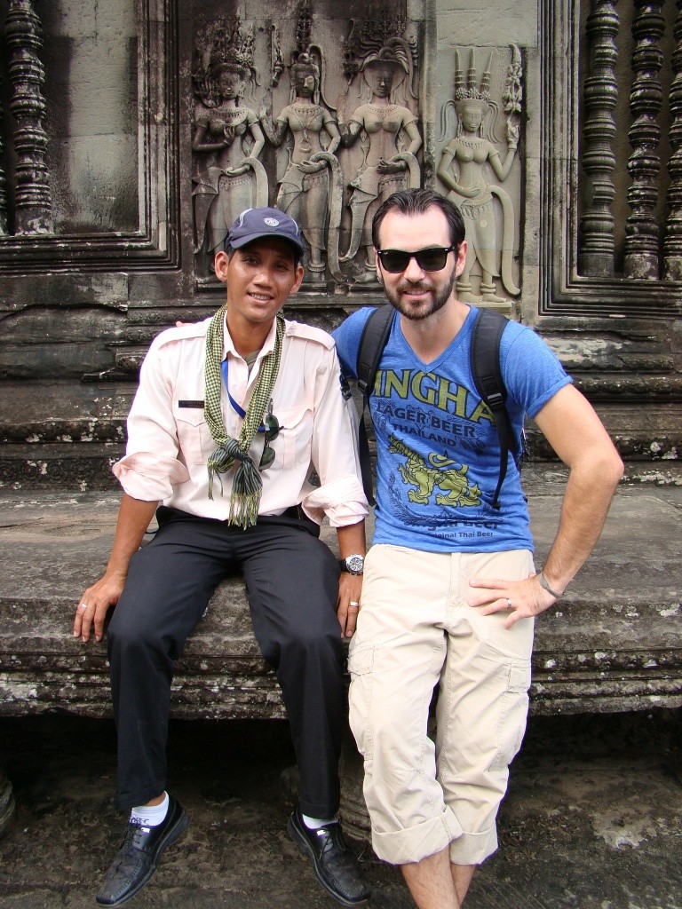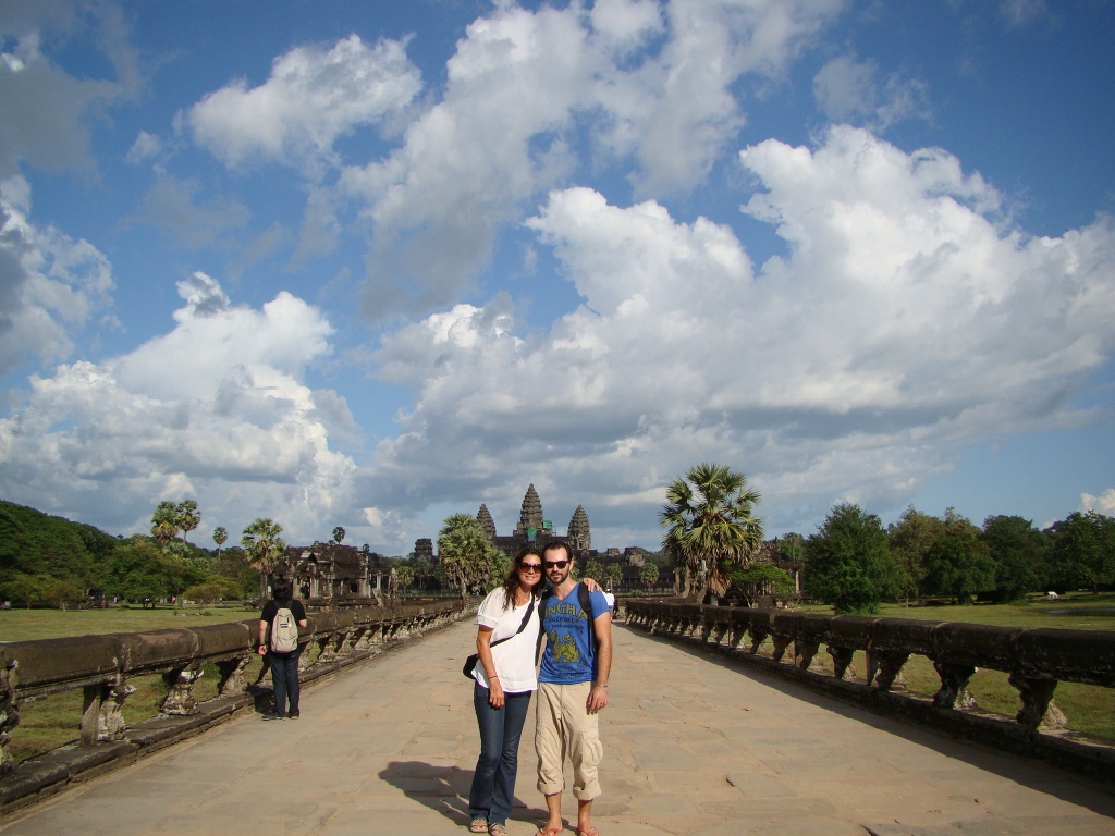 After lunch it was time to finally take on Angkor Wat (or “City Temple”). The ancient Hindu temple was constructed in the 12th century and dedicated to the god Vishnu. However as the Khmers later changed their religion to Buddhism, so the did the tones and accents on Angkor Wat. Today it still remains the largest religious building in the world – very true as it took us close to 3 hours to navigate it. We approached Angkor Wat from the East Gate (the back), which seemed peculiarly quiet with no-one in sight. Were we to have this marvel all to ourselves or was this just a selfish delusion (yup, a delusion it was – by the time we left there were hoards of people everywhere). As we entered the complex Mike dropped more knowledge about Angkor Wat’s architectural style, the meaning of its carvings, its galleries or levels and its westward orientation (not East as is the case with Buddhist temples). The immense structure served up a heaping platter of positive impressions. The raw architecture composed of sandstone and laterite with black and grey hues gave off a sense of antiquity. Close inspection of the erect towers (massive stones laid on top of stones without mortar), amplified the temple’s fortitude integrity. And the delicate polished carvings of Apsara dancers, deities and mythical characters completed Angkor Wat’s trifecta of subliminal multi-dimensionality. Brigitte and I walked up the temple’s highest level and explored the square-shaped grounds. Seeing a couple of young monks up there confirmed the temple’s authentic pulse, as opposed to just serving as an attraction to curious tourists (about 2 million annually). As we further walked about its grounds, Angkor Wat’s appeal seemed to have permanently set into our veins. It’s the kind of place you keep giving looks to over your shoulder as you walk away. For us it meant exactly that plus a return trip early the following morning to watch the sun rise over it. 5:20am and surrounded by hundreds of other camera armed “insomniacs” is what we had got ourselves into – unforgettable in many ways and well worth it!