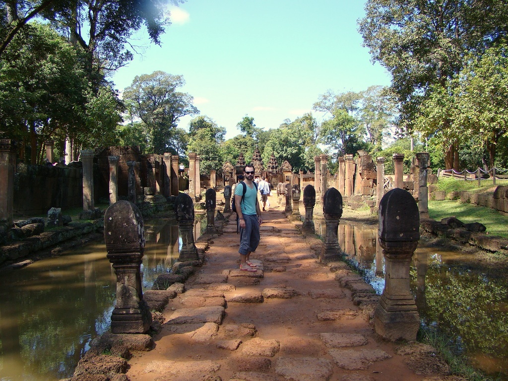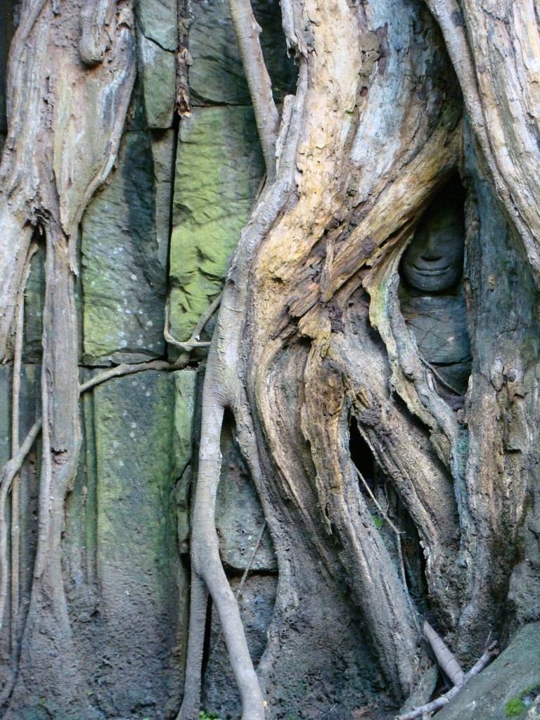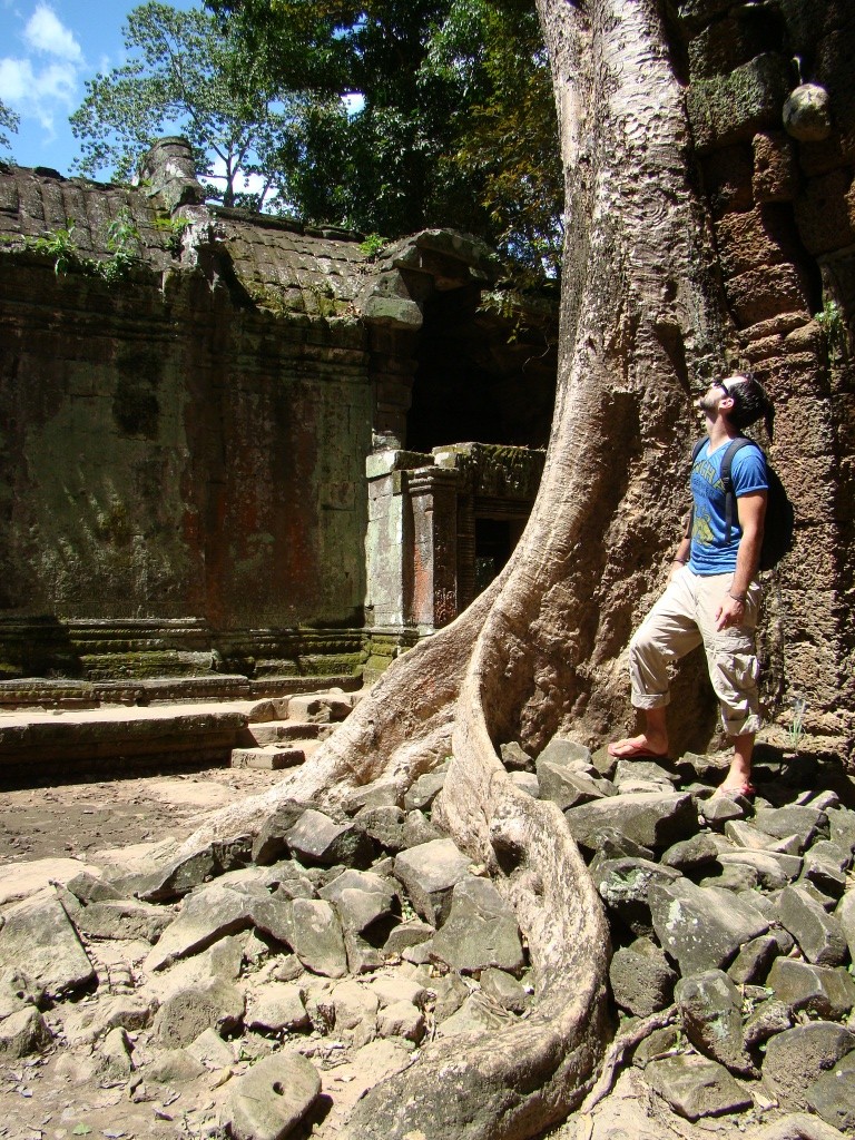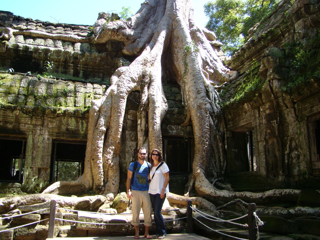 From Bayon we made our way past a couple of other temples (including the beautiful Takeo). Next it was on to Ta Prohm, made famous in the movie Tomb Raider. What’s amazing about most temples is their location. The entire Angkor complex lies on a 390 square mile area densely covered by forests (with intermittent pools, moats and rivulets), making for a magical setting. Going from one temple to another typically meant covering anywhere between one to several miles (which is why the tuk tuk came in very handy). Although on most occasions we had to walk from the tuk tuk through parts of the forest in order to access some temples. This was the case with the picturesque Ta Prohm, as we made our way by lush green vegetation and across a small body of water left over from the past week’s heavy rain. And then smack in front of us was Ta Prohm; the temple that seems to coexist with the silk cotton trees whose roots virtually grow on, through, and from various parts of the temple itself. What an amazing yet bewildering sight!