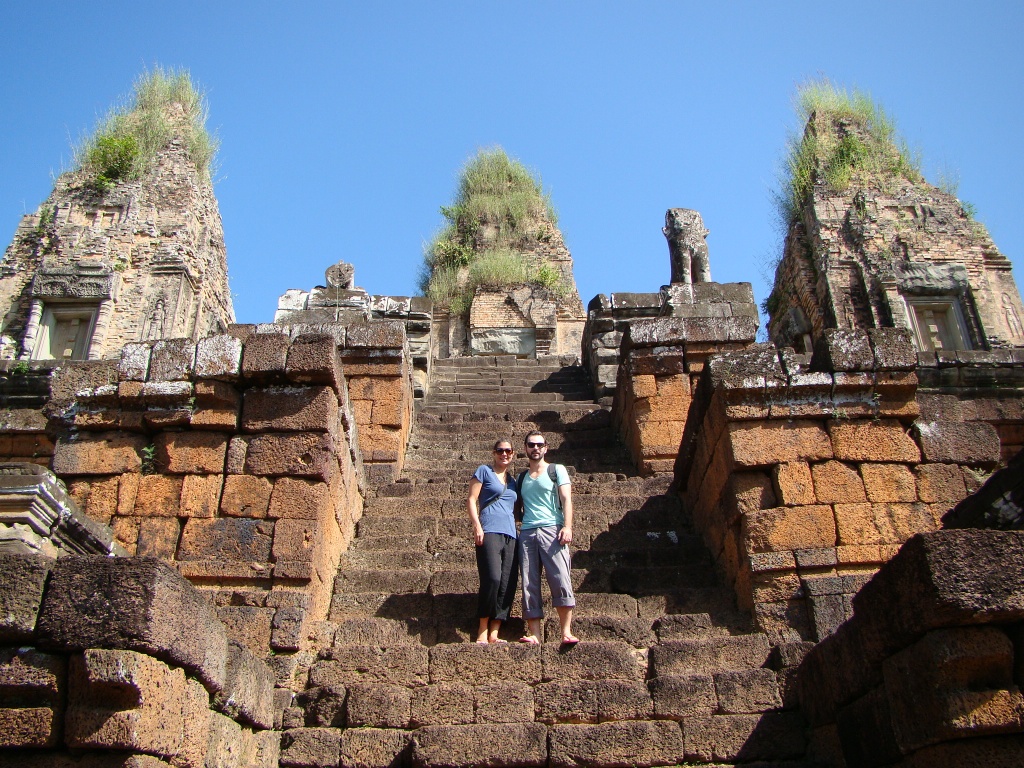 Then as we diverted onto a dirt road we had finally made it to the Pre Rup temple. The fiery red-brick pyramid-like structure jumped at us with moss or weeds covered towers. Although smaller than the temples we saw the day before, there was something unique about Pre Rup. Perhaps the combination of brick and laterite as the main components, or its super steep steps which we bravely climbed. The vibe of this temple was also singular, maybe due to the believed funerals that occurred here. Pre Rup means “turn the body” and Cambodian belief has it that the ashes of bodies were routinely rotated in different directions as part of the burial processions. Mike had pointed to a rectangular coffin like brick tub which was where bodies and ashes became one.
