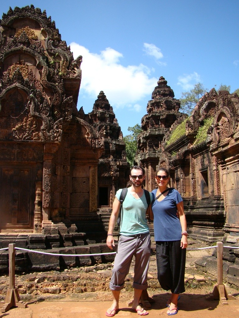 Next was Banteay Srei or “Lady Temple”. It was similar to Pre Rup in its reddish color but that’s where the parallels ceased. Banteay Srei had one level only (ground level). As we approached it Mike stopped right in front of its gate and informed us about the elaborate carvings of Hindu deities (Shiva and Vishnu), depicted throughout the temple. The legends were animated as were some of the temple’s accents – the steadfast guardian monkeys and garudas on all four sides of temple’s center. But one of our favorite features were the picture frame windows, architecturally and artistically endowed. We had fun putting on some of our best poses while Mike snapped a few shots. The gentile Banteay Srei was yet another temple of impressive magnitude that totally wow’ed us.