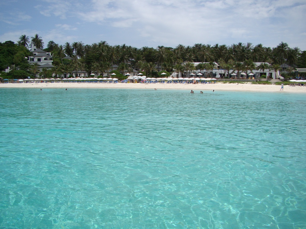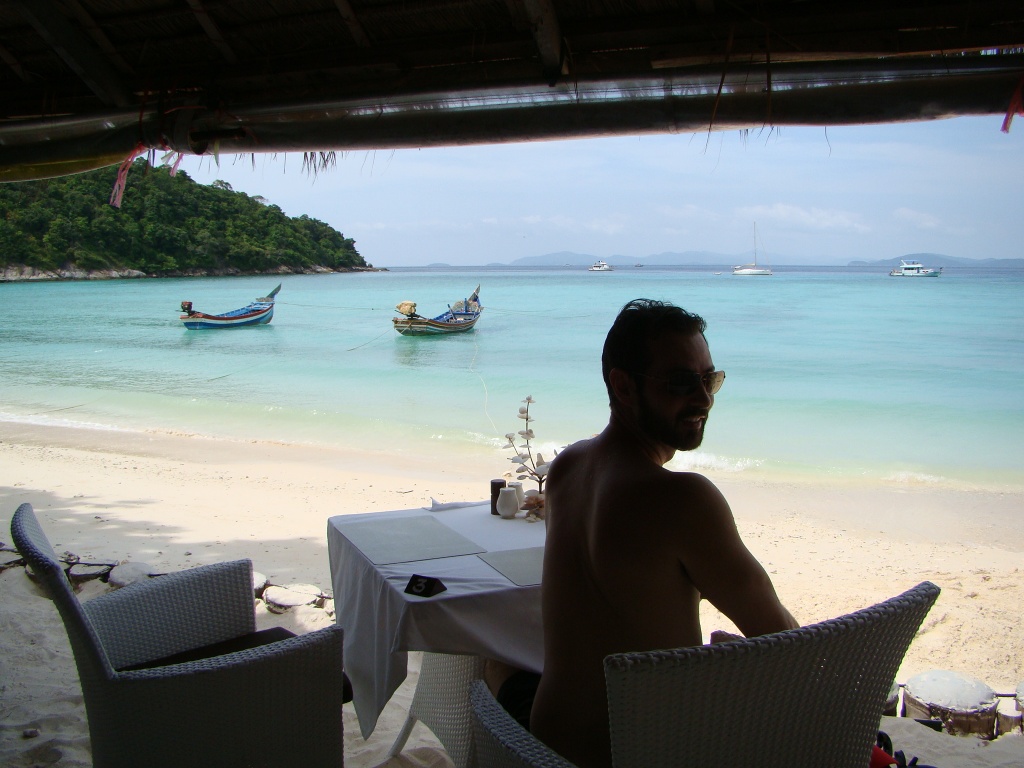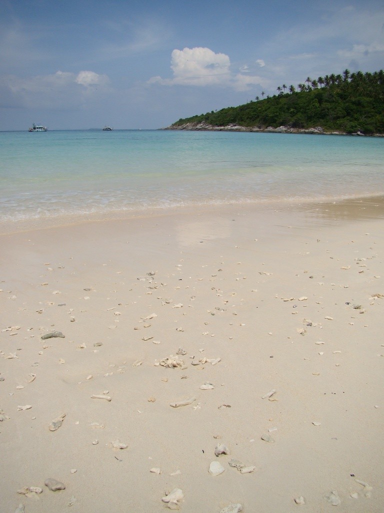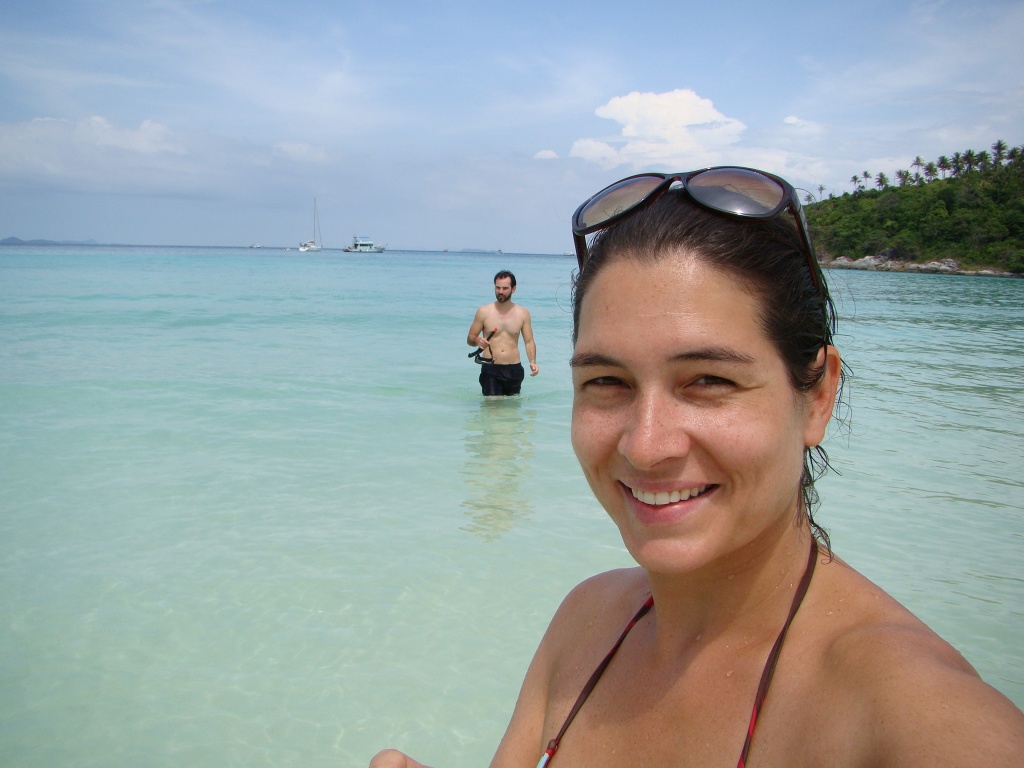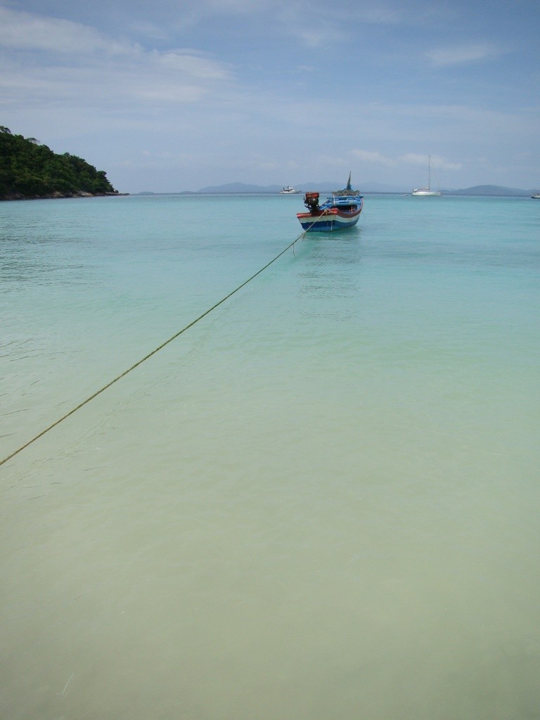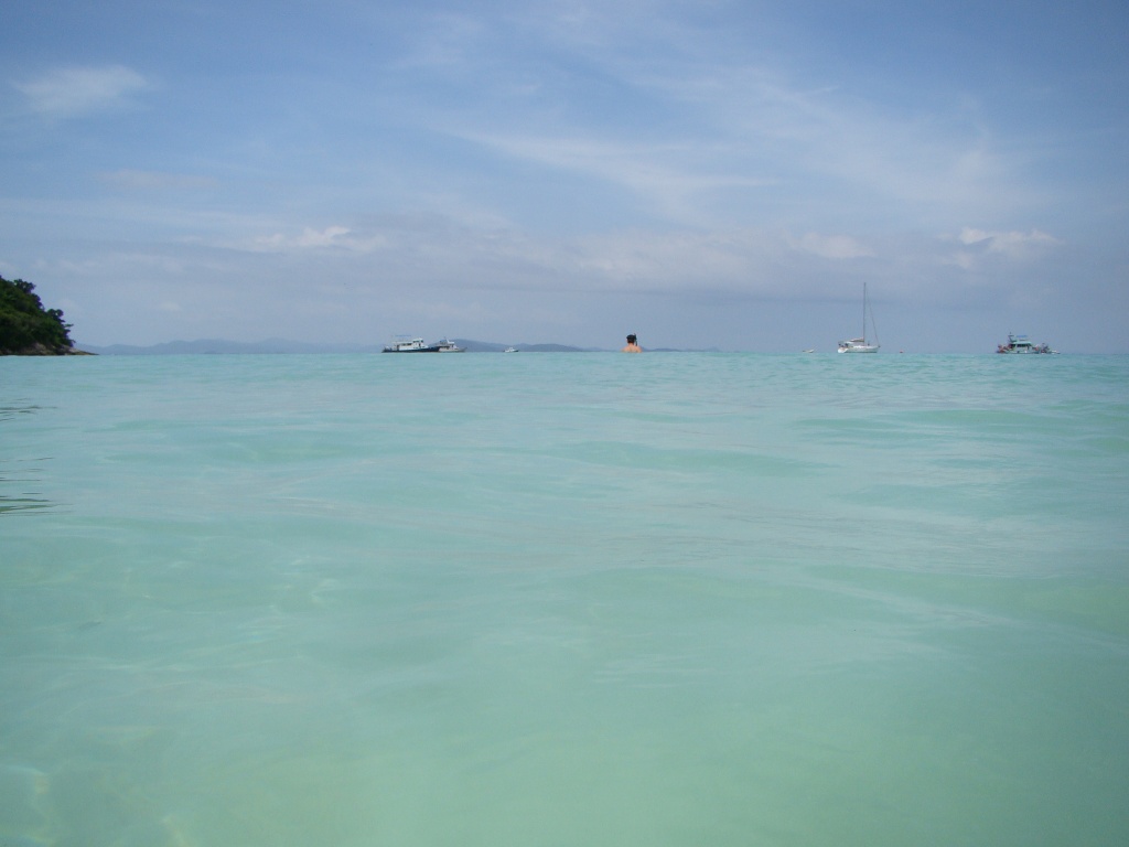 We spent 3 days on hyper touristy Phuket Island taking advantage of the beaches. As with all other parts of Thailand we visited, Phuket was also littered with superfluous souvenir shops which we steered clear of despite unrelenting solicitation (on top of that prices were at least double – if not triple – from what we saw in Bangkok). Our hotel was near Kata Beach which lies nestled between the more “happening” Karon Beach and the quieter Kata Noi Beach. On our first day we checked out Kata Beach although the weather had been a bit overcast. The water was very warm but clouds derailed our ambition of capturing the beach’s natural beauty on film. And so we had to wait until the following day. On day two, we took an organized day trip to Raya Island, one of the nearby attractions accessible by boat. Ours was a speedboat which at times slammed its way over the choppy waters causing a couple of people to give in to their twisted stomachs. Luckily Brigitte and I sat on the bow of the boat so we didn’t even get wind of it until much later! It took about 45 minutes to reach Raya which closed in on us with its white sandy beaches and lush green tropical forests. There were several other boats there discarding their human loads but the beach seemed big enough for all and everyone seemed happy. The water glowed with bright greenish hues close to shore and grew darker in the distance. We couldn’t wait to jump in!