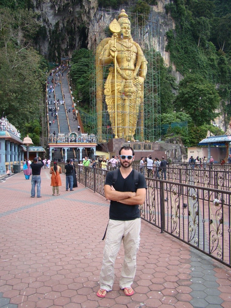 On day 3 we set up a couple dates with altitude. In the morning we paid a visit to the Batu Caves just in the outskirts of KL. The caves which naturally formed hundreds of millions of years ago, serve today as one of the most important Hindu shires outside of India. The cave complex is situated about 300+ feet above ground level and so we climbed 272 steep steps in order to access them. Dozens of other visitors and worshipers were also making their way up and down the steps but with caution as gangs of macaque monkeys paraded all around in search of anything edible. Some people exhibited a certain level of fear while others handed bananas over to them. Brigitte snapped a few photos adding to our monkey collection. The limestone caves were impressive and several colorful shines depicting Hindu deities occupied them. It felt like a powerful place of worship.