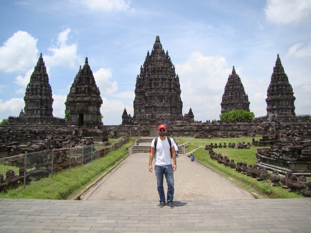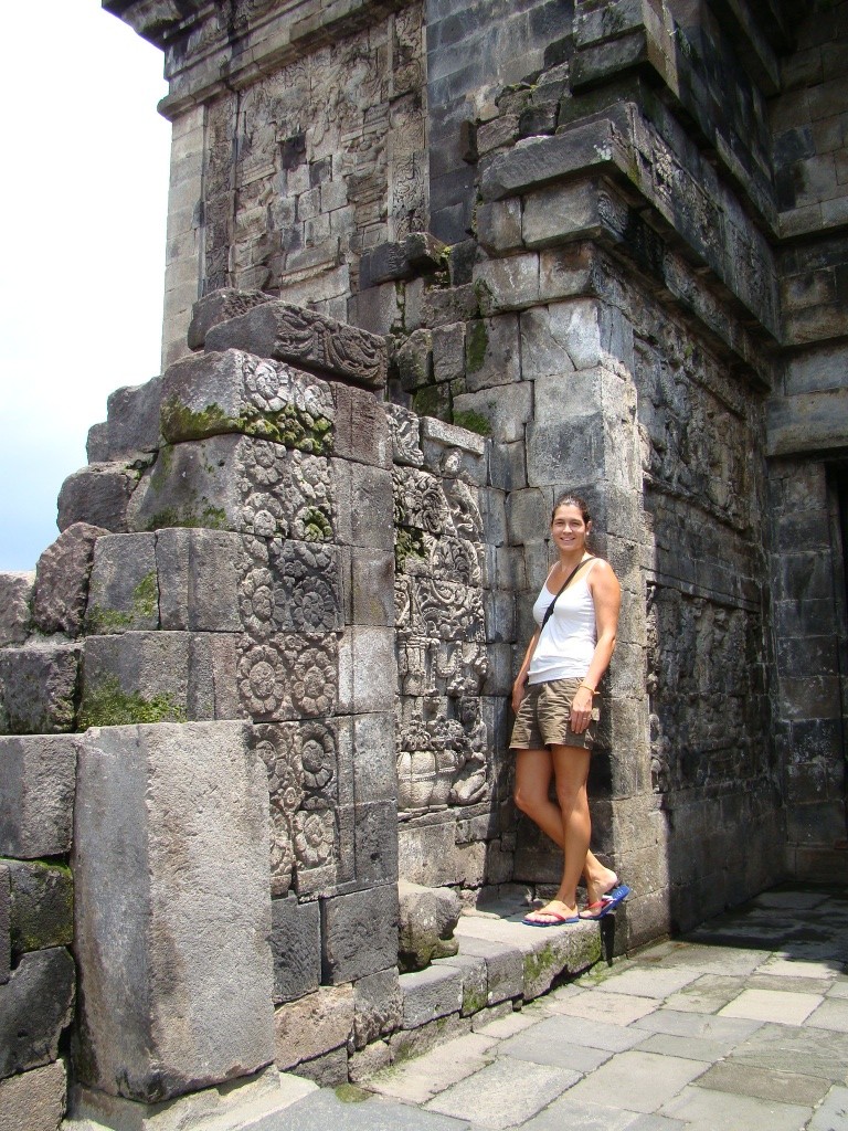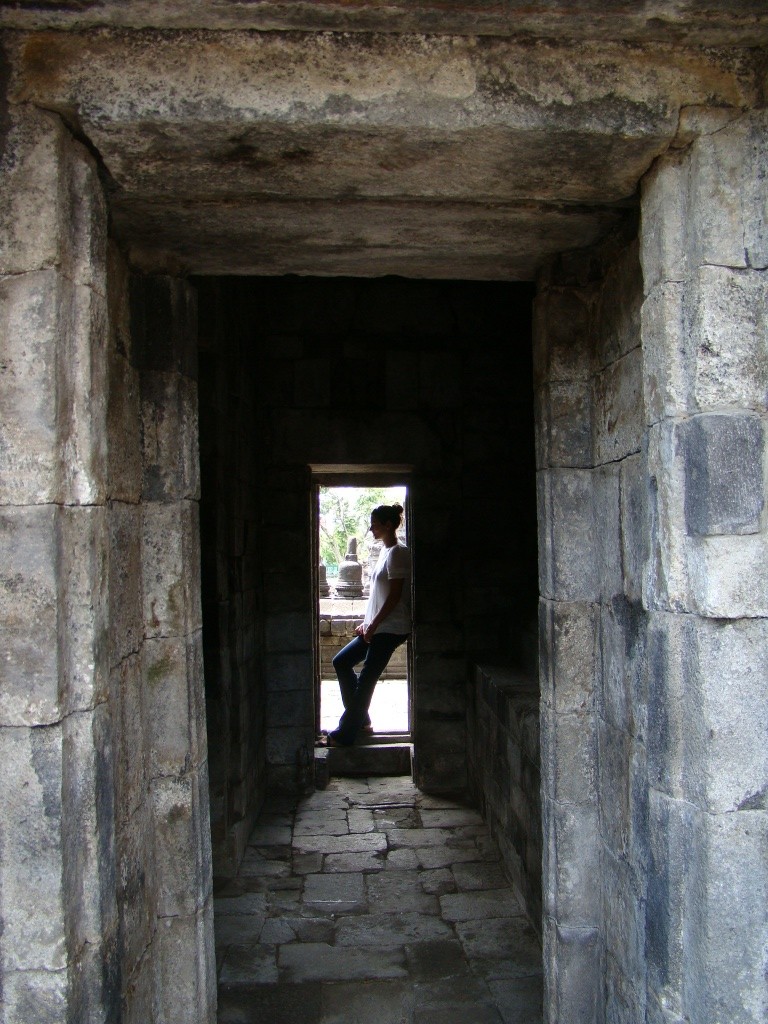 The next morning we made our way to the airport heading for our much acclaimed next destination, Bali. But there was one last stop to make near Yogyakarta and that was the Hindu temple complex of Prambanan. Hinduism has been prevalent throughout Indonesia for centuries and Prambanan is a testament to its impact on Javanese life. The 8th century temple complex is comprised of 3 prominent towers with the middle one standing 47 meters tall in dedication to the god Shiva. Elaborate reliefs decorated the lower levels of all 3 towers depicting various gods, animals and scenes from everyday life. Like Borobudur the Prambanan complex was constructed from andesite stone without use of any adhesive. The dark stones impressively stood out against the bright blue sky amplifying our photo effects. About half mile away sat another impressively beautiful yet unique temple. Sewu, the second largest Buddhist temple in Indonesia, appeared in front of us and best of all there was no-one else in sight. We selfishly relished at having it all to ourselves (for about 20 minutes), daring for a second to feel as though we had “rediscovered” it. Sewu’s towers were topped with bell-shaped stupas reminiscent of Borobudur.