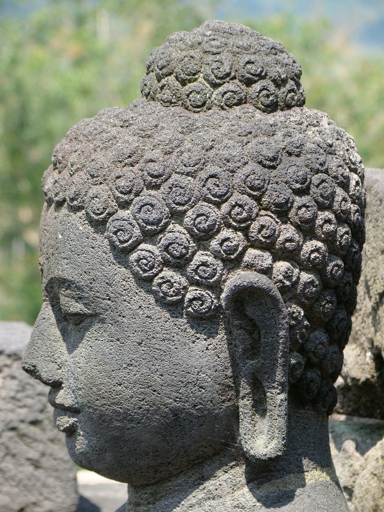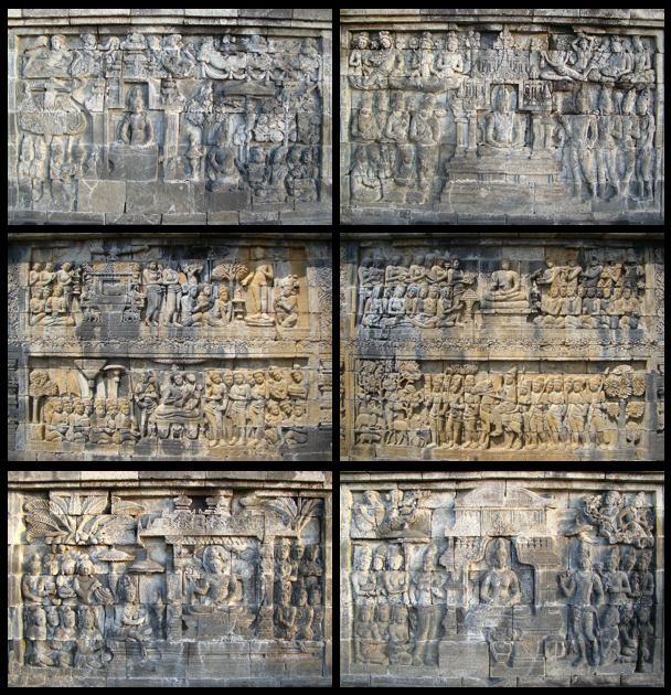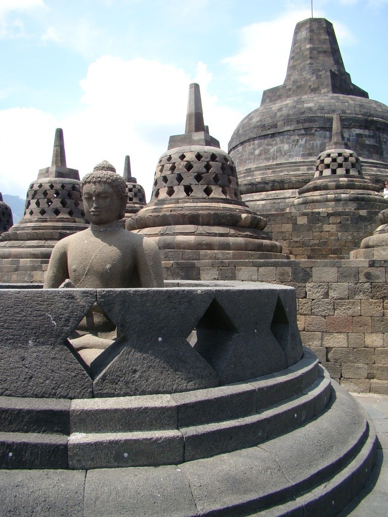 November is the official beginning of Indonesia’s rainy season and downpour is expected pretty much every day. As a result the humidity can be unrelenting and with temperatures in the 90s, Borobudur proved to be one hot affair. We made it to the temple by 9am and the imposing weight of the humidity kicked in overdrive. But so did the magic of Borobudur, the several layers of architectural stone design adorned with reliefs depicting the life of Buddha (on the bottom layers), statues and stupas (on the top layers). There are 72 bell-shaped stupas – one of Borobudur’s defining characteristics – each cocooning a statue of Buddha. The grand stupa (much larger than the other 72), sits at the center of the top layer however there is nothing inside. We explored each level of Borobudur in true pilgrim fashion – entering through the Eastern gate – making our way clockwise around each level and then ascending to the top. Brigitte snapped dozens of pictures of the reliefs with intensity – I see a collage in the making. Upon reaching the top levels the belled stupas started to fascinate us. Why 72? Why the bell shape? Why the circular formation? And why is there a Buddha inside each except for the grand stupa? Answers to some of these questions may remain a mystery as is the origin of the temple’s name itself.