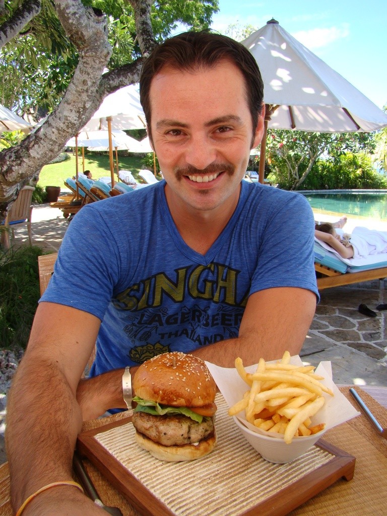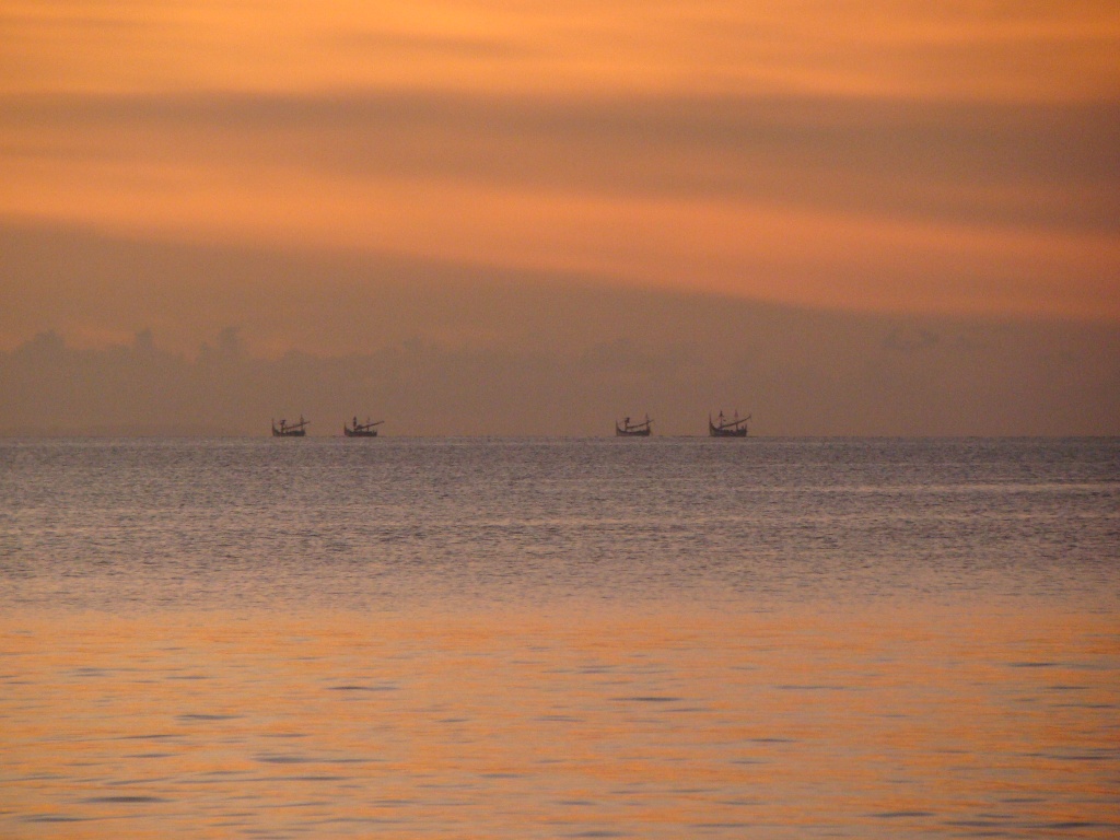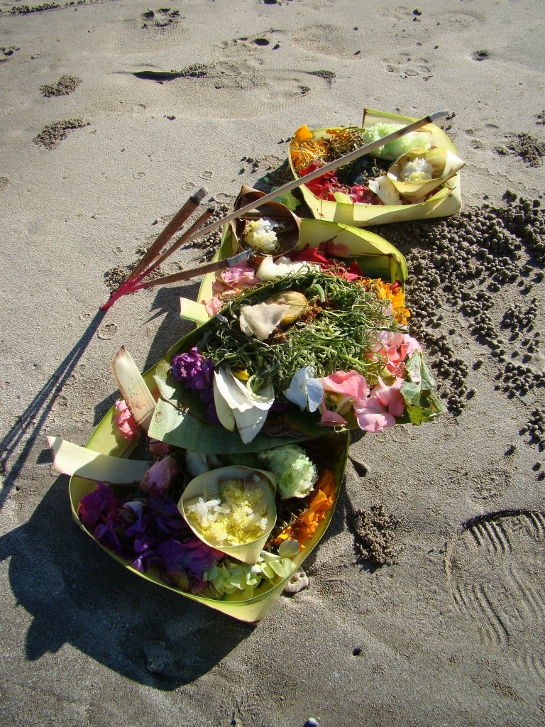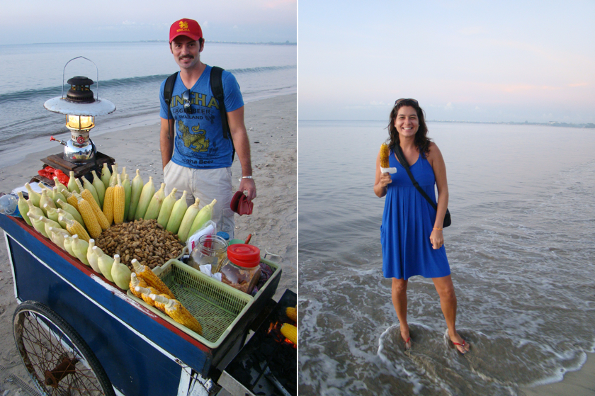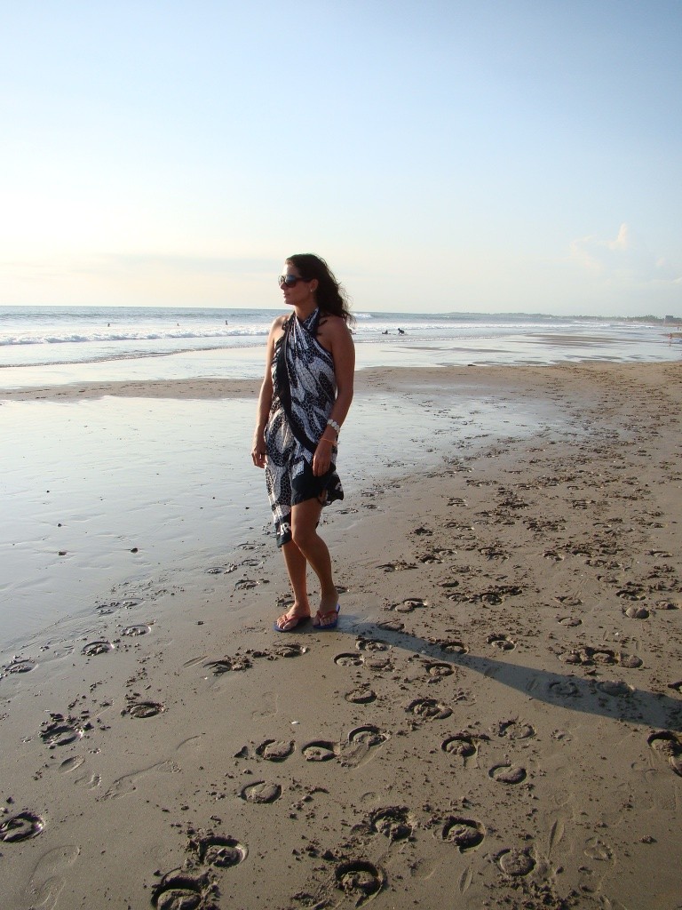 Another day meant another beach, this time it was Jimbaran. Armed with a gift certificate to the Four Seasons Hotel (wedding gift courtesy of Tarek – merci encore!), we hopped in a “taksi” and made our way over for lunch. The impeccably manicured cliff grounds overlooking the bay were stunning. Also impeccable was our lunch, Brigitte’s double salad order and my chicken burger were simply delicious. Not to mention the refreshing glasses of Viognier and Riesling that accompanied our meal. We voraciously imbibed as much of the scenery as possible knowing it was to be ephemeral. But we did get a good sense of how “the other half” lives. At one point we noticed a waiter wiping clean the sunglasses of a patron at the table next to us. Unnecessary and somewhat slave-like in my mind but I suppose when you spend $800 (or more), a night that’s just a common courtesy. The Four Seasons actually didn’t have its own beach but right next door sat the clean whitish sands of Jimbaran beach. We rented 2 beach chairs and lazed about for the entire afternoon and into the evening. It was hot, very hot and the frequent dips in the Indian Ocean helped us cope. Jimbaran offers great sunset views and it’s also littered with beachfront restaurants dishing out local sea fare. After sunset we made our way up the beach for about a mile and a half and settled on a beachfront table at one of the numerous places. The fish was delish!