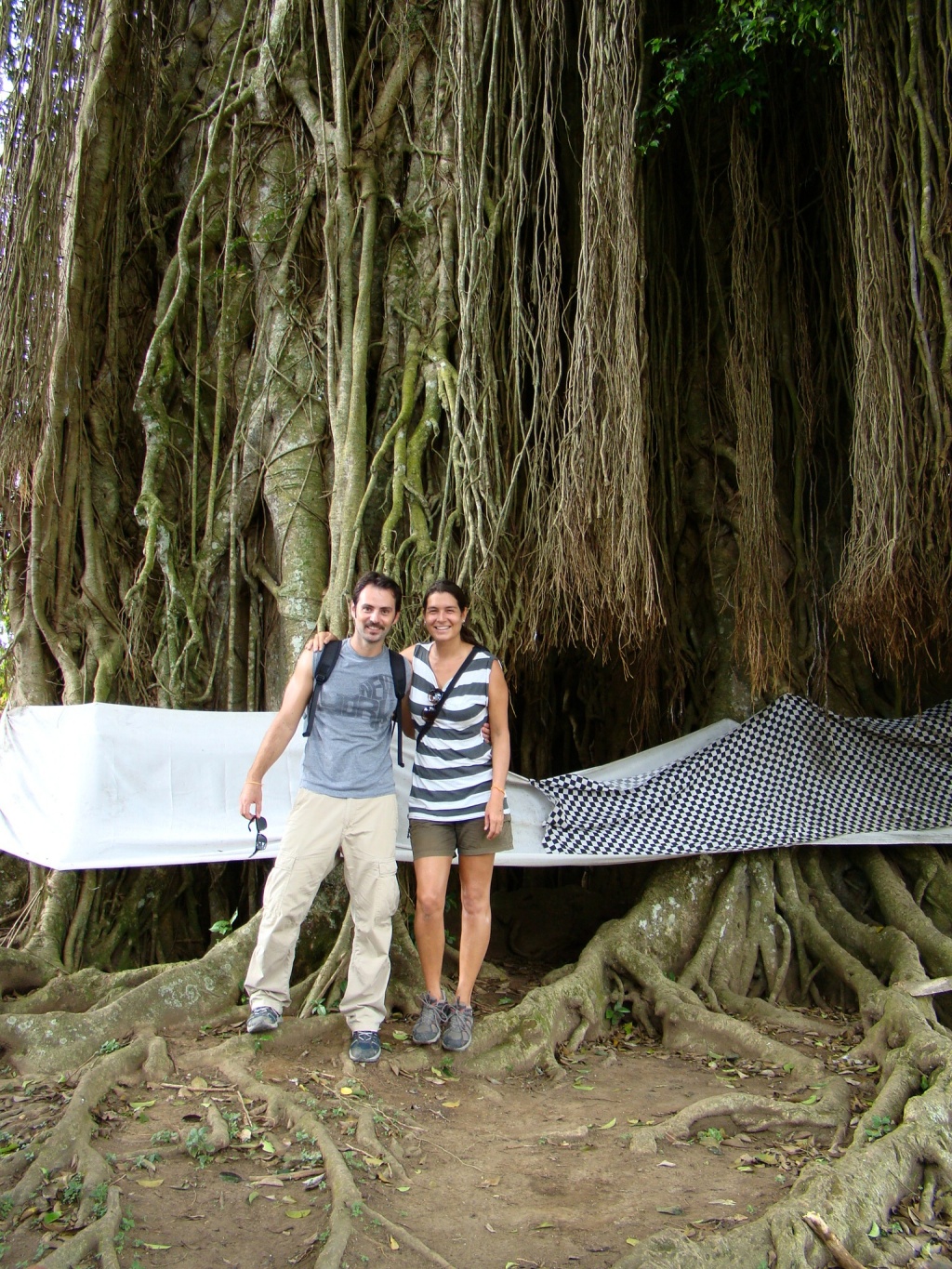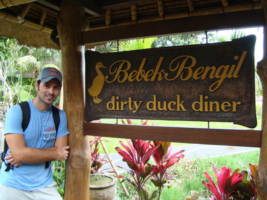 Making the transition to Bali’s countryside was seamless. After 3 days of lounging on the beach, we headed northeast for the town of Ubud (or Bali’s cultural epicenter). Located in the middle of the island of Bali, Ubud is surrounded by incredibly lush tropical vegetation and continuous rice fields. It’s home to 30,000 people and is renown for several things among them: woodcarving and sculpting, a vast array of shops and an incredibly eclectic food scene as we found out. It’s the kind of place that – at first sight – emanates a warm welcoming feel, a country escape that inspires dreams. Also dreamy was  the view from our hotel room at Tegal Sari (a wedding gift courtesy of Izabel and David – thanks again guys!), which faced a patch of beautiful rice fields accented by a few palm trees. Each day we’d find ourselves fixated on the fields at times tended to by one or two lonely farmers. But even more memorable were the gangs of ducks that spent their entire day in the water rich fields. Every evening about a half an hour before sunset they would line up single file and walk back into their communal cage (where they spent the night). It was a simple yet amazing ritual leaving us to wonder what triggered their single-file formation and how they knew when it was time to return “home”. Brigitte found this episode to be very cute and captured it in pictures for her niece. But the thought that came to my mind was that finally we bore witness to the meaning of “getting one’s ducks in a row”.