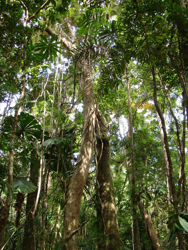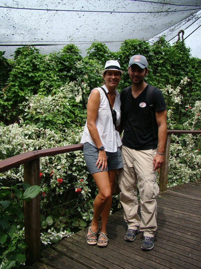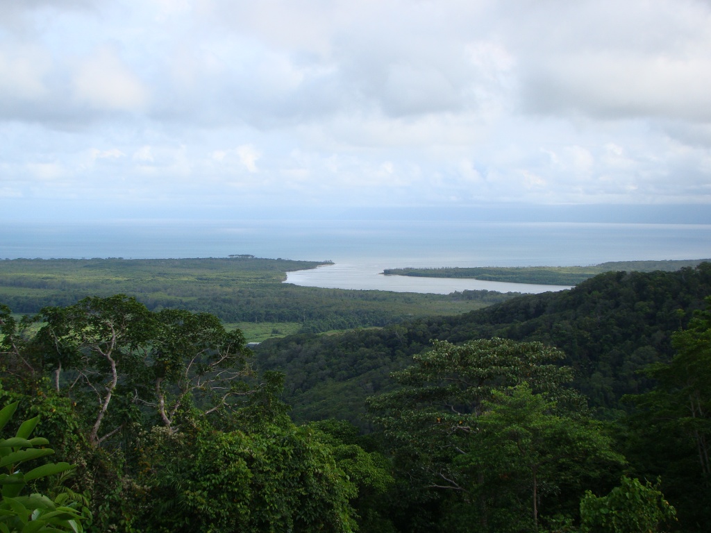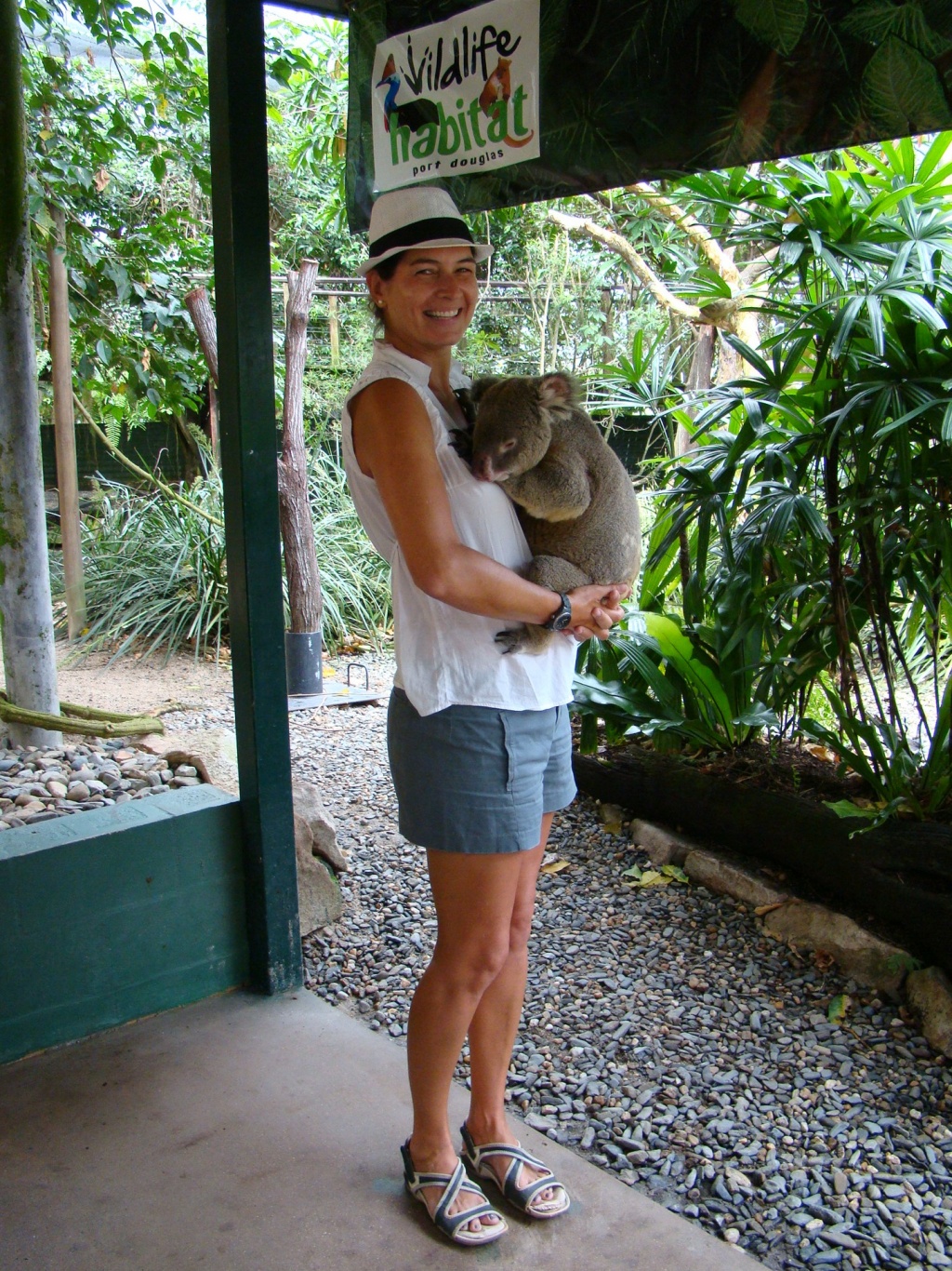 The next day would see us embark on our rain forest adventures up the coast in northern Queensland (in the Daintree Rainforest at Cape Tribulation). We had signed up for multi-day tour and the ride up the coast was magnificent. Our driver & guide (Frazer – a real cool, funny and knowledgeable guy), stopped frequently so we could take in the scenic views – tropical mountainous terrain on the left and long stretches of white sand beaches and blue sea to the right. So enticing but unfortunately  deadly in the summer months (Dec – Mar). Stinger season is in full effect as box jellyfish introduce themselves into the waterways in early December – one sting can kill. Frazer’s advice was simple “stay out of the water” even if jellyfish nets are up. And if the jellyfish don’t get you, then maybe the “salties” or saltwater crocodiles will. Not to mention sea snakes and all the other potentially harmful creatures Australia has to offer. Staying alive in this country suddenly became something to really think about. After hearing so much about crocs and snakes it was finally time to see a few, plus kangaroos, wallabies, koalas and other more endearing animals. Our next stop was Port Douglas’ Wildlife Habitat. Brigitte was immediately infatuated with Glenn the koala bear and had her picture taken with the sleepy/cuddly furball, while I played nice with a water python and had my Kodak moment as well. We also got to touch a 3-year old saltwater baby crocodile (with its mouth taped shut of course).  From there it was on to the kangaroos and wallabies which we fed directly from our hand while trying to fend off dozens of hungry ducks. It’s amazing what animals will do for food.. as we fed a little wallaby a couple of ducks insidiously pecked at him causing him to drops his food so they could snatch it. In Indonesia we found ducks to be cute but here they proved malicious. Next we checked out the tree kangaroos, an interesting and rare to be found animal outside its natural habitat. And then finally came the birds – parrots, pigeons, black swans, more ducks as well as flightless birds like the emu and cassowary. The cassowary, an emu-like bird was a first for us. It’s actually native to Queensland Australia and like box jelly fish, sharks and crocs, it too has killed people.
