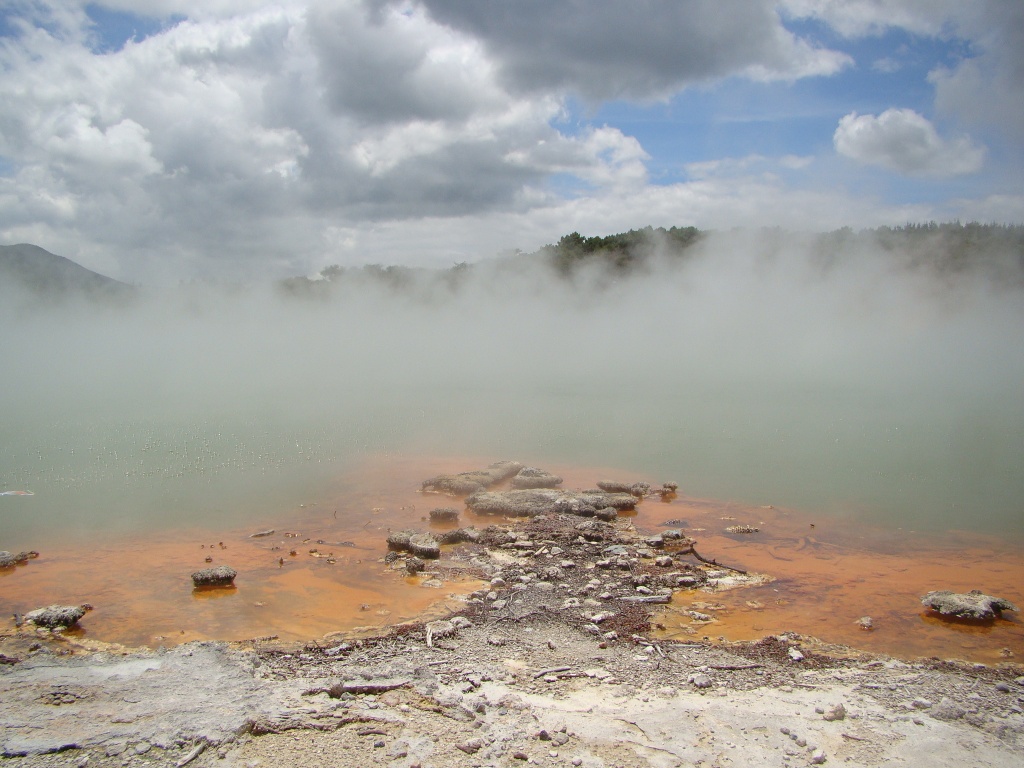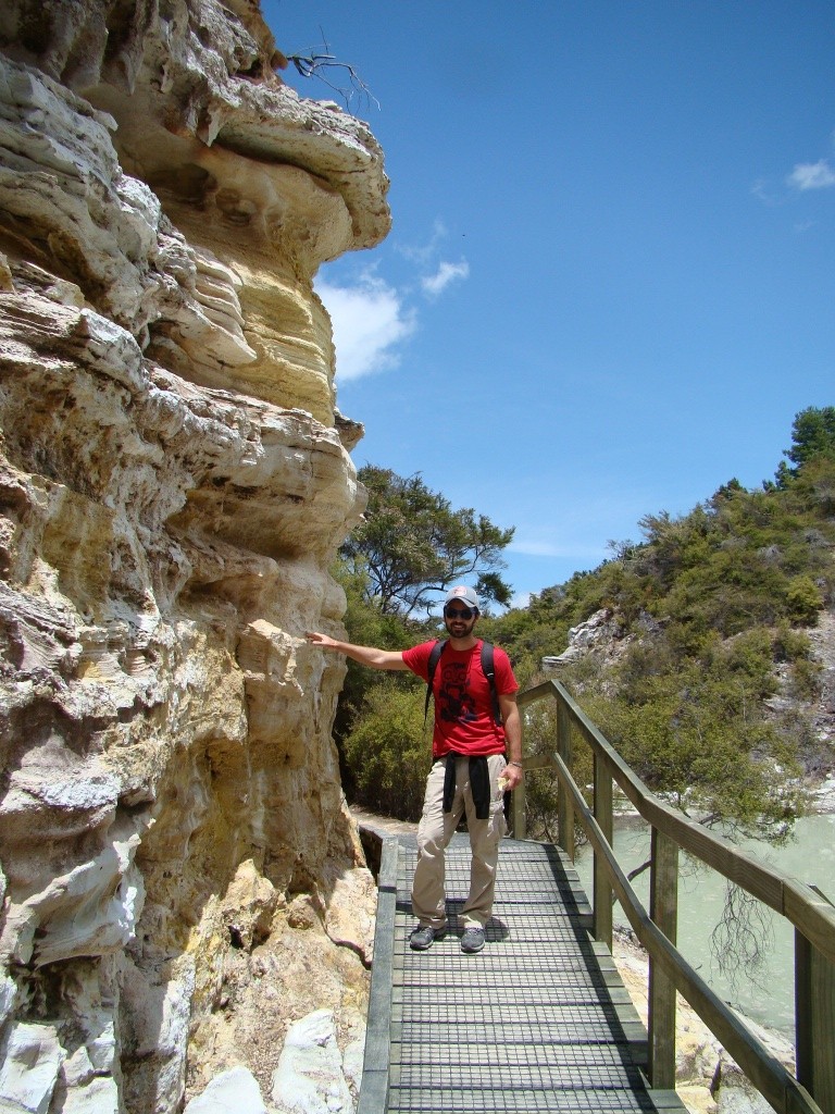 The next morning we made our way to the Wai-O-Tapu “Thermal Wonderland” in nearby Rotorua. This is a fragile area that’s covered with craters, sulfuric pools and bubbling boiling water that formed over a period of hundreds of years. On the eyes, the landscape was grey, rugged and steamy. On the nose it was unpleasant but we had no choice other than just deal with it. Overall it was interesting to see so much raw activity and smell it. One of our favorite spots was the “Champagne Pool”, a very large steaming green sulfuric pool that appeared bright orange at its rim. The other notable pool was the “Devil’s Cave” with its un-natural highlighter yellow color.
