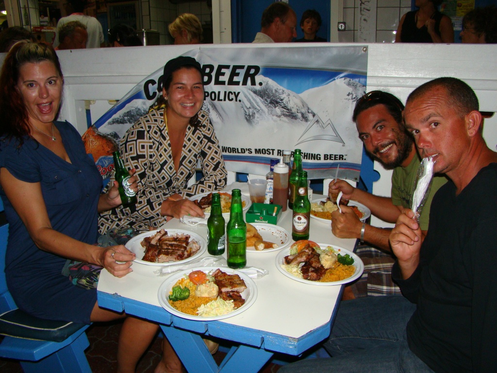 St. Martin is special to us. We started going down in February of 2010, soon after our friends Jenn and Mark relocated there. The first time we visited them in the town of Grand Case we fell in love with the island’s mellow vibe and the pristine beaches and waters. It also happened to be Mardi Gras on the night we landed which gave us a taste of Grand Case’s robust cultural flavor. There was plenty of revelry pouring down the main street with flashy costumes while drums and whistles lit up the scene. Locals and tourists flocked into the heart of town and watched as the parade unfolded. I’ll never forget our dinner at Sky’s the Limit that night (a “Lolo” place – locally owned and locally operated), where the “Rib Food” special – a heaping portion of grilled ribs complemented by rice, pasta, and coleslaw – became our new favorite item.