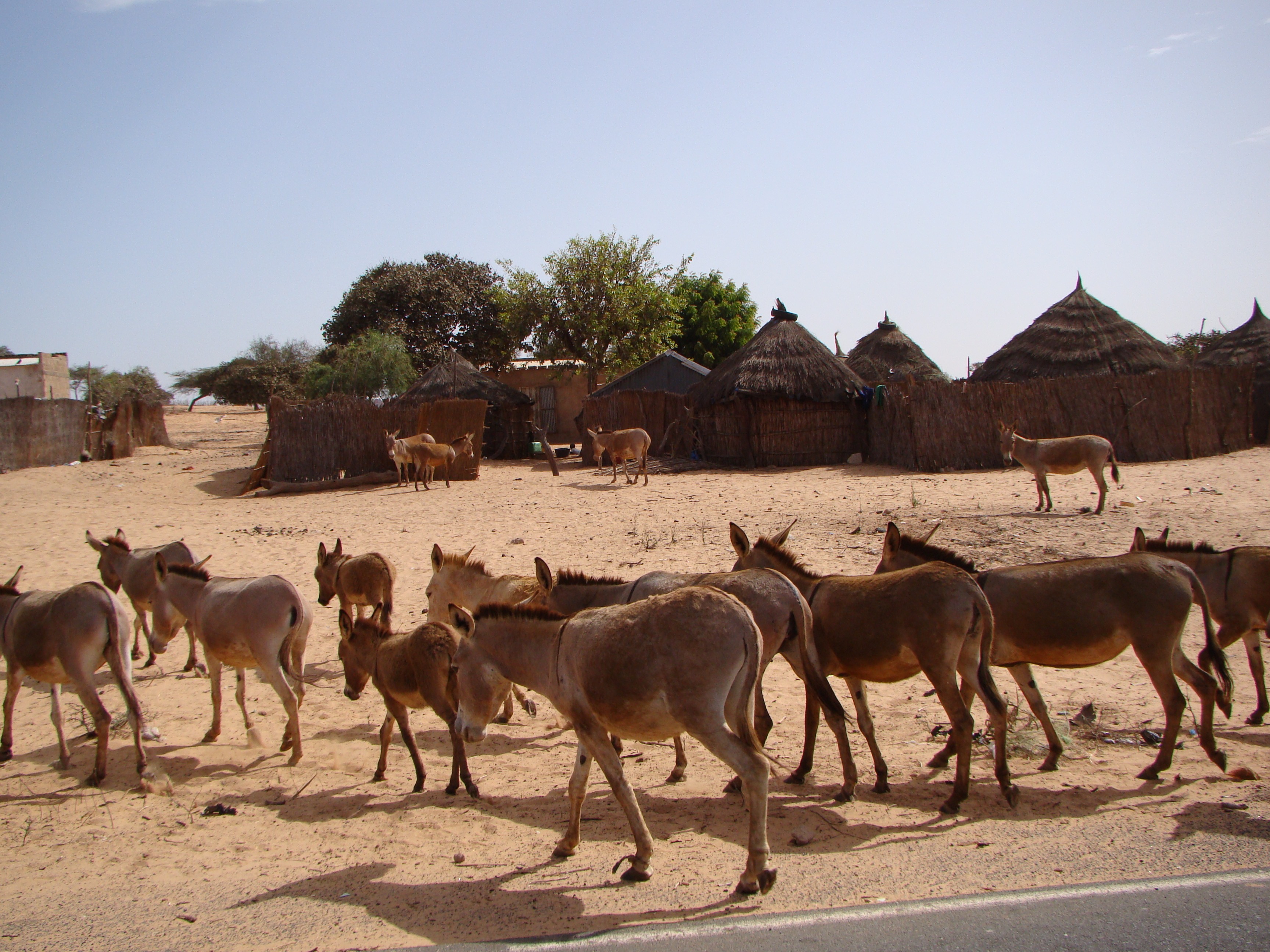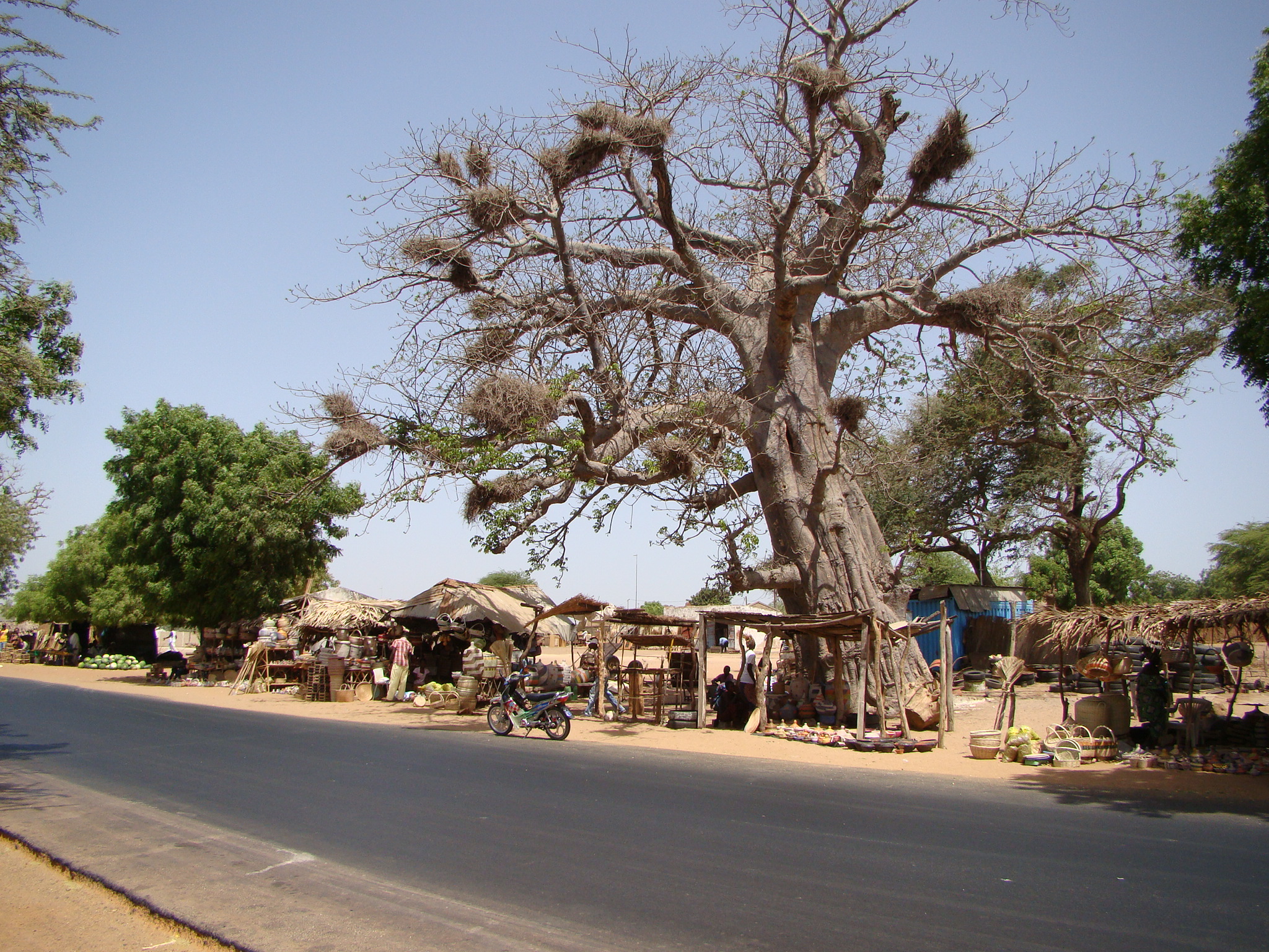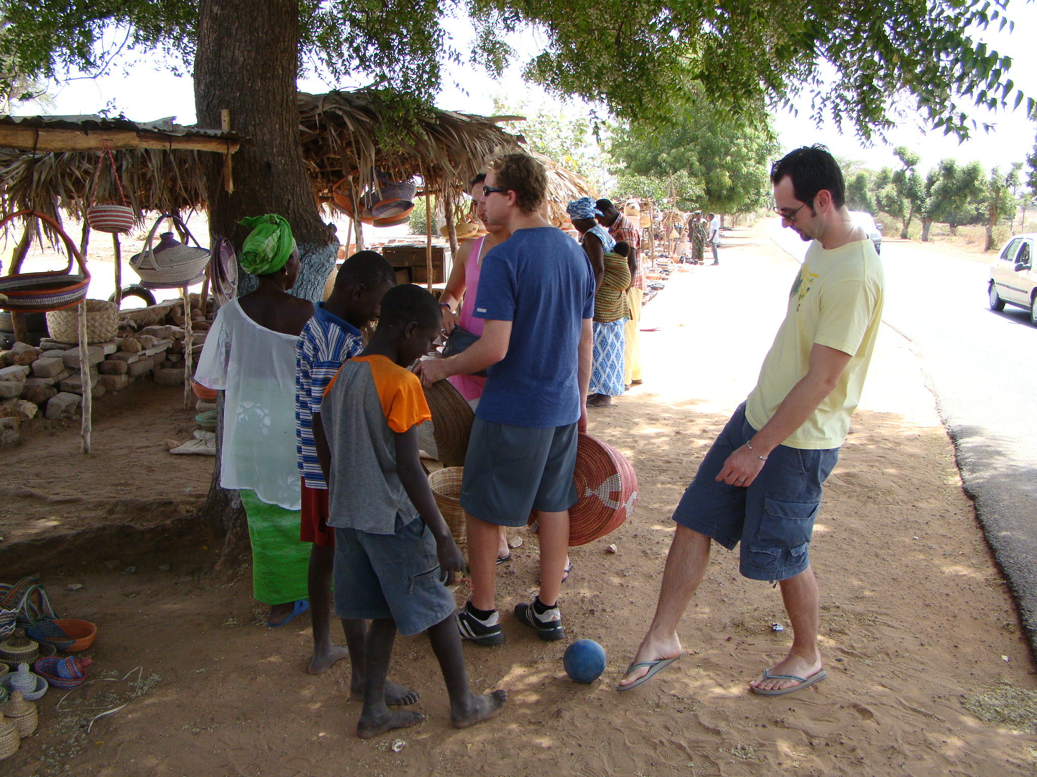 As we finally reached the countryside, the landscape was mainly dry (and sandy) but filled with these amazing looking trees called “baobab trees” (they have a corklike bark that is fire resistant and can store hundreds of liters of water, and their leaves are used for medicines and condiments – some baobabs have been proven to be over 2,000 years old). We also saw tons of animals: goats, donkeys, horses, sheep, birds (hawks and vultures), dogs and even a couple monkeys! At one point, we stopped at some roadside shops and checked out the local hand-made woven goods – baskets, bowls and other arts and crafts. Philippe and Charlotte bought a few things, while Brigitte took a bunch of pics and I engaged with two little boys in juggling a soccer ball. All I could think was that it was hot outside, really hot as in 100+ degrees fahrenheit and these ladies selling goods and their kids are out in this sun all day every day (it really makes you appreciate air conditioning). Although the moment you step in the shade it feels 20 degrees cooler…