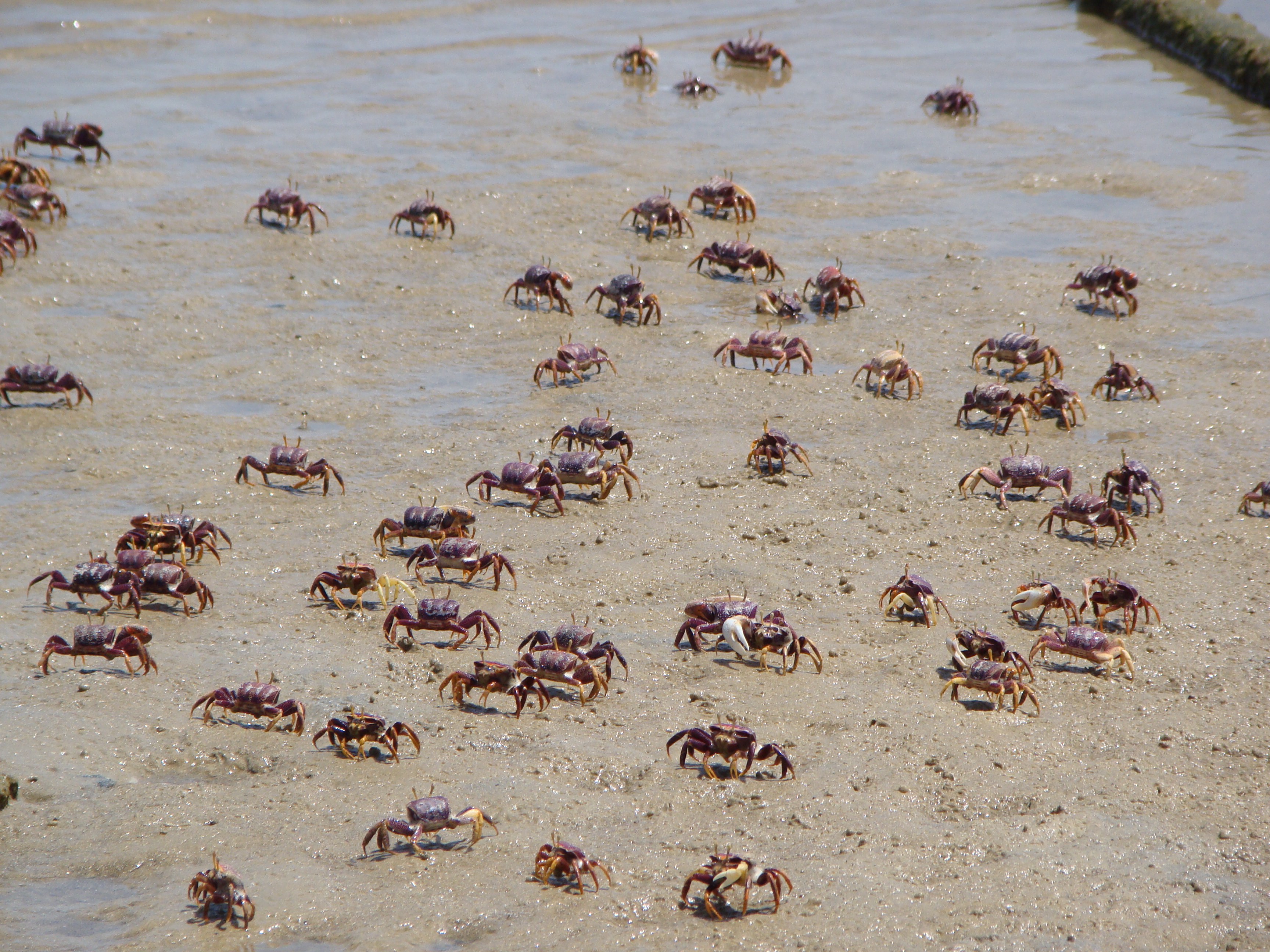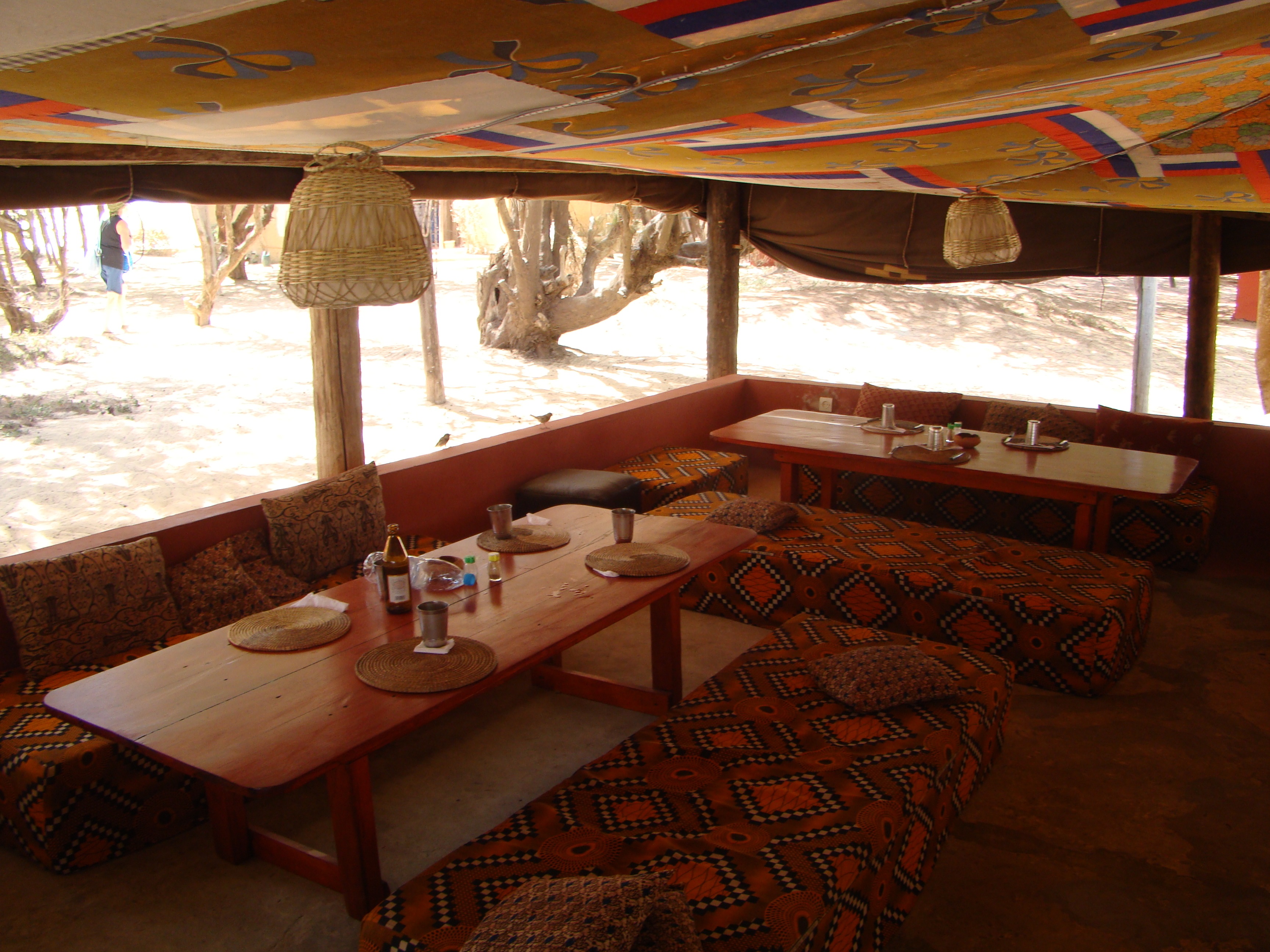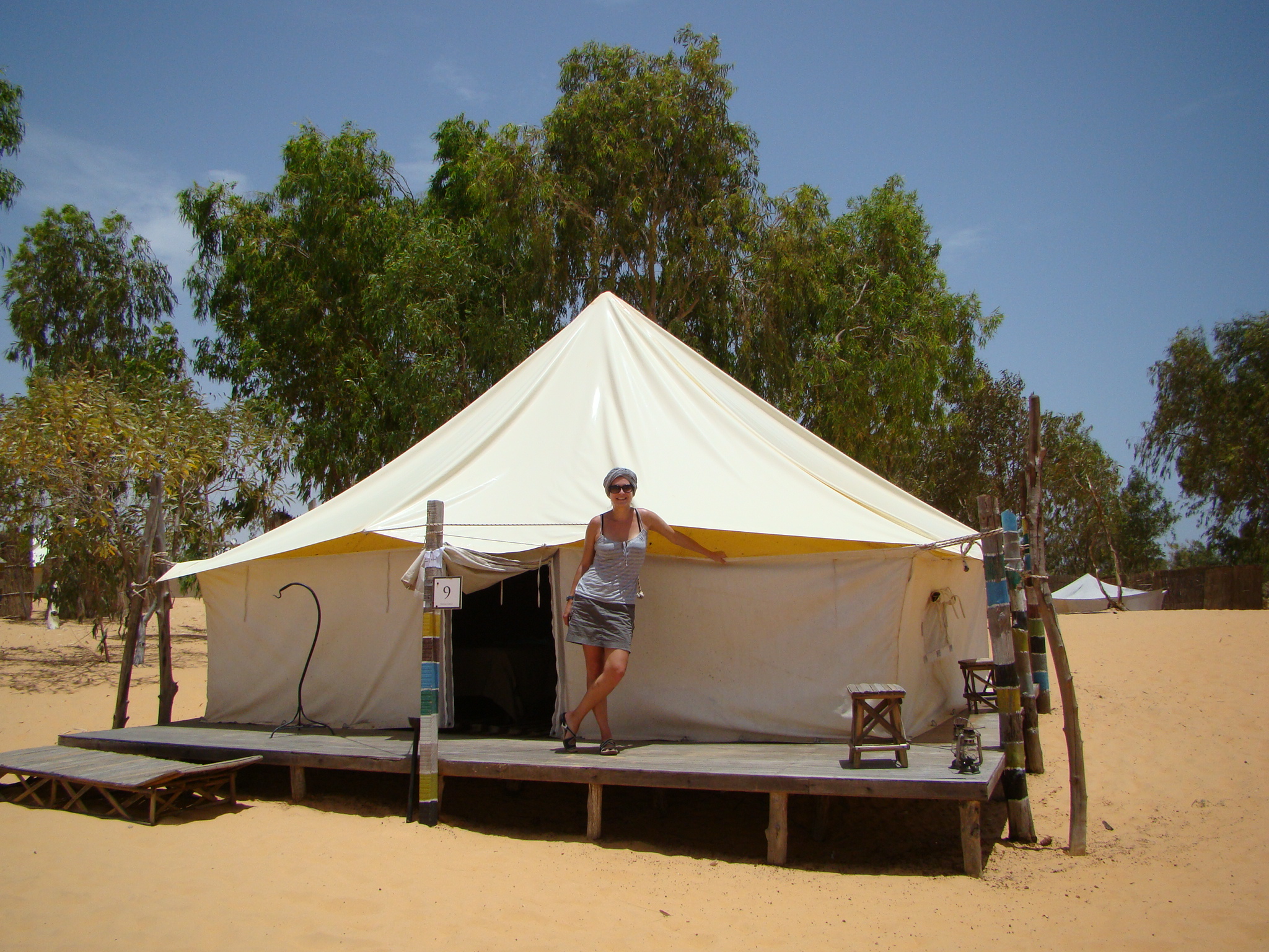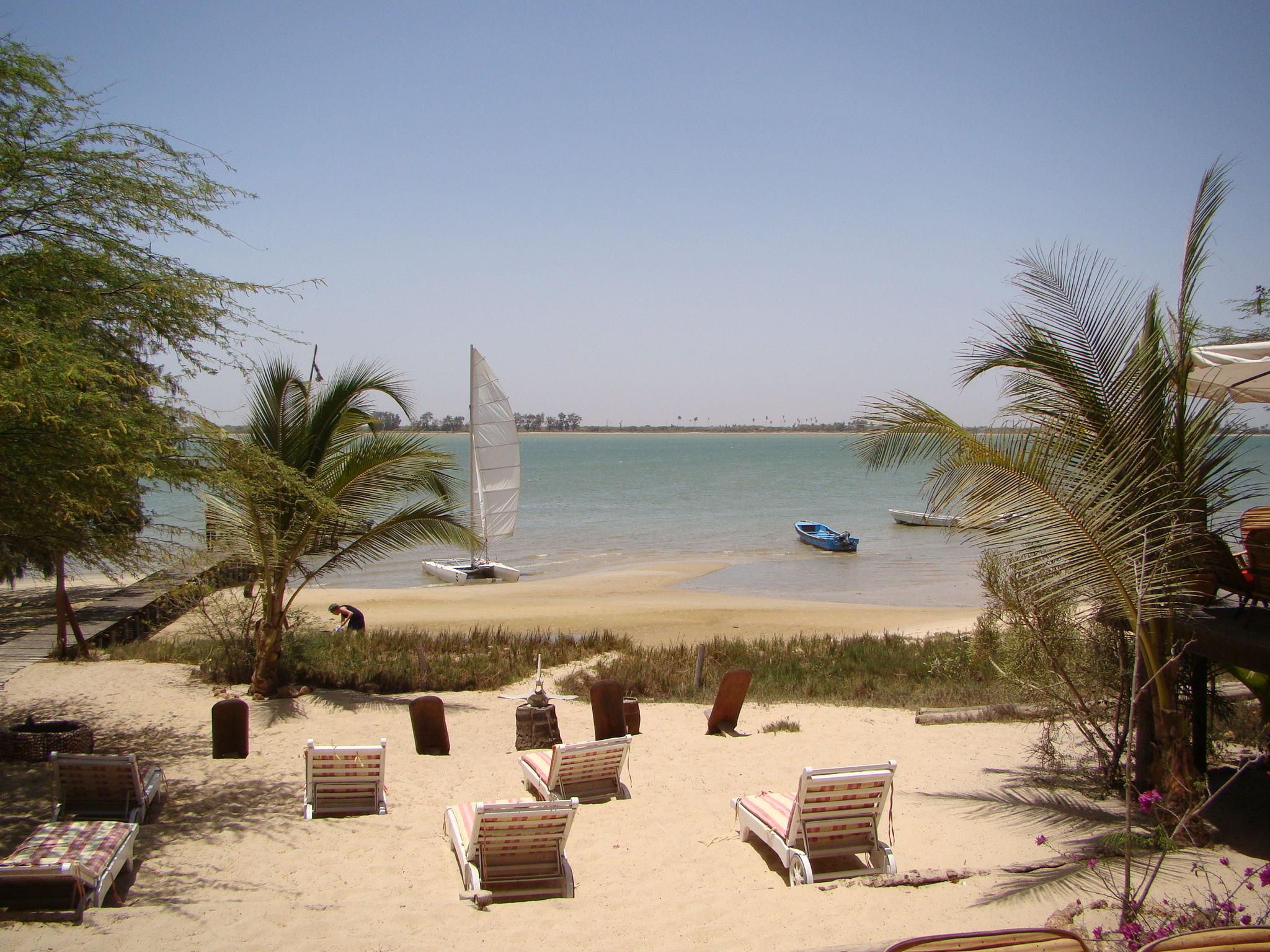 This was a small piece of paradise amongst the arid countryside in the north of Senegal. This is also where we took our first “pirogue” ride across the estuary. The pirogue is the traditional fishing boat of Western Africa (nowadays it’s also used for transporting tourists). We traversed the lagoon and found ourselves at the “Campement Ocean et Savane” a beautiful tiny beachfront retreat with a very cool restaurant under a huge tent. All this was located on Langue de Barbarie (the stripof land separating the Senegal river from the ocean which was about couple hundred feet wide). Naturally we took advantage of both worlds and went into the Atlantic Ocean first which had a constant flow of waves and a strong current. The beach itself was only about 30-40 feet wide and access to it was via a 15 foot drop off a sand dune. The beach was completed deserted and from the top of the dune we spotted many crabs that ran away as soon as we descended upon their territory. Cooling off in the ocean was very necessary. Soon after it was just about lunch time.