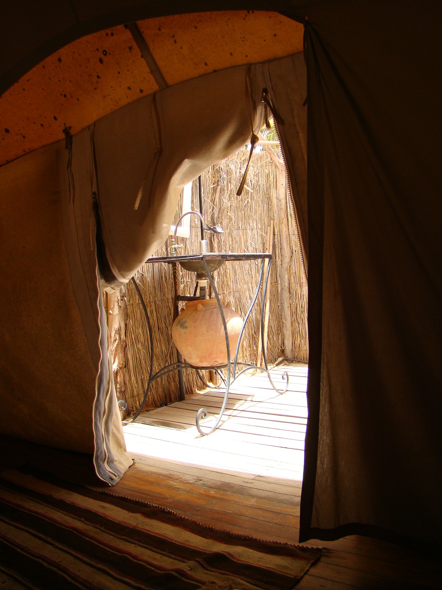 Next we checked out our accommodations which were these awesome tents (about 2 feet off the ground) standing about 12 feet tall at the apex. Inside were beds for 4 people, moroccan rugs and a couple of oil lamps for the night. Each tent was also equipped with its own bathroom (sink, shower and toilet), outside and fenced in (no ceiling so it felt very open – which was cool but also a little concerning as neighboring tents were only feet away). More on this later.