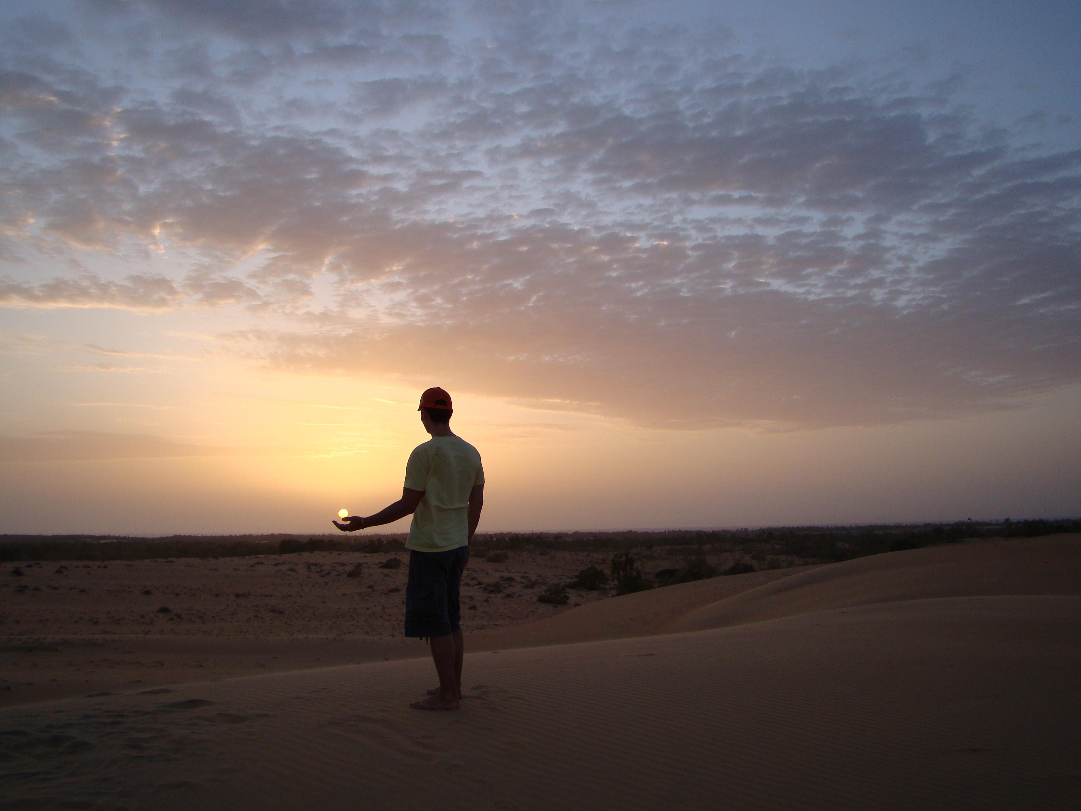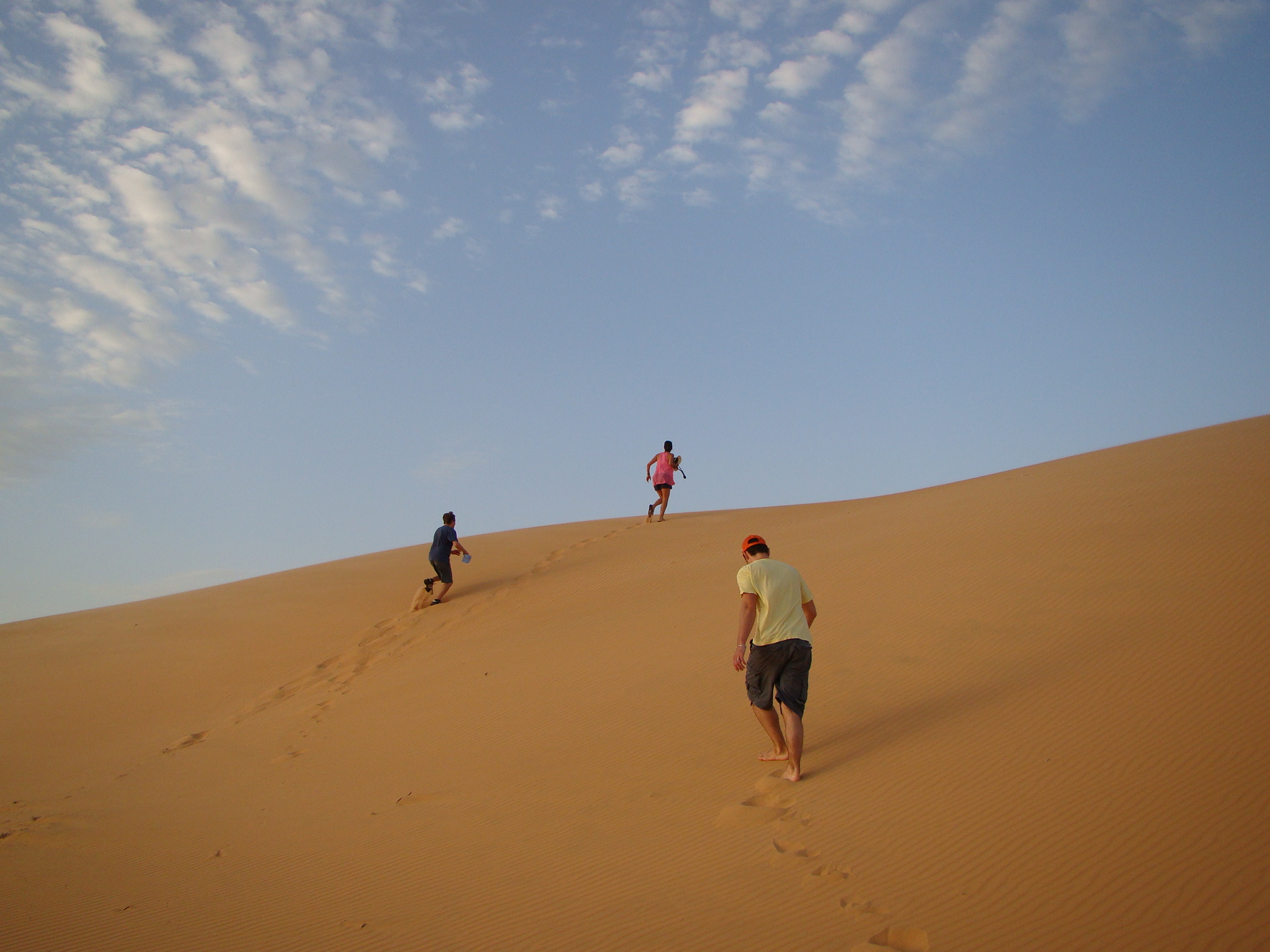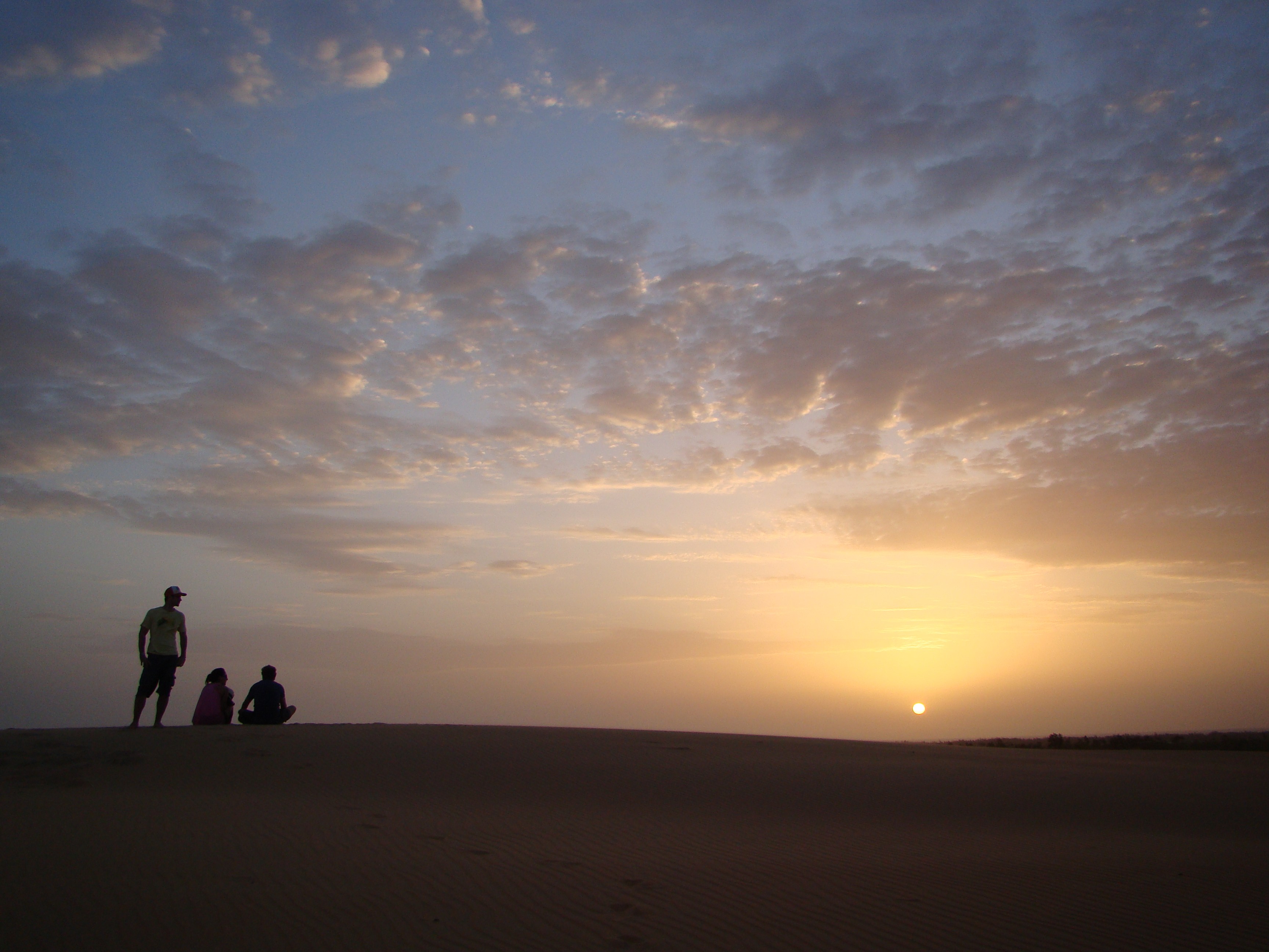 The dunes were tempting us in the middle of the afternoon but it was simply too hot to be in the sun. So Brigitte and I ventured upon them a little later that afternoon and once again for sunset with Philippe and Charlotte. This experience will stay with me forever. There was definitely an element of surrealism in being completely surrounded by monster dunes and only being able to see either the sky or the sand (all this in the middle of nowhere with no civilization in sight). Apparently the 7th dune offered a view of the Atlantic Ocean which was only a few kilometers away. I think we may have actually made it close to the lucky 7th as we spotted what appeared to be crashing waves on shore (on the horizon). Watching the sunset was icing on the cake only to be fittingly captured by Brigitte’s pictures (pure magic!).