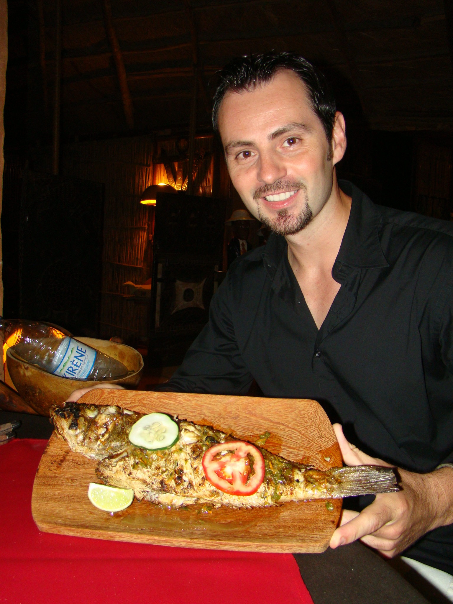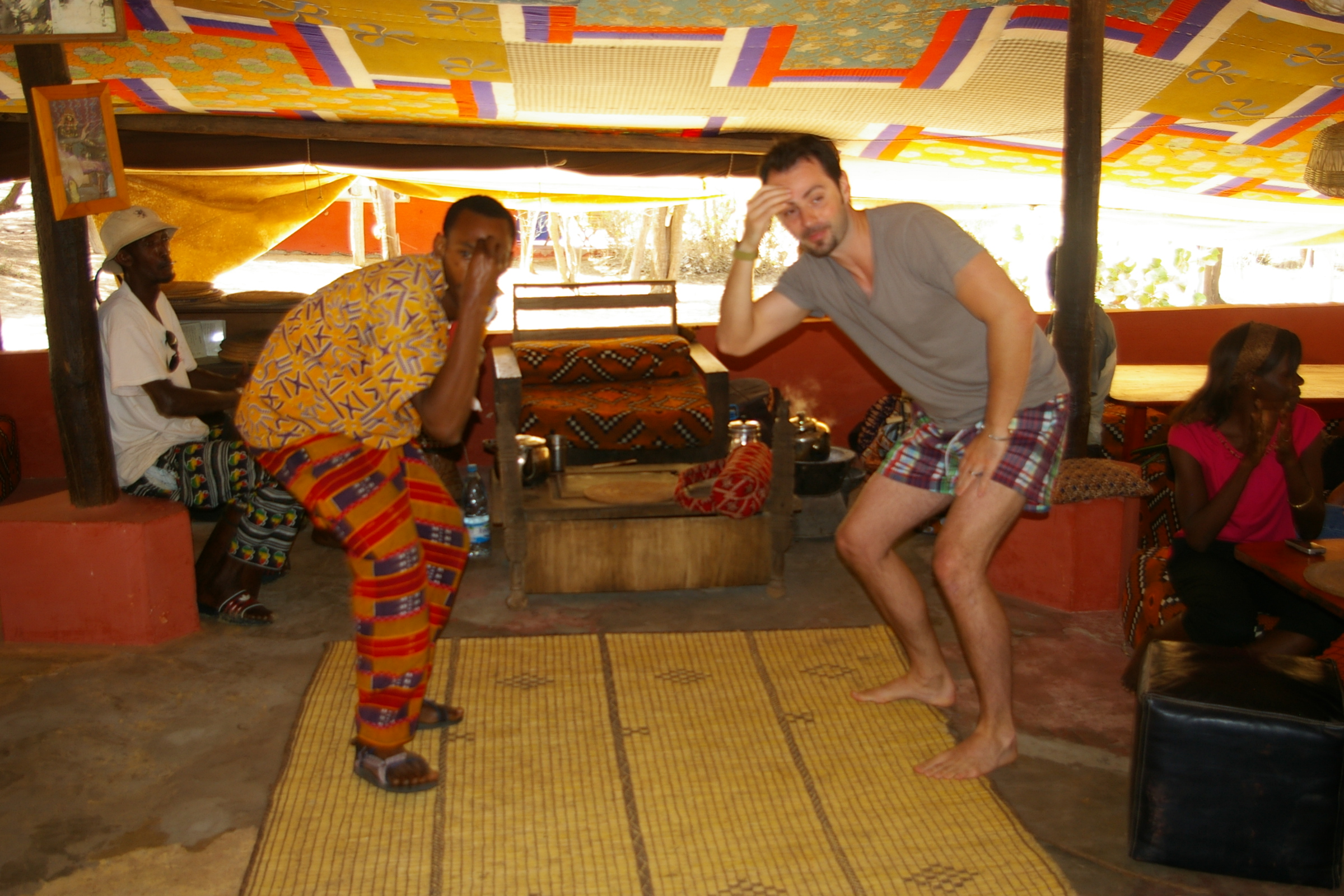 We had some delicious chicken kebabs along with an amazing salad made with green papaya, mango, chives and pineapple (with a citrus dressing). One of our bestmeals so far! Tons of little yellow birds (Black-headed weavers) were flying all around us in search of crumbs so I offered them a few small pieces of bread. After lunch we all grabbed a beach chair and enjoyed the beautiful and peaceful view of the Senegal river. Before departing from this little paradise Brigitte and went for a dip in the river only to find ourselves surrounded by hundreds of tiny flying fish (they were literally within reach not only from us but also their predators). Every now and then a few of them would jump out to the surface and “leap” across the water. On a few occasions we saw some of them get snatched up by their larger predatory brethren.. being surrounded by endless natural beauty and rich wildlife served as a nice reminder of why we wanted to do this trip.