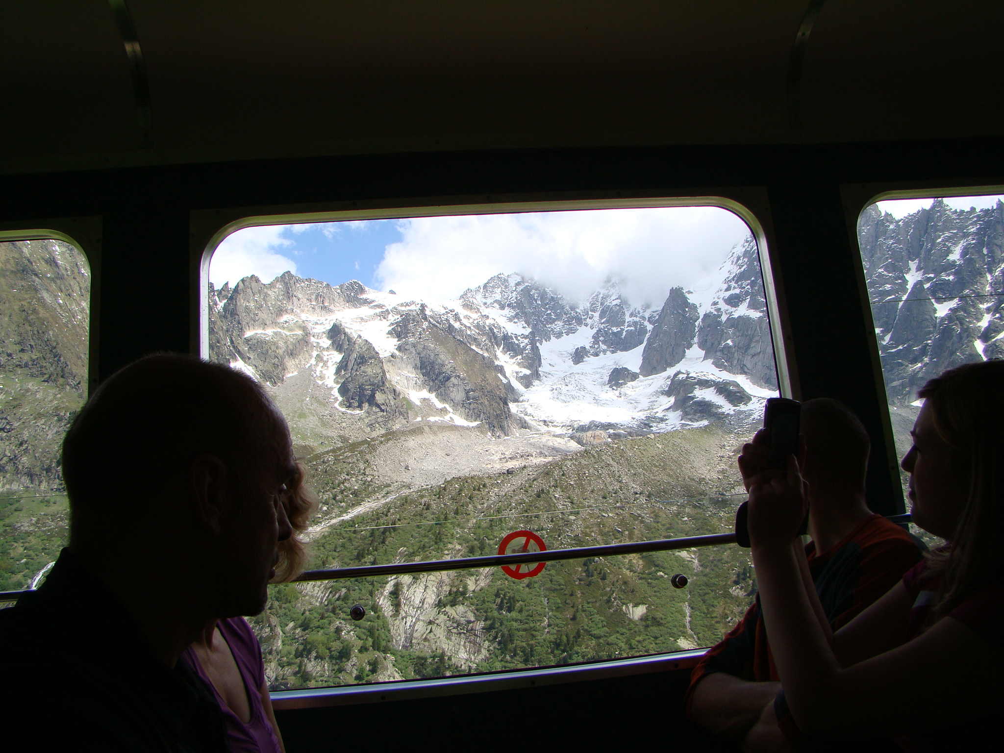 Our main attraction was the Mer de Glace, a 7 km long glacier that runs 200 meters deep (it’s the biggest one in France). In one word: sick! Getting to see this bad boy was quite a hike (down and up). First we took a rack railway train up the mountain to an elevation of 1,913 meters (that’s about 6,276 feet). Then we hiked down the mountain for 30 minutes until we reached the mouth of the glacier. There is a gondola that does this trip in about 6 minutes but it was too windy today so it wasn’t operating… just our luck (we walked the 300 steps instead!). On the hike down there were reminders of how high the glaciers stood back in 1820, 1890, 1990 and 2005. This thing receded hundreds of meters since the good old 1820s, thanks to global warming. I guess we’re lucky to still be able to see and walk through it which was pretty unique. From the glacier we had to hike up for about 45 minutes (thanks wind!), to get the train back to town for a much needed cold beer – a Mont Blanc Blonde beer that is!