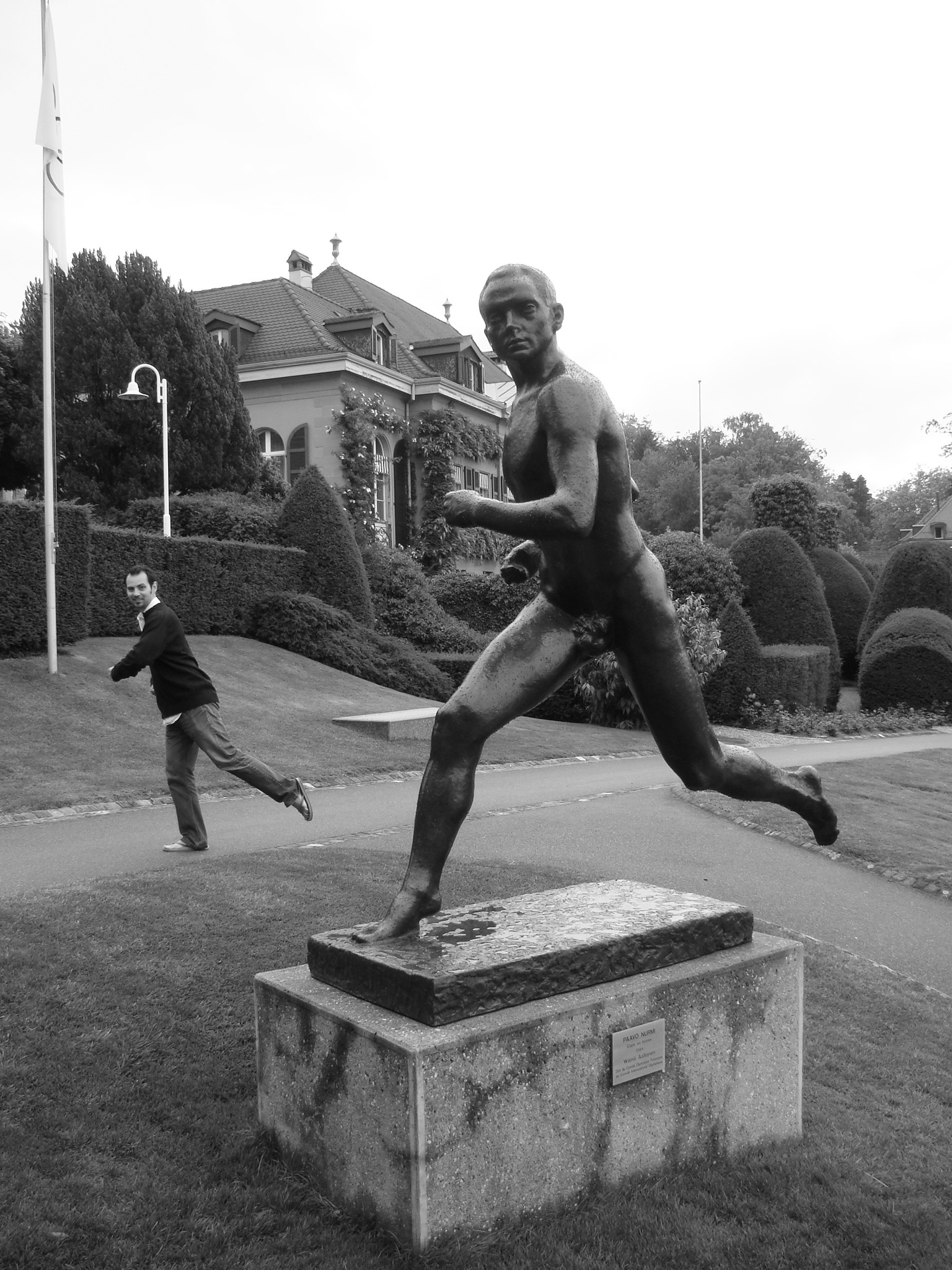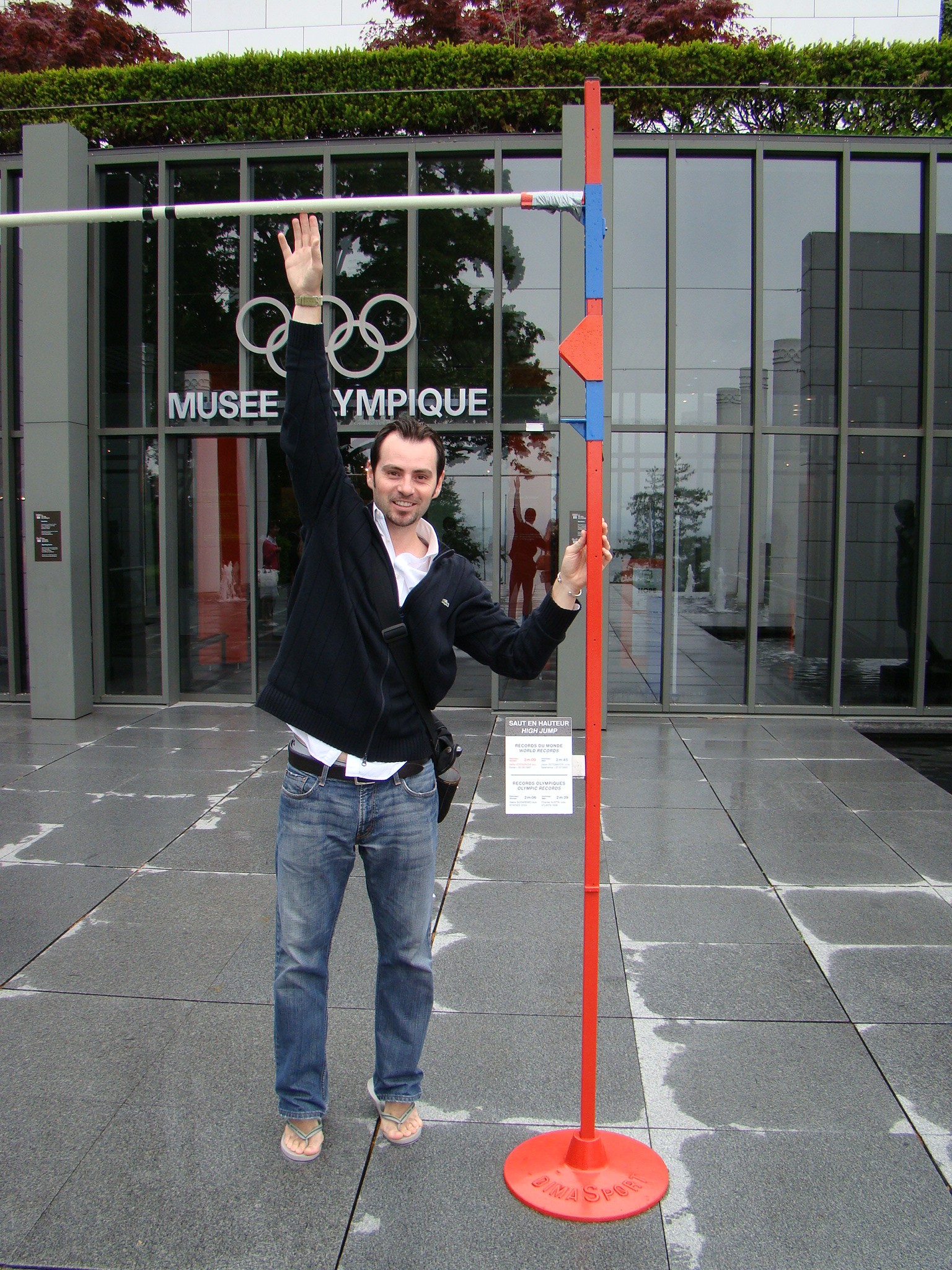 The next part of our visit took us through the centre ville, an endless mosaic of cobblestone streets, passageways and really cute shops (yup, I said cute!). But unfortunately it started to rain so we decided to make our way over to the Olympic Museum. Talk about an awe-inspiring experience! For any sport fan this would be its holy grail. From decorated memorabilia and medal cases to actual athlete apparel and event props – Shannon Miller’s gymnastics signed bodysuit, a Pele autographed soccer ball, Jordan’s Zeina Shaban’s ping pong paddle, etc. Unfortunately you cannot take any pics of this stuff but Brigitte decided otherwise. Perhaps one of the most impressive aspects of this museum was right in front of its entrance – a bar set to the High Jump World Record of 2.45 meters held by Javier Sotomayor of Cuba (sick! with arms completely extended over my head I could barely reach it).