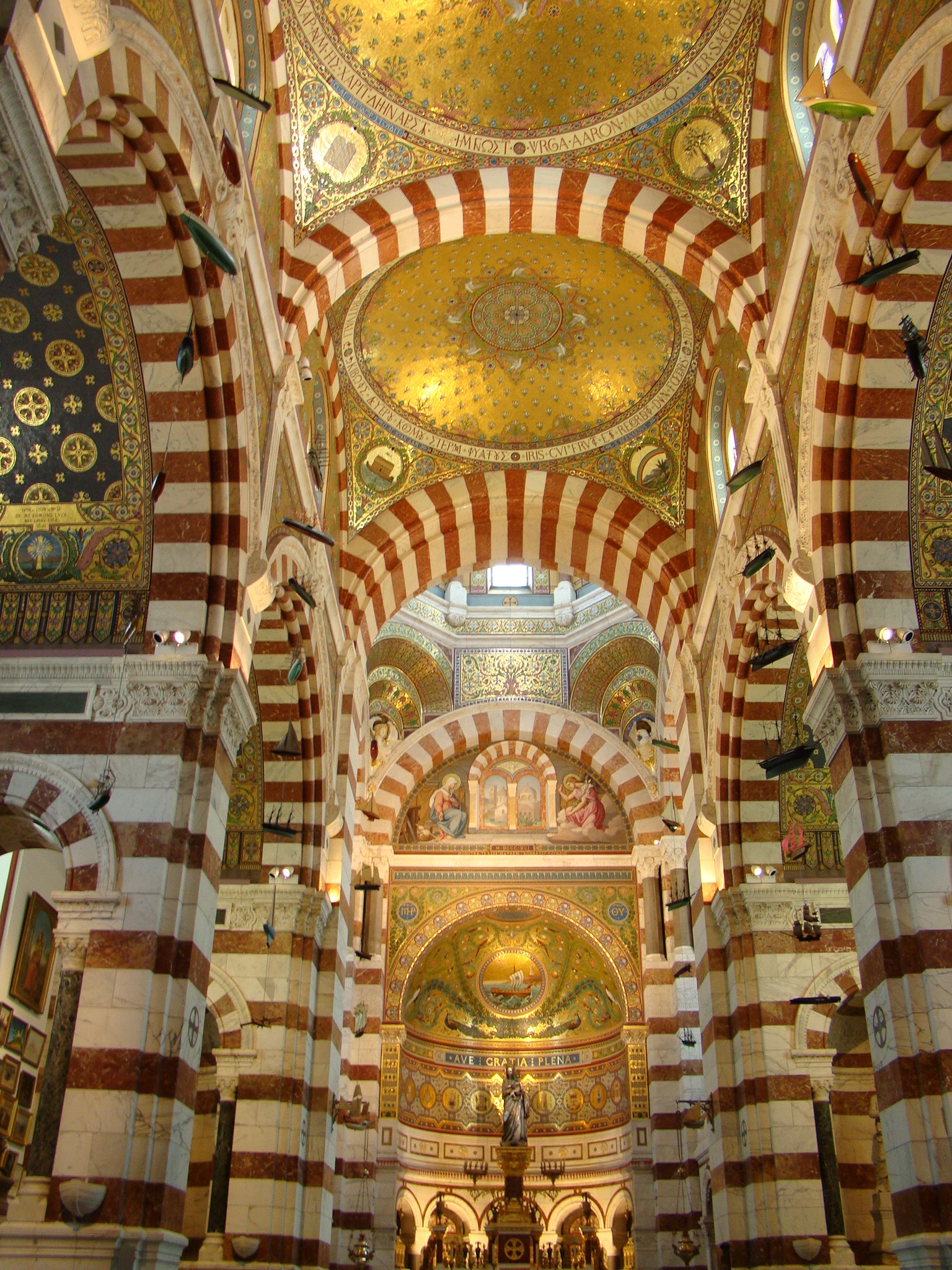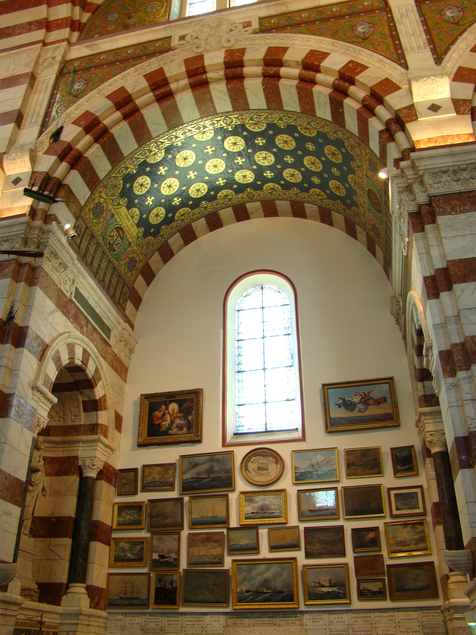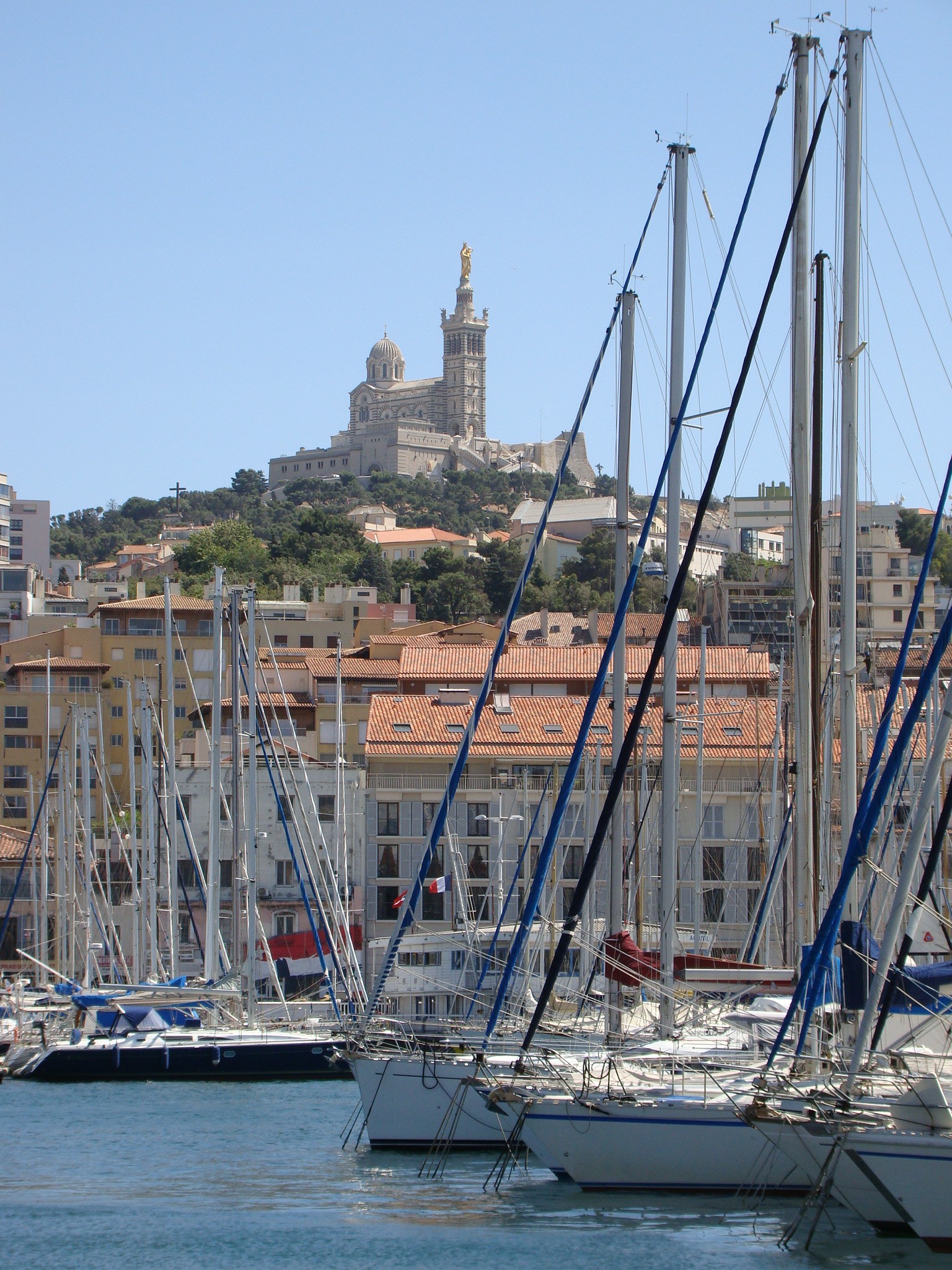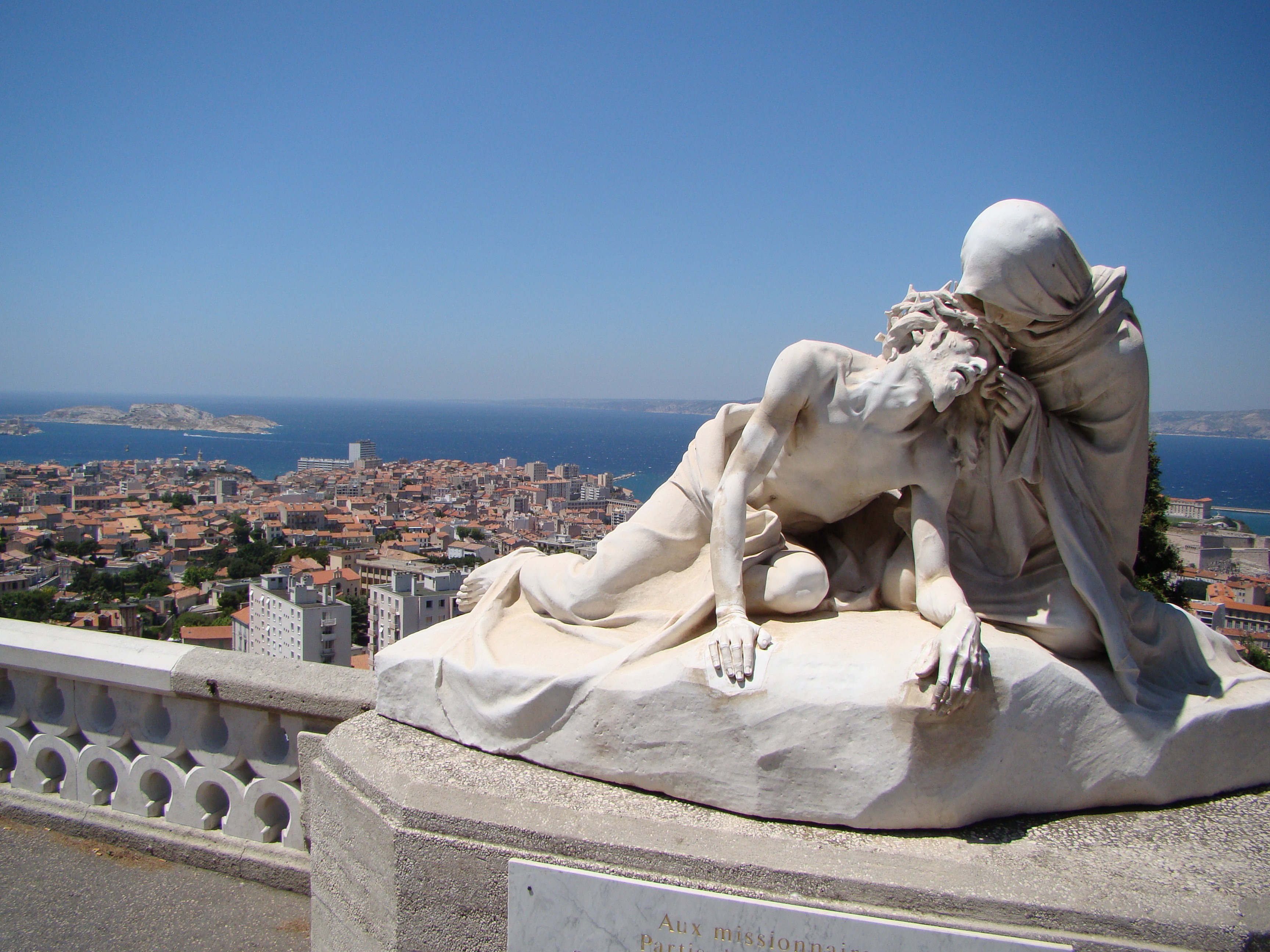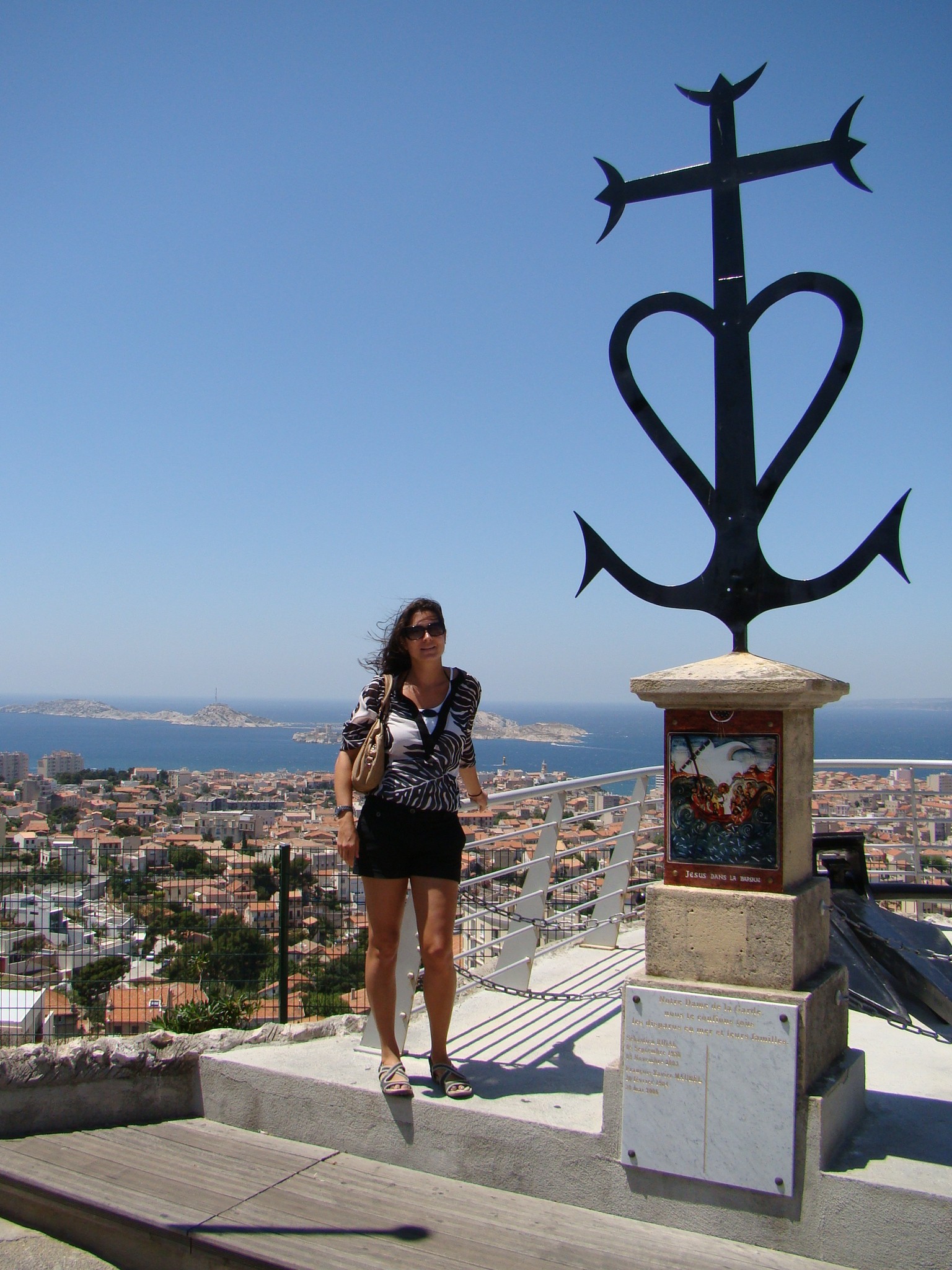 Our alternate plan consisted of walking around Marseille and seeing some of its other important landmarks. We started with the Notre-Dame de la Garde, a beautiful Neo-Byzantine basilica located atop the highest point in Marseille (a 530-foot tall hill). Notre-Dame de la Garde is visible from any point in Marseille and it was quite a hike to reach it. What started out as a chapel back in the 13th century became a beautiful basilica constructed from limestone which today stands guard for the people of Marseille. We checked out the crypt first located on the lower level of the basilica and then made our way inside the chapel part. To our surprise it was very different from most churches we’ve seen thus far on our trip. The design and decor was very colorful and ornate. The walls on one side were decorated with several rows of wartime medals as well as a fine collection of paintings displaying naval ships and fishing boats from the last couple of centuries. On the opposite wall there were numerous other paintings of Marseille and the countryside depicted throughout the same era. What struck us most was how busy and colorful it was inside but everything seemed to have its place and was thus in harmony. Brigitte snapped a few photos and then we made our way outside for more pictures. Standing atop the 530-foot hill offered us some pretty amazing views of Marseille, the Old Port, and the Mediterranean Sea. The other amazing component here was the wind (at 40 mph) which at this altitude really kicked ass. We fought our way to take a few pictures of the panorama but most had to be taken time and time again.