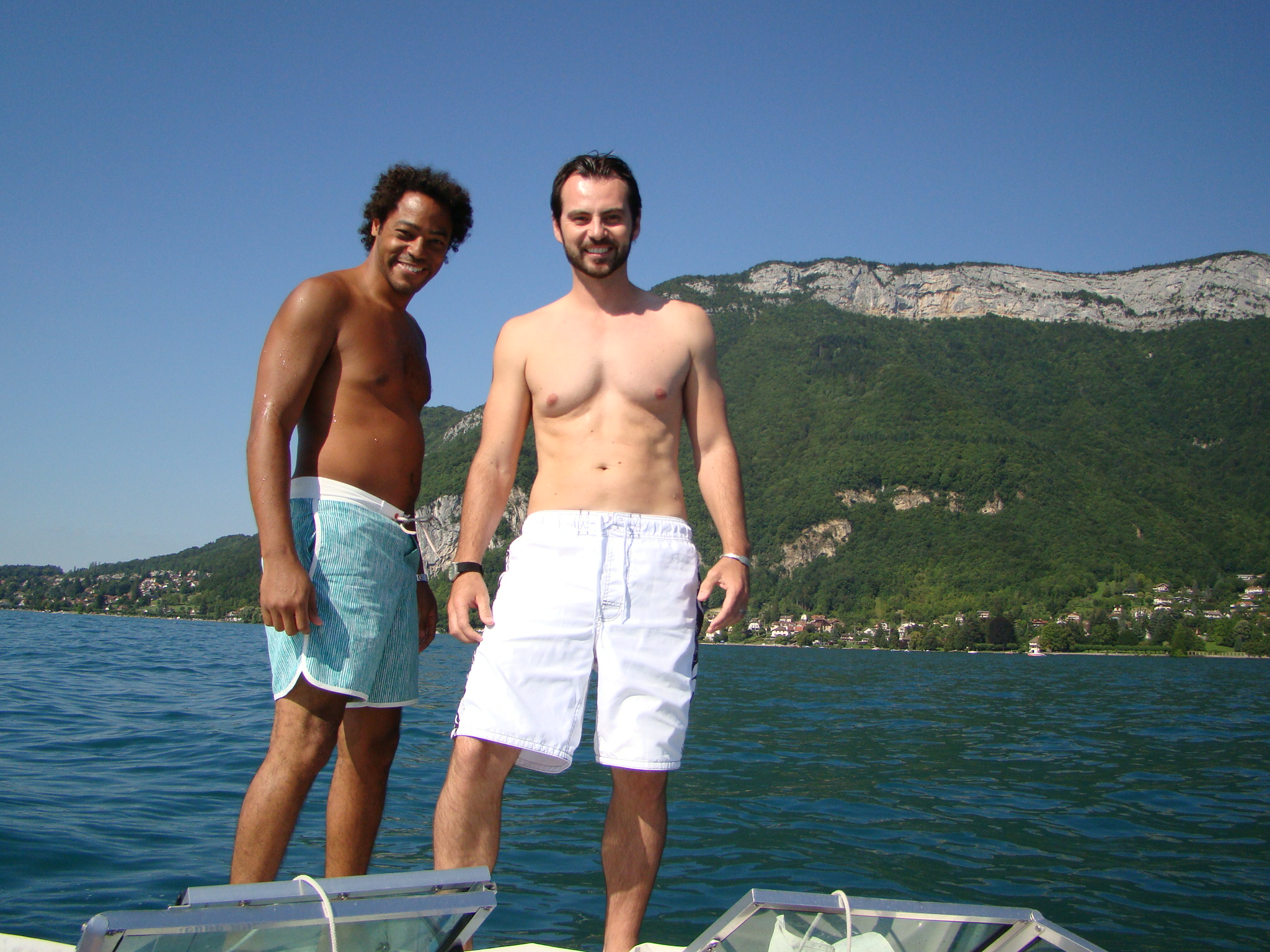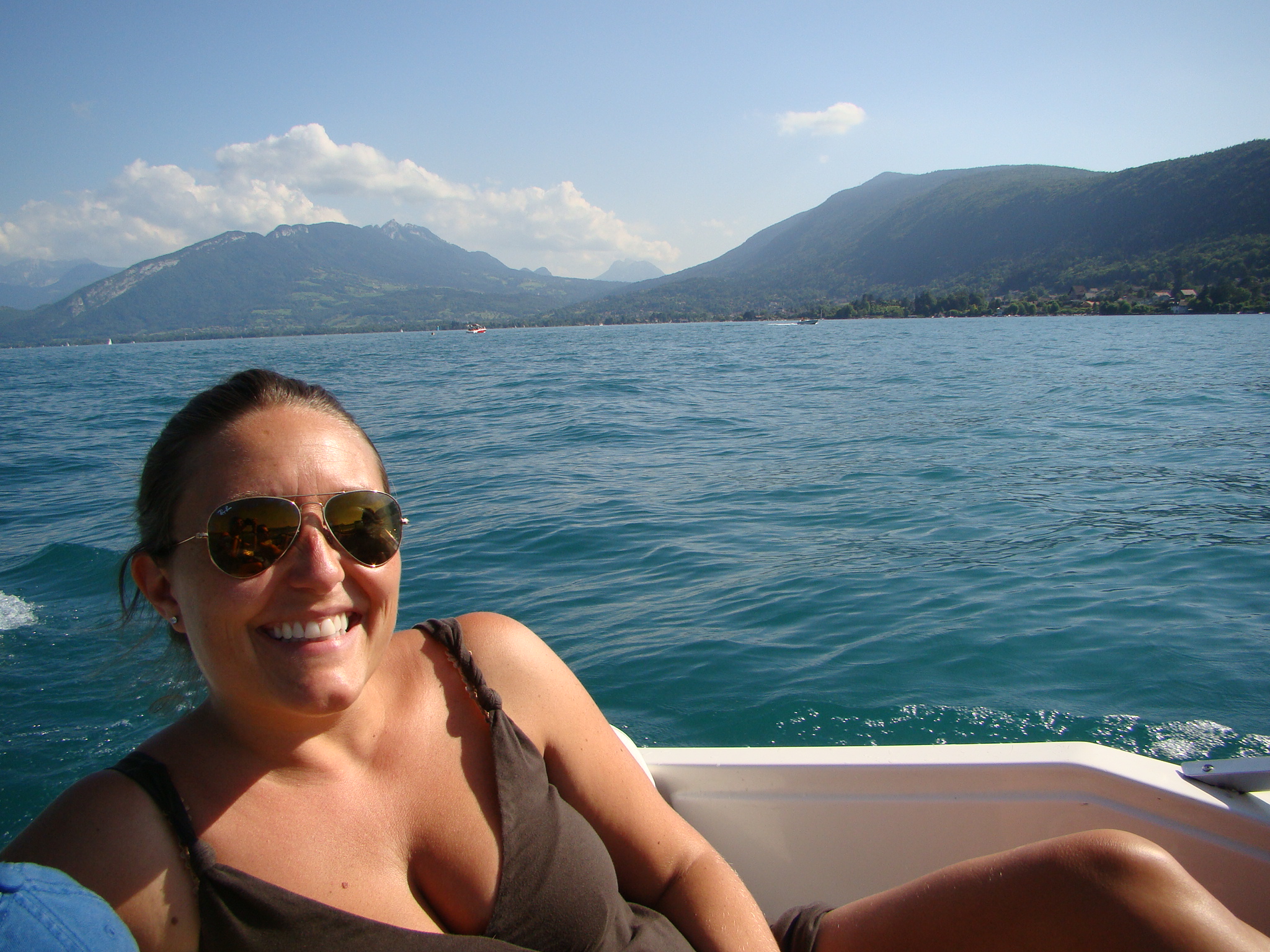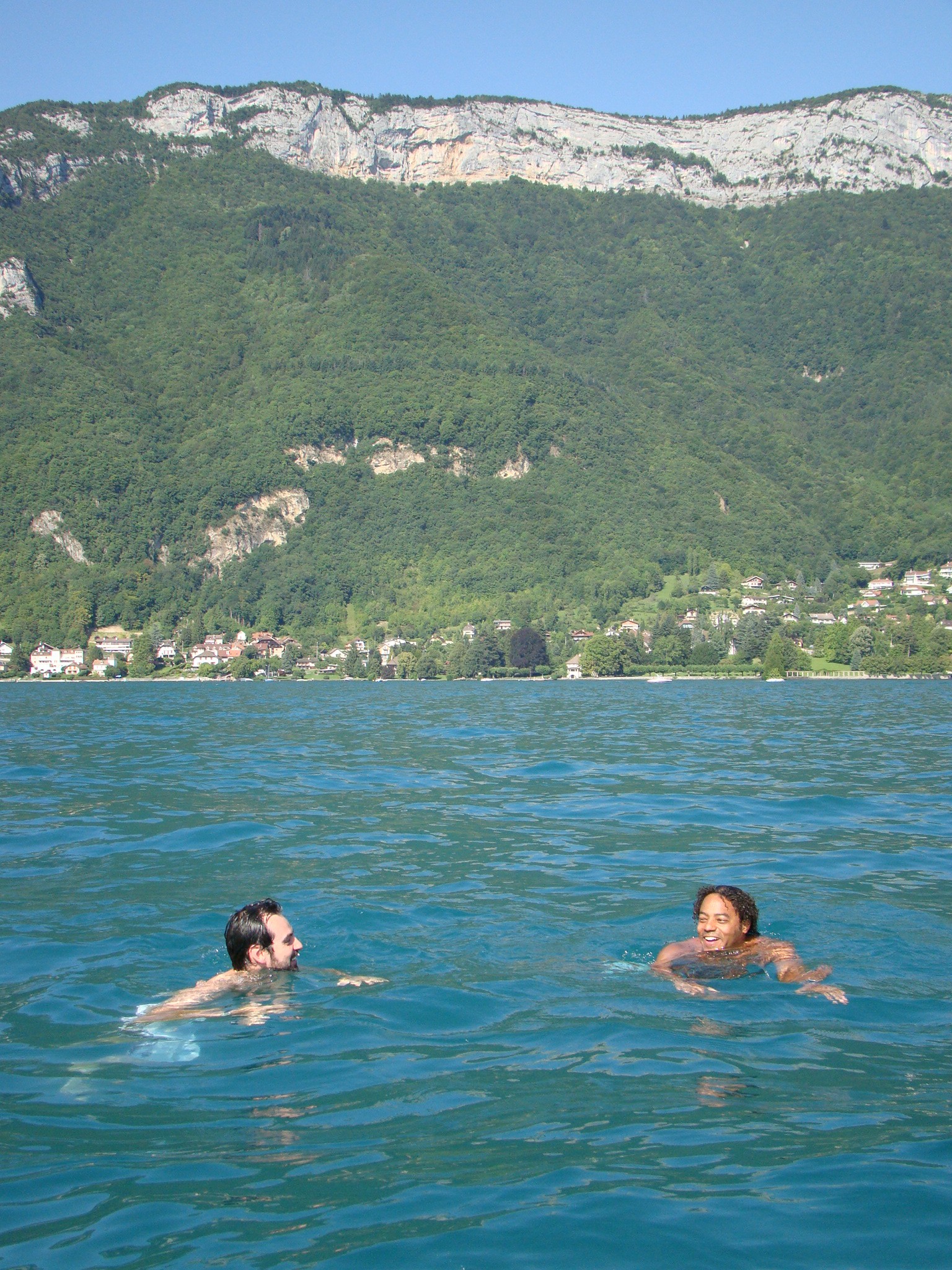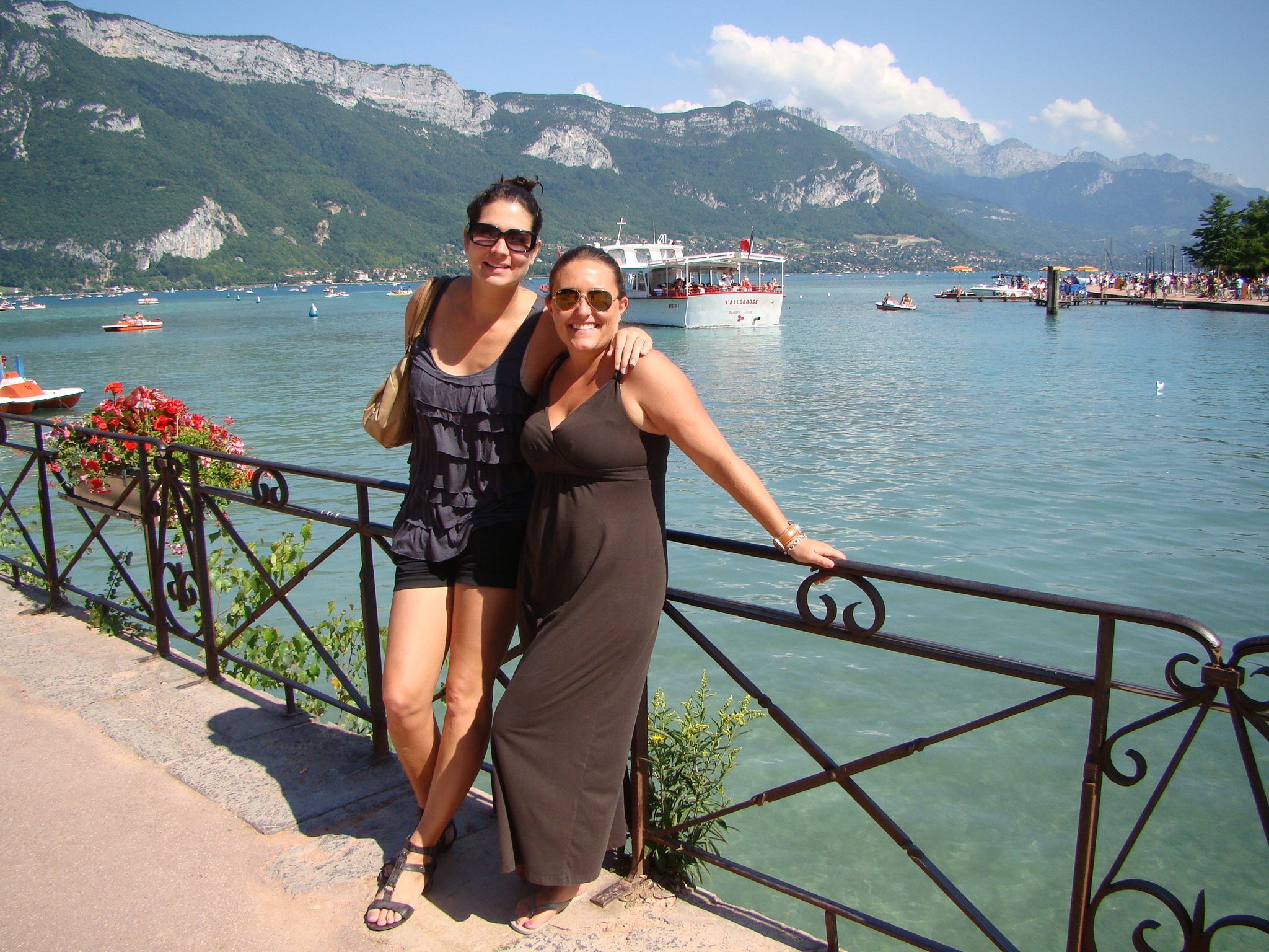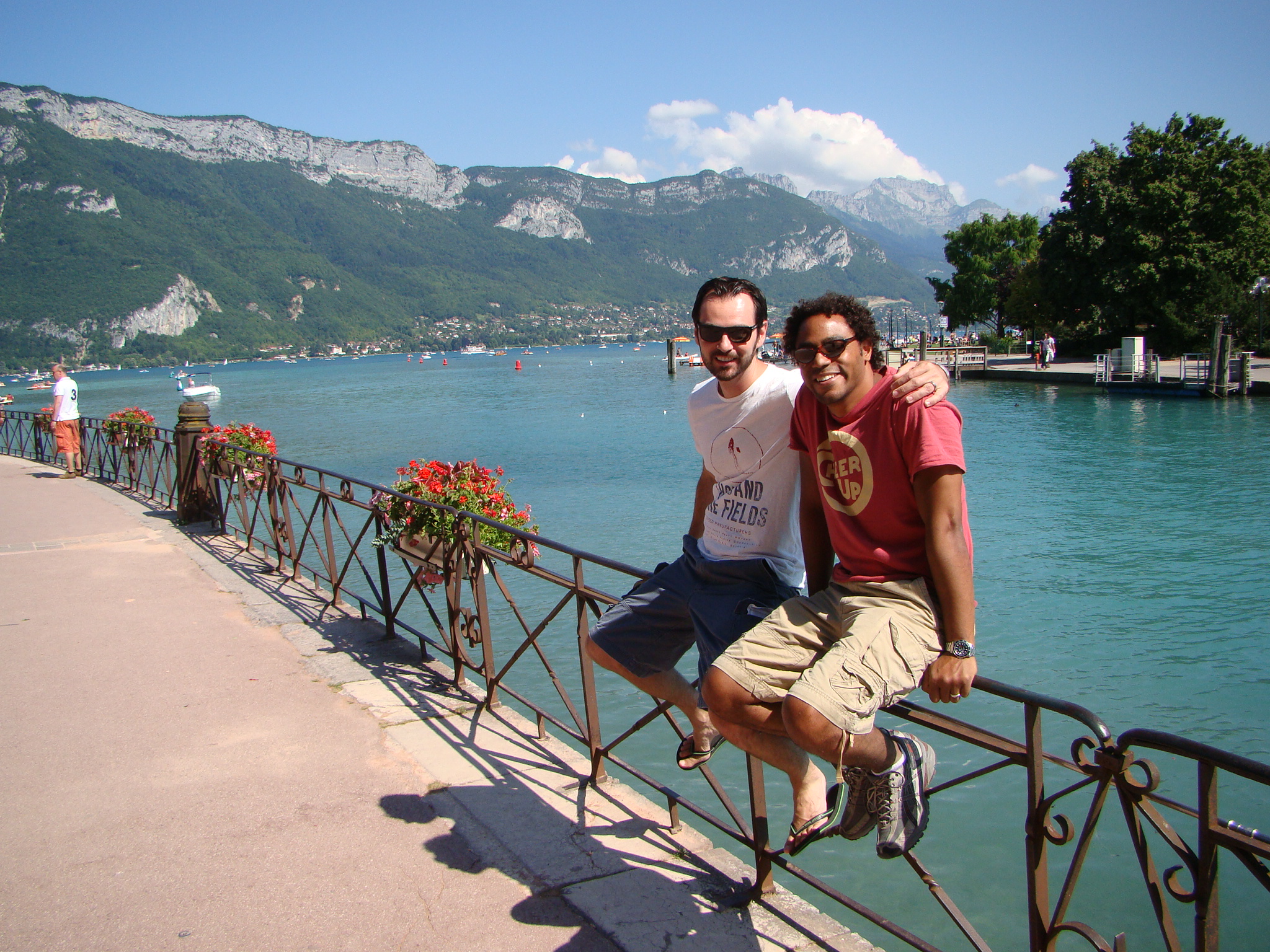 The next day (after having recovered), I was ready for our new and much tamer adventure – a day trip to Annecy. Dawda and Claire had wanted to see and it was only about 40 minutes away from Geneva. Annecy was recently among the bidding cities for hosting the 2014 Winter Olympics but things didn’t pan out. Nonetheless this town still had tons to offer from its historic medieval center to crystal clear canals, to its neighboring lake and surrounding Alps. Annecy’s charm was impressive and we all concurred. But what really drew us was the turquoise lake and the numerous water/boating activities at hand. We opted for the small engine boat for an hour which paid off handsomely. Dawda drove us out in the middle of the lake and we absorbed the panoramic view of mountains and the distant Annecy dock. This also seemed like the perfect spot to take a dip in the amusingly clear water, so Dawda and I jumped in. The ladies stayed on the boat with Aden and shot plenty of “film” of the scenery. Olympics or no Olympics, Annecy is still a gold medal town in its natural splendor and the bon vivant attitude it inspires.