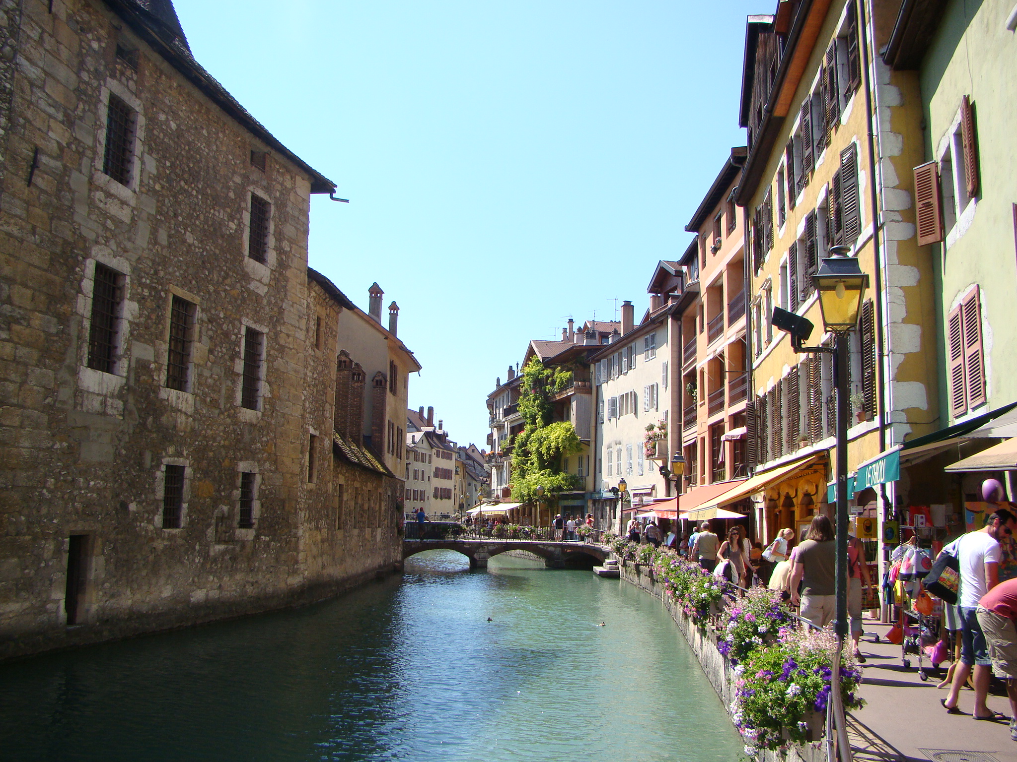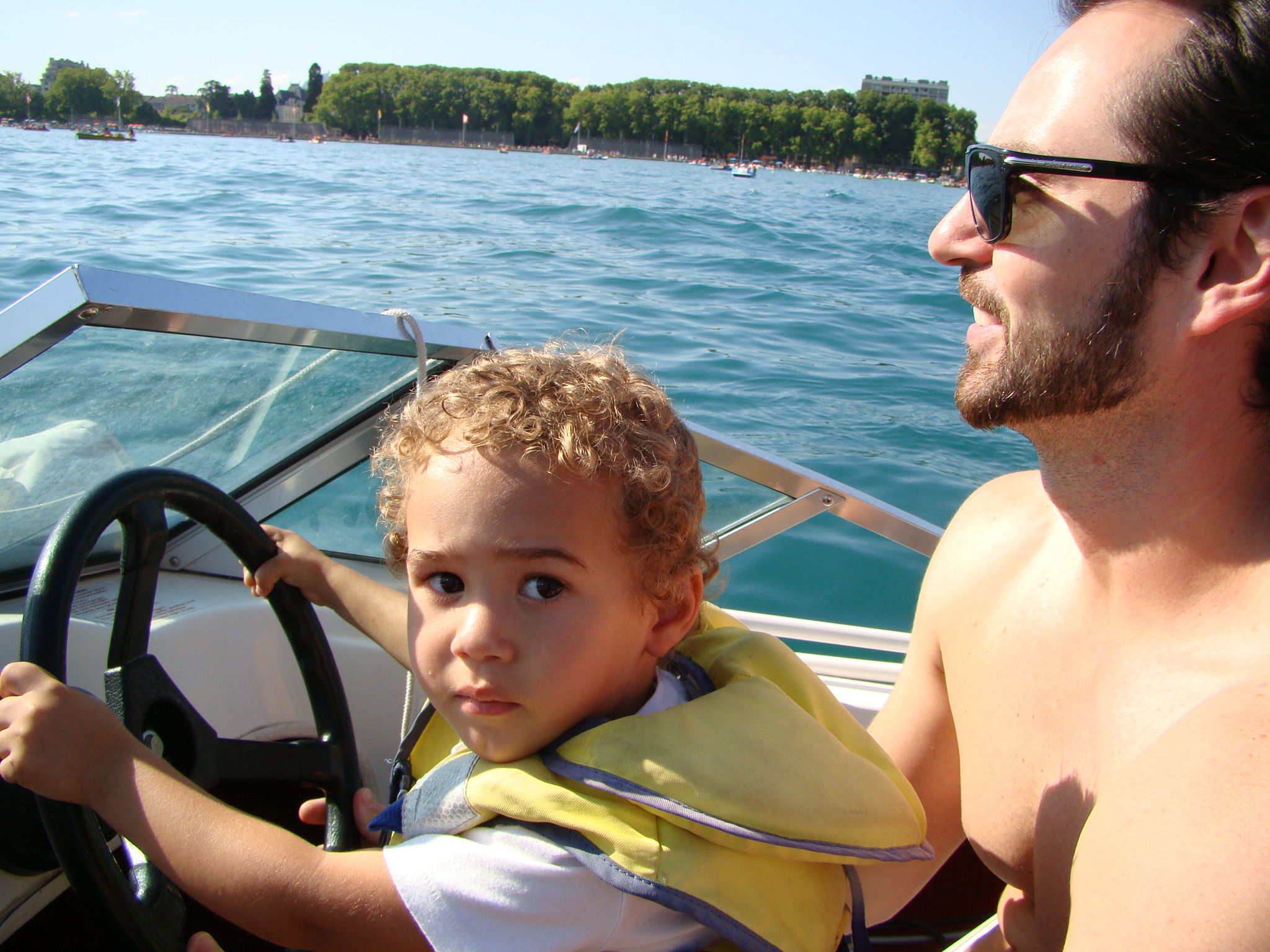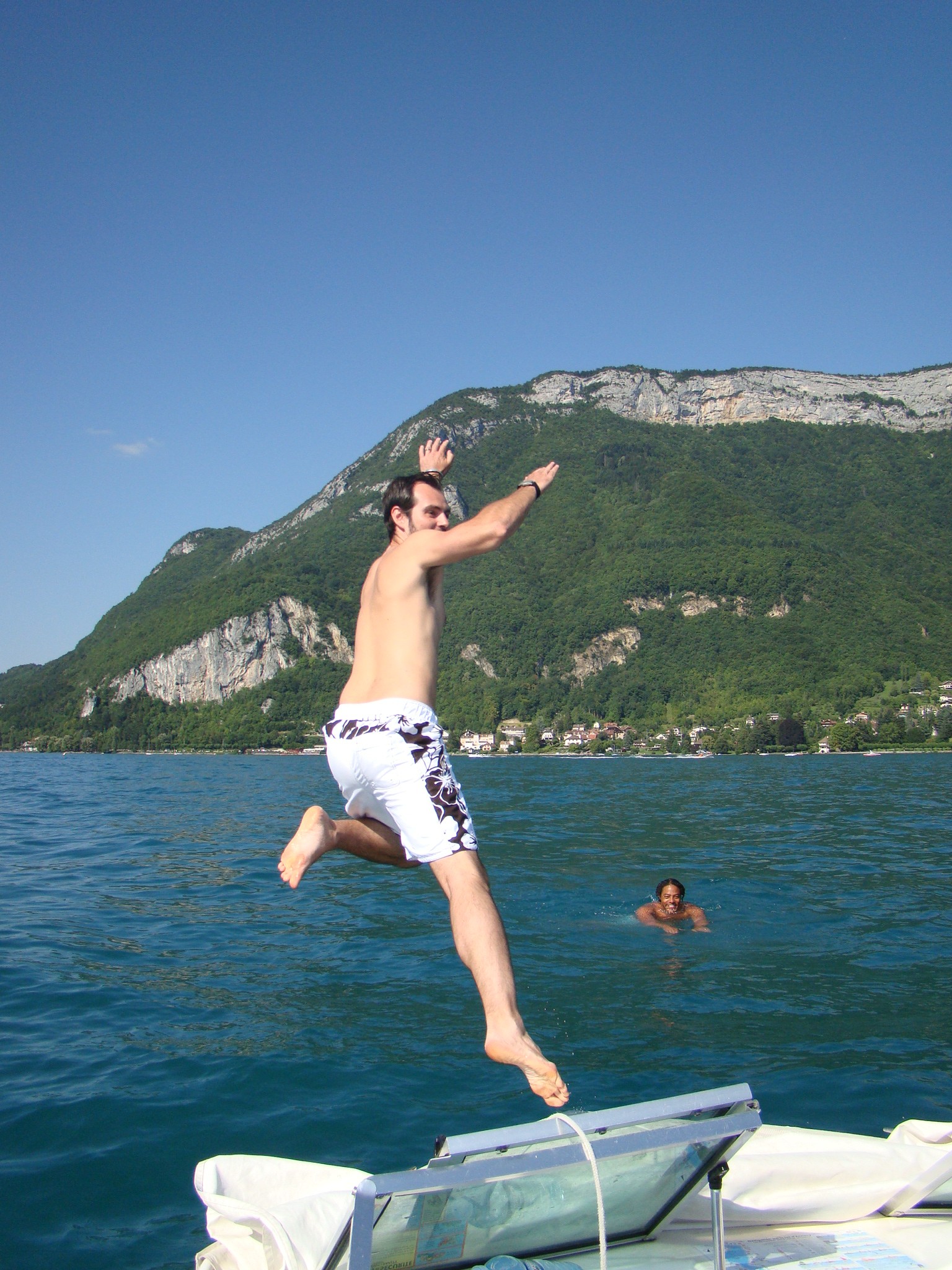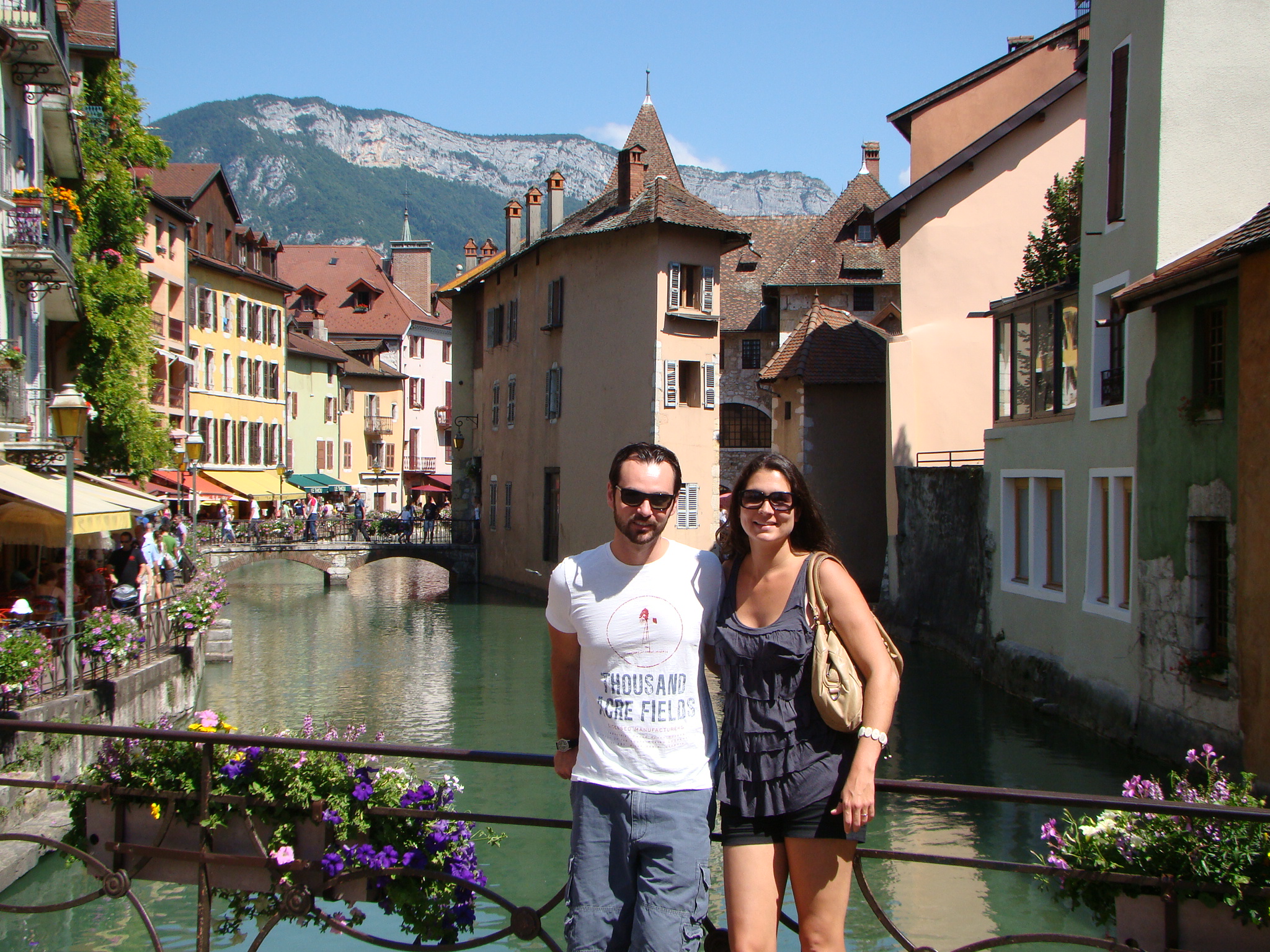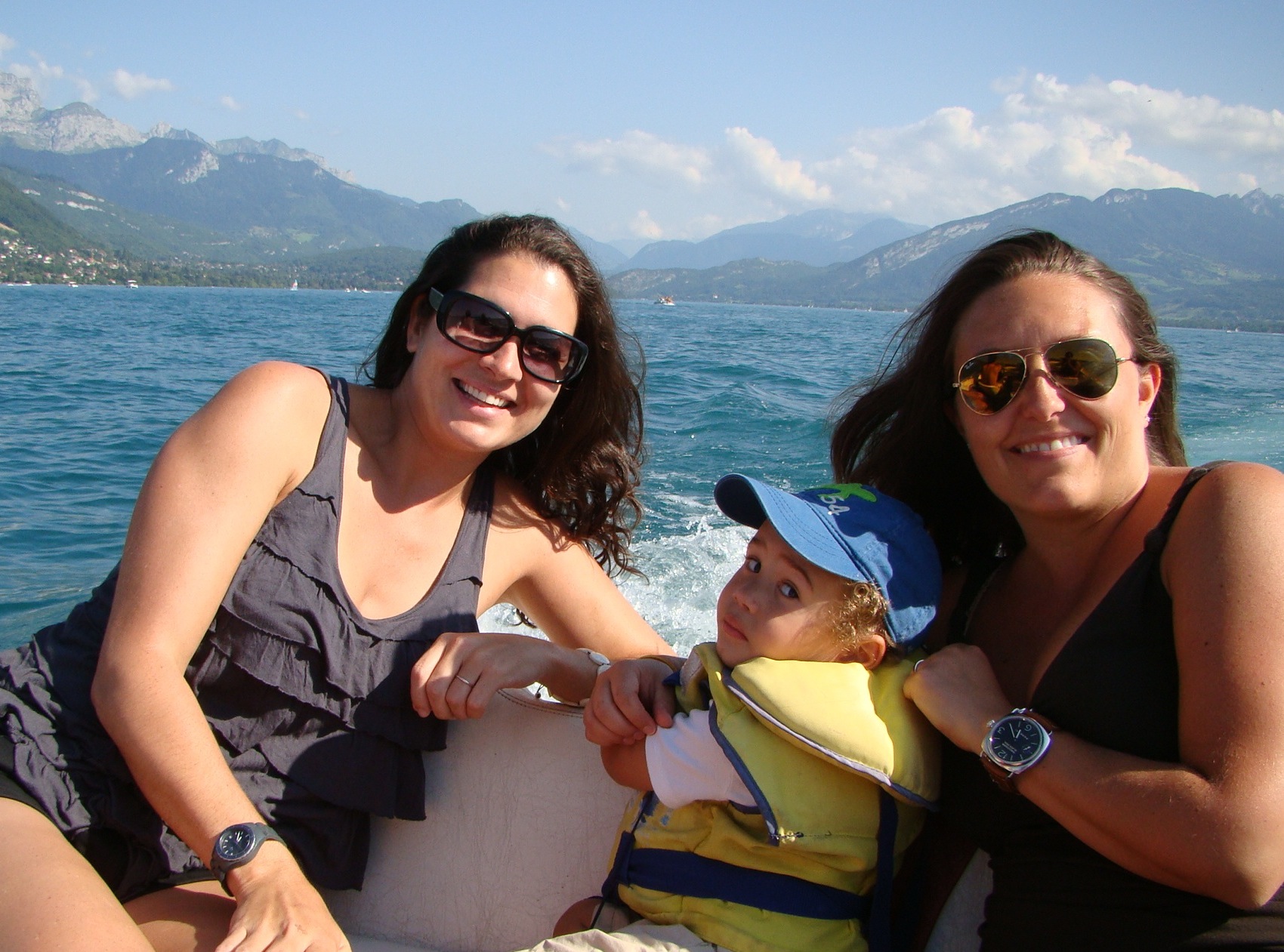 The next day (after having recovered), I was ready for our new and much tamer adventure – a day trip to Annecy. Dawda and Claire had wanted to see and it was only about 40 minutes away from Geneva. Annecy was recently among the bidding cities for hosting the 2014 Winter Olympics but things didn’t pan out. Nonetheless this town still had tons to offer from its historic medieval center to crystal clear canals, to its neighboring lake and surrounding Alps. Annecy’s charm was impressive and we all concurred. But what really drew us was the turquoise lake and the numerous water/boating activities at hand. We opted for the small engine boat for an hour which paid off handsomely. Dawda drove us out in the middle of the lake and we absorbed the panoramic view of mountains and the distant Annecy dock. This also seemed like the perfect spot to take a dip in the amusingly clear water, so Dawda and I jumped in. The ladies stayed on the boat with Aden and shot plenty of “film” of the scenery. Olympics or no Olympics, Annecy is still a gold medal town in its natural splendor and the bon vivant attitude it inspires.