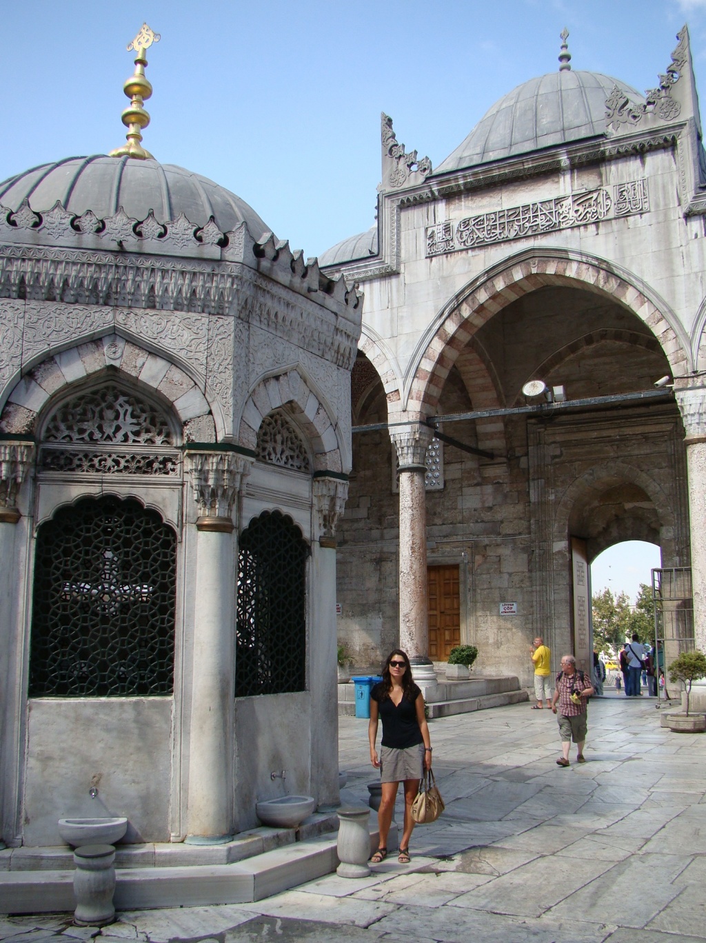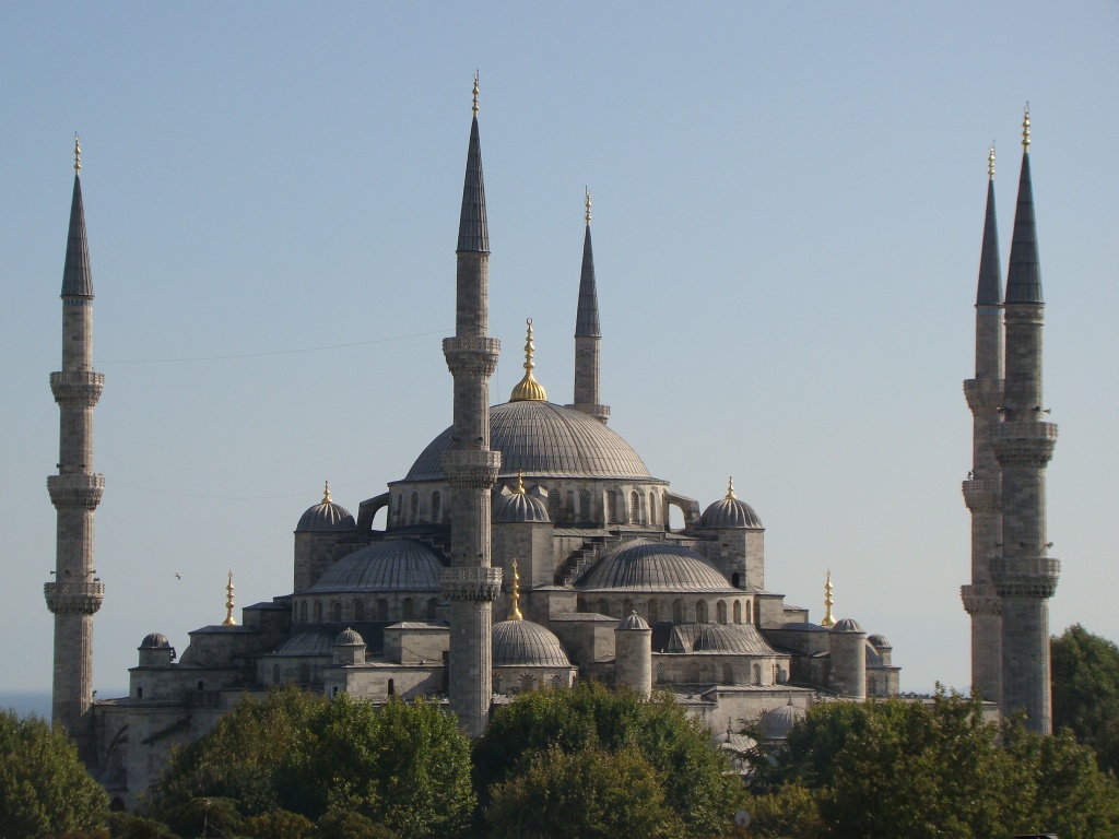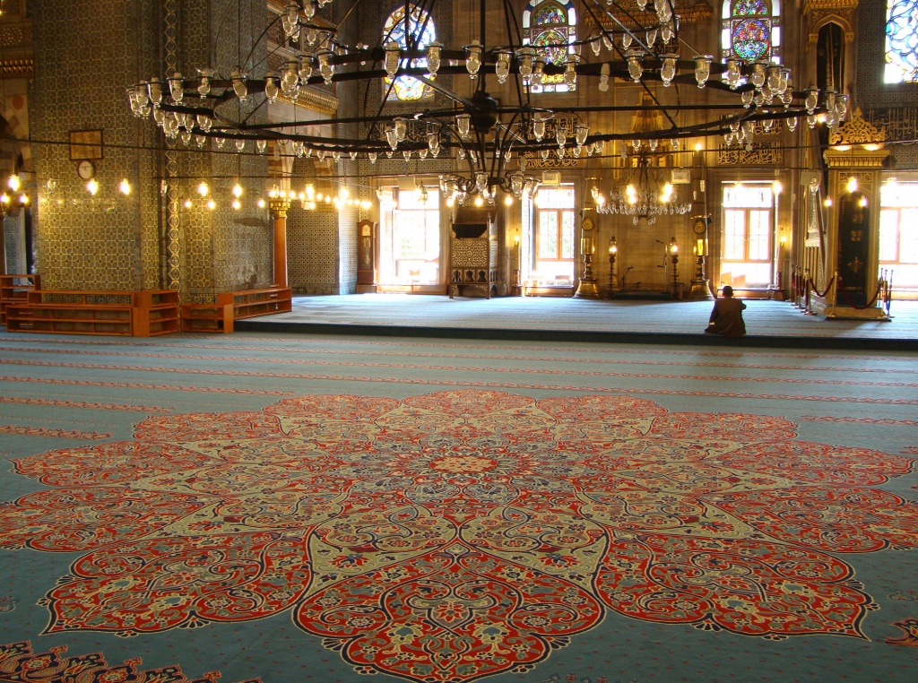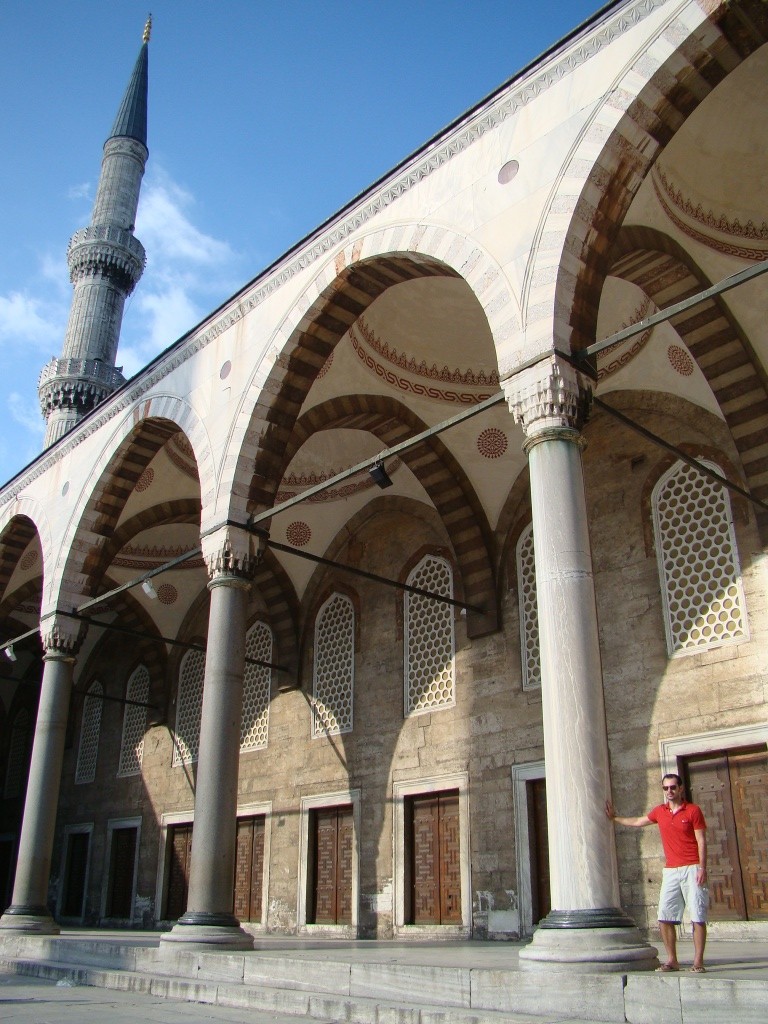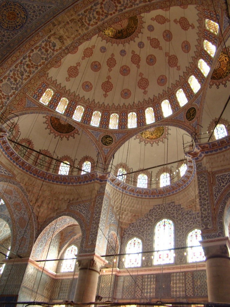 Next, we made a move directly south to the Blue Mosque as it became known due to its 20,000 blue ceiling tiles. The mosque was built under Sultan Ahment‘s reign who wanted it to surpass the magnificence of Hagia Sophia (which he failed to do). We arrived just as the call to prayer had commenced and so waited (in the mosque’s courtyard), until prayer services ended. Then, along with hoards of other tourists we stormed into the mosque to capture our pictures. Blue tiles stood out but did not exceed our expectation of an entirely “blue” mosque. Perhaps the mosque’s real name (Sultanahment Camii), would have kept our expectations in check. Nonetheless, the “Blue Mosque” appeared another architectural marvel with beautiful interior detail.