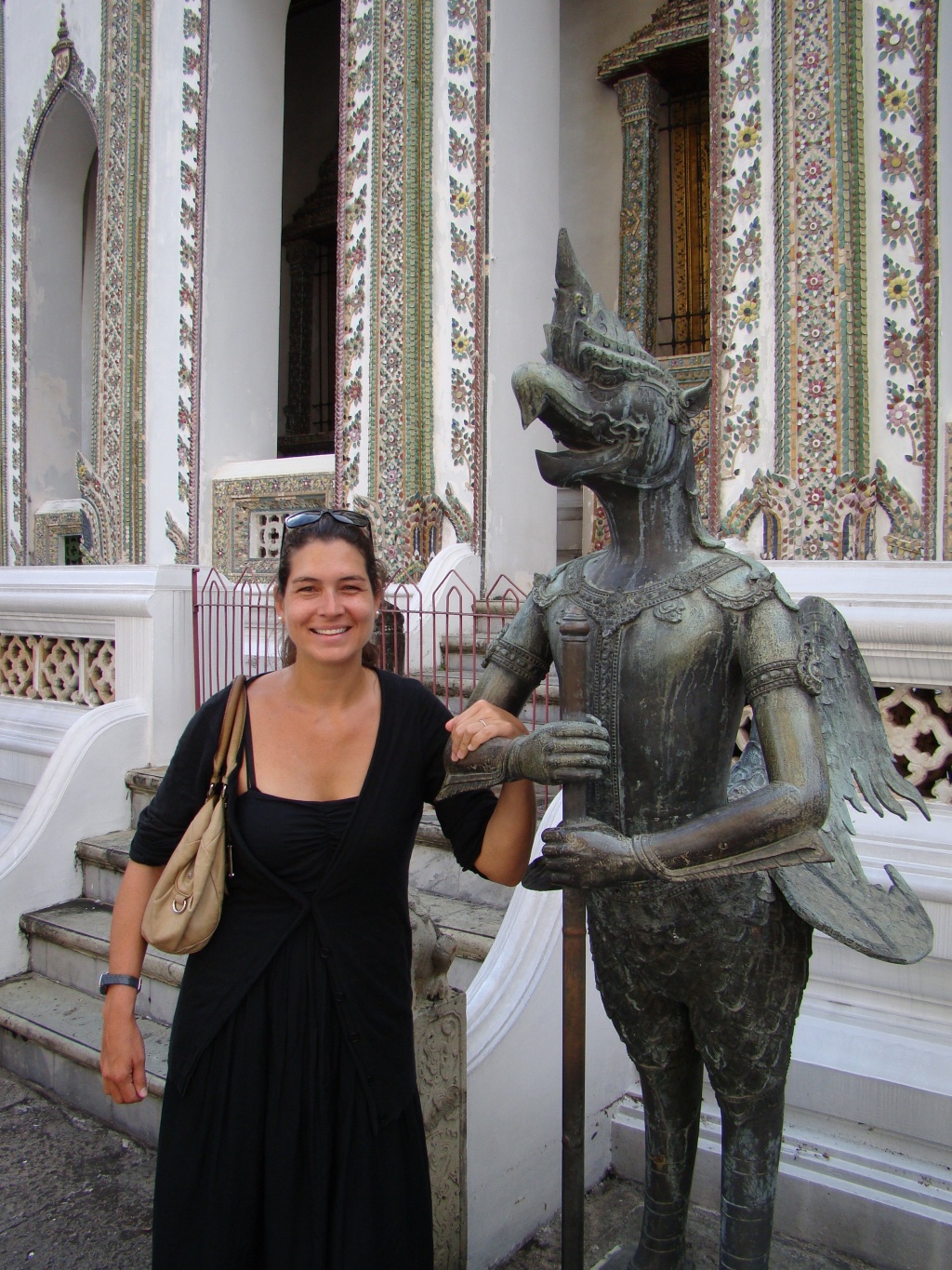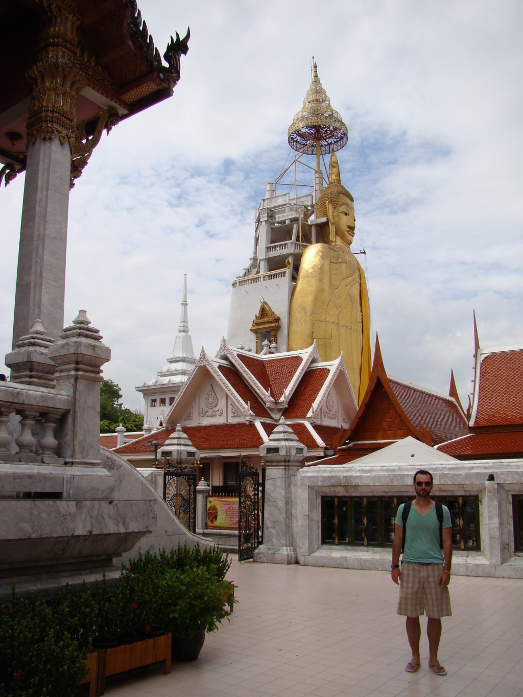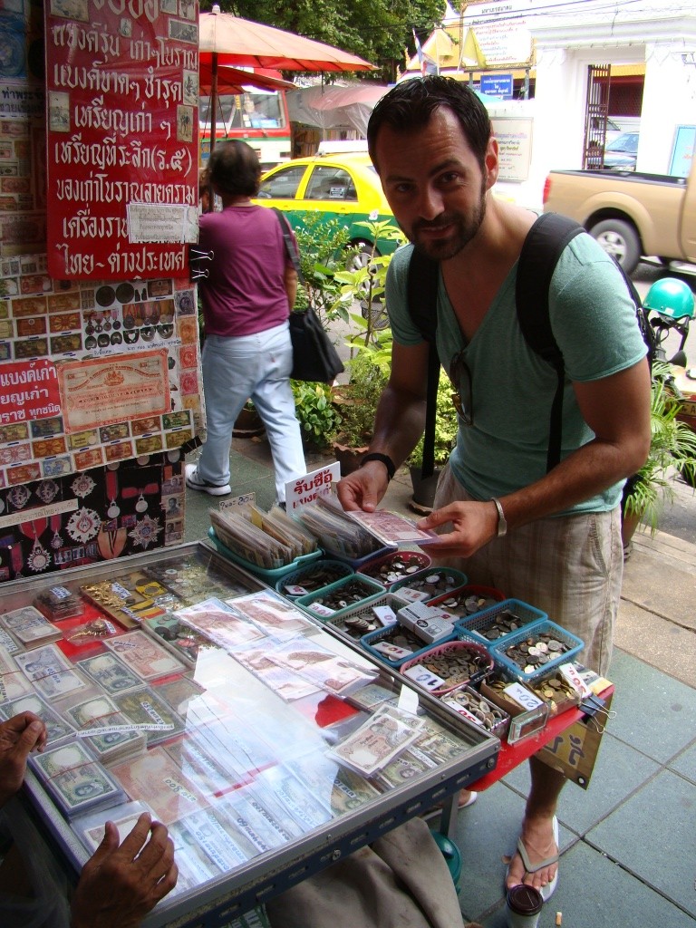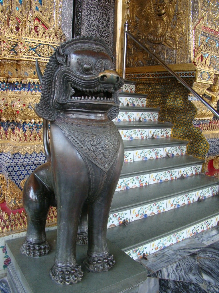 The next day we set out sightseeing and started with the Wat Mahathat, one of the oldest shrines and headquarters for the monastic order of Thailand. Along the way we stumbled upon a series of street vendors of which a couple specialized in numismatics (my kind of crew). Then it was on to the Standing Buddha, a 100-foot tall statue (of Buddha), significant for being a place of homage. From there our tuk tuk weaved through traffic and brought us to Wat Saket/Golden Mount, another Buddhist temple built in during the 18th century – from there we enjoyed views of Bangkok’s expansive layout, a mix of modern sky-rise towers (businesses and hotels), temples and low-rise residential buildings. The next stop on our tuk tuk ride was the Grand Palace, an enormous complex established in 1782 as the royal residences, throne halls and various administrative buildings. Numerous temples, halls, statues and monuments comprised the incredible assortment of richly decorated buildings. Rich as in what appeared to be thousands of decorative tiles or pieces that can truly be appreciated in close proximity. From a distance the appearance was still magnificent but the level of work and craftsmanship becomes intimately evident up close. The vast array of colors also played to my delight. The other significant factor was the inclusion of mythical animals as part of the Buddhist faith – monkeys serving as guardians decked out in traditional warrior gear. Several murals depicted these intrepid warriors in various battle scenes. And then there’s was the Emerald Buddha temple or Wat Phra Kaew. Considered the most sacred Buddhist temple in Thailand, it houses the statue of Emerald Buddha (actually carved out of a single jade stone). It’s symbolic of Buddha’s ascension into Nirvana and no-one is allowed to touch the jade statue except the Thai King who changes Buddha’s outfit three times a year based on the seasons (for good fortune).