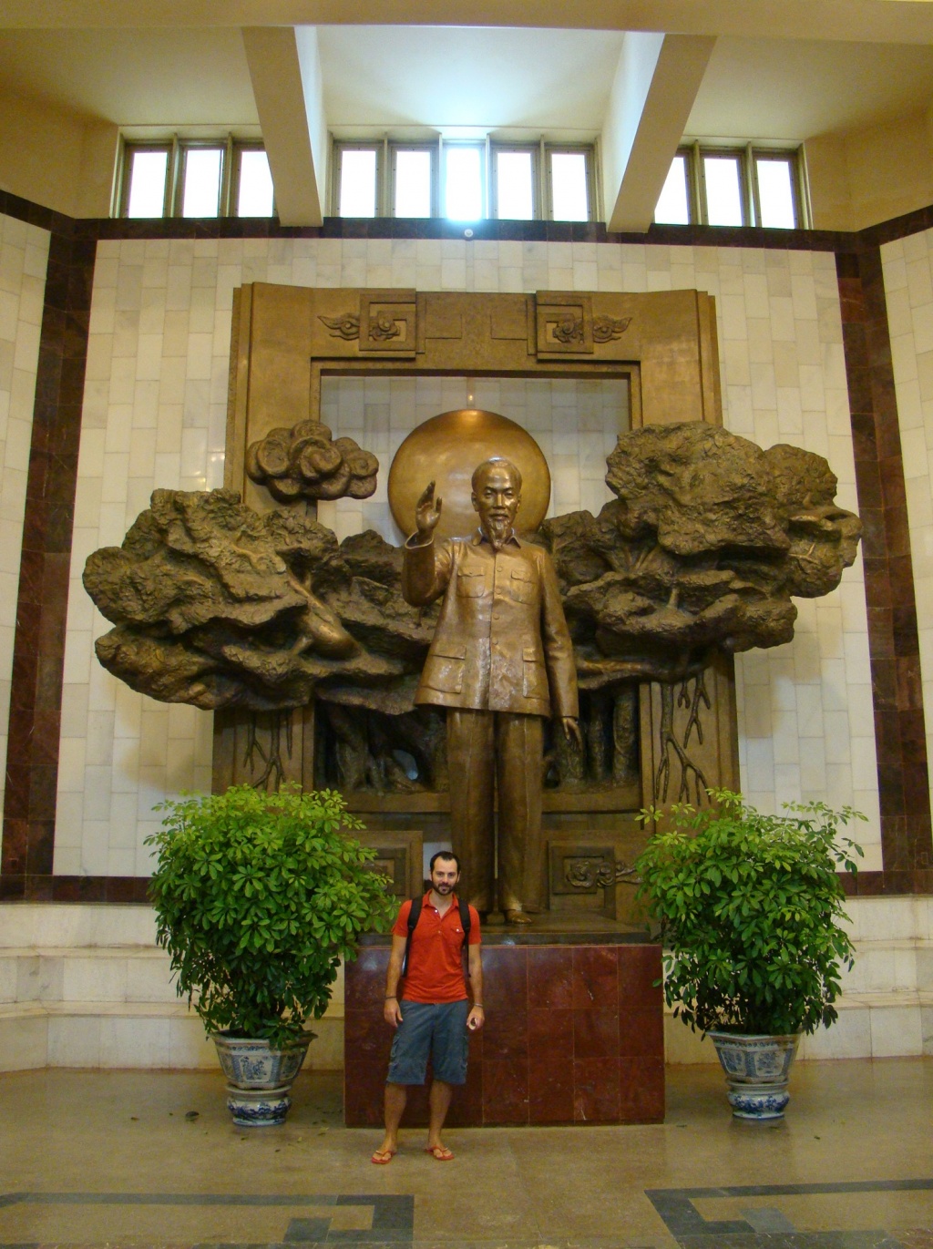By morning the rain was gone but heavy humidity greeted us as we embarked on a walking tour of the city. We identified a few key sights which turned out to be within walking distance from our hotel (located in the Old Quarter). We started with the “can’t-miss” Ho Chi Minh complex which comprises a museum (dedicated to him), one of his houses, the mausoleum and other landmarks. Unfortunately the embalmed body of Uncle Ho (as he is referred to here), was not in the mausoleum – it gets sent to Russia each year between Sept – Dec for maintenance. The museum housed a rich exhibit on Nguyen Sinh Cung (Ho Chi Minh before he adopted his new name which means “bringer of light”). The man lived a long and interesting life – he spoke several languages – studied & lived abroad in various countries and when he returned to Vietnam after 30 years, he became the leader of the communist party and liberator of the country from colonial rule (the French had colonized Vietnam in the late 1800s). He ruled the country until his death in 1969 so he was not alive by the time the Vietnam War’s ceasefire was declared in 1973 (and US forces pulled out). But his dream of a re-unified Vietnam prevailed. And today his face is just about everywhere and on everything around here.