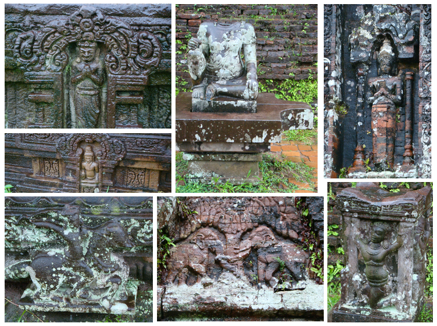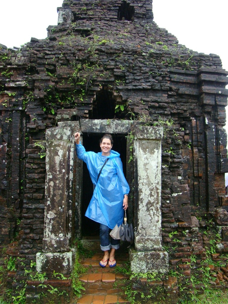 For the next day we had arranged an 8am pick-up (private car), for a trip to My Son to visit the Champa Hindu Temple ruins. Constructed between the 4th – 13th centuries, the temple complex was (and still is), regarded as engineering marvel (as no mortar was utilized). The 1-hour drive through the countryside painted a clear picture of rural life. At times the landscape seemed to stretch indefinitely from rice field to rice field, some occasionally tended to by lonely farmers sporting traditional conical straw hats. Although accompanied by heavy rain for the entire drive, upon our arrival at Champa luckily only light drizzle stayed with us during our visit. Accessible only by footpath, the red brick temples emerged from the misty jungle making for an incredible sight and surrounding. It was one of those “Indiana Jones” moments of uncovering a hidden gem. Still alive today were some of the delicate details adorning the temples – sculptures of various deities, spiritual characters, priests, etc. We had fun identifying them and putting Brigitte’s camera to work.