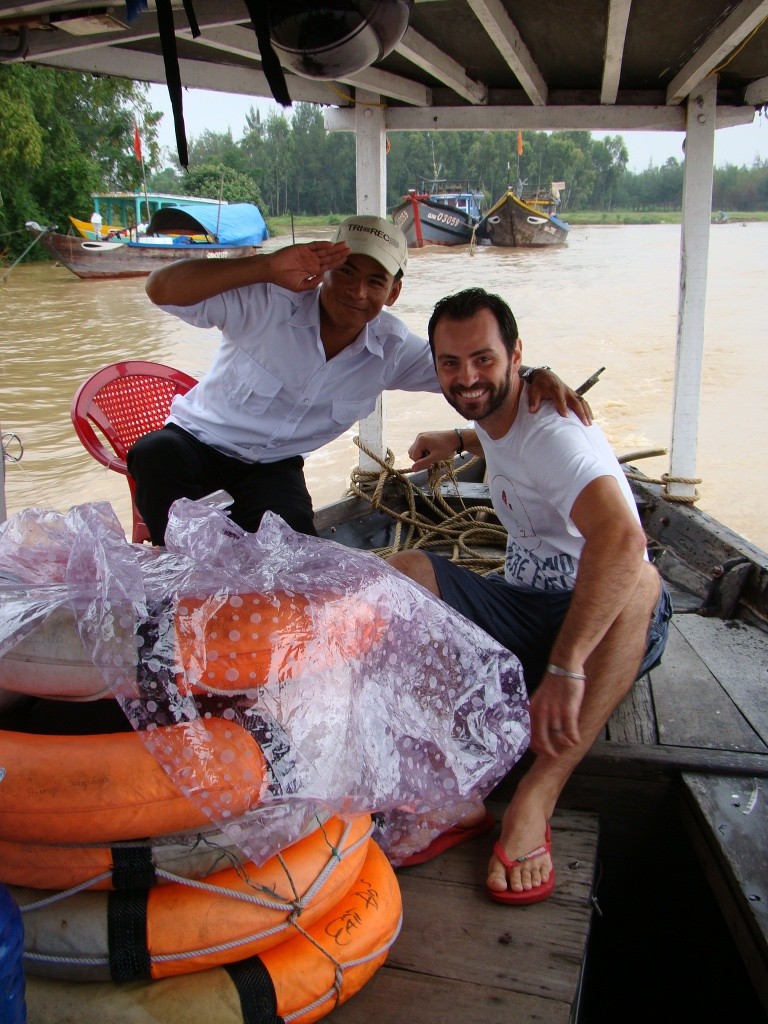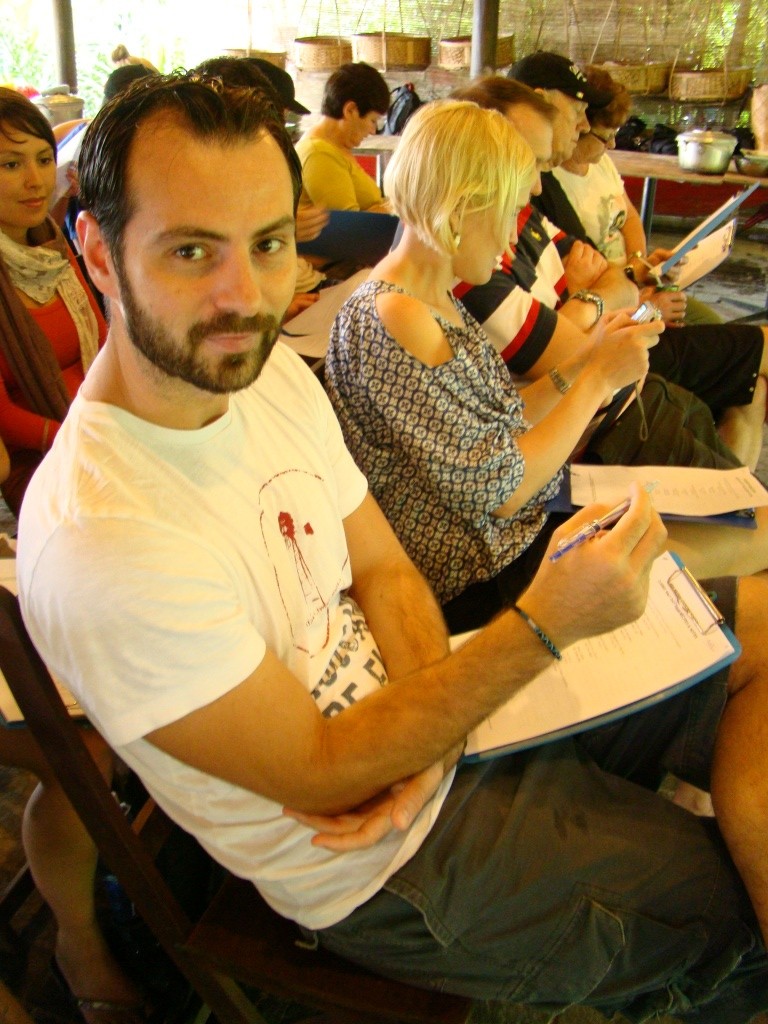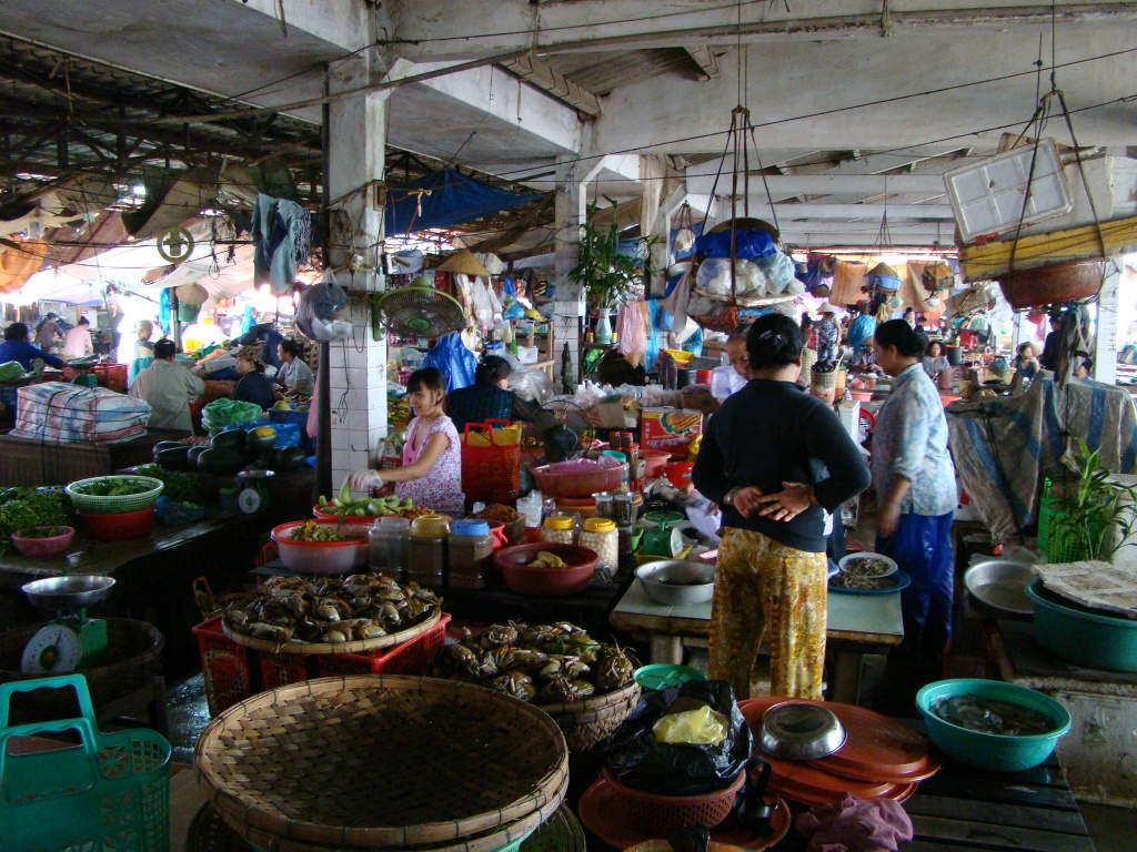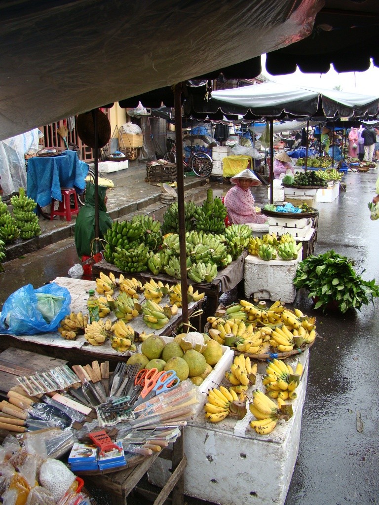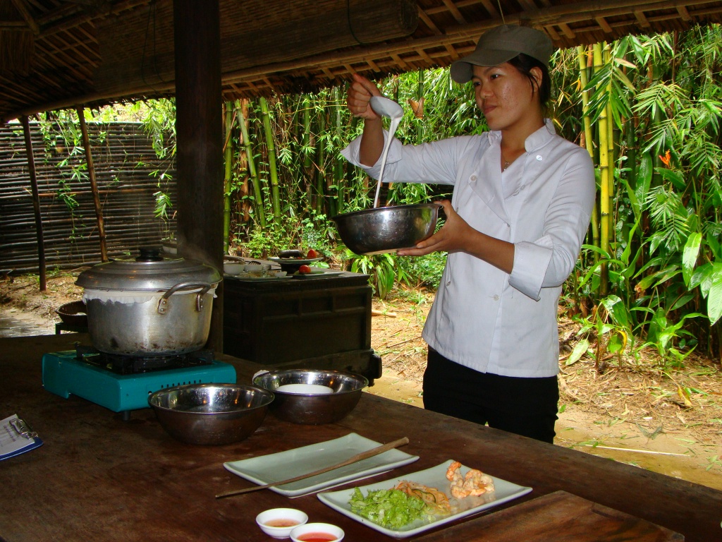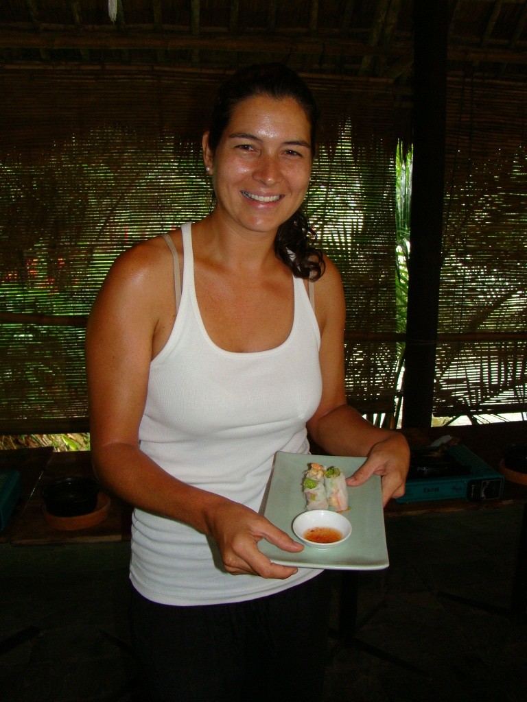 The following day was no different in terms of the forecast – more rain and cloudy skies. But on the agenda was the cooking class we had signed up for during our dinner at Hai Cafe. The class started out with a trip to the market where we were introduced to numerous exotic vegetables and fruit. Then came the spice and the fish part of the market. Now I know what a pile of live eels in a medium size bowl look like. The vibe of the entire place was incredible with each vendor neatly tucked behind his/her counter either preparing something or trying to lure in customers. From there we enjoyed a boat ride up the Thu Bon river to the cooking class complex. We had a solid group on hand with a number of Australians comprising the majority. This was great as it helped us gather intel on our upcoming trip to the lone continent. But more importantly we started cooking in high gear with some fresh spring rolls, a shrimp/pork pancake and an eggplant/veggie concoction prepared in a clay pot. Most interesting was the rice paper, an integral part of Vietnamese cuisine. To make it is a simple yet patient process requiring 7+ hours. We bypassed this part thankfully (it had already been done for us), and skipped to steaming it turning it from liquid form into a very elastic solid. It’s amazing how such a simple key component can add so much dimension – we loved our spring rolls! And we also loved our afternoon – learning to prepare new dishes, and engage with cool people.