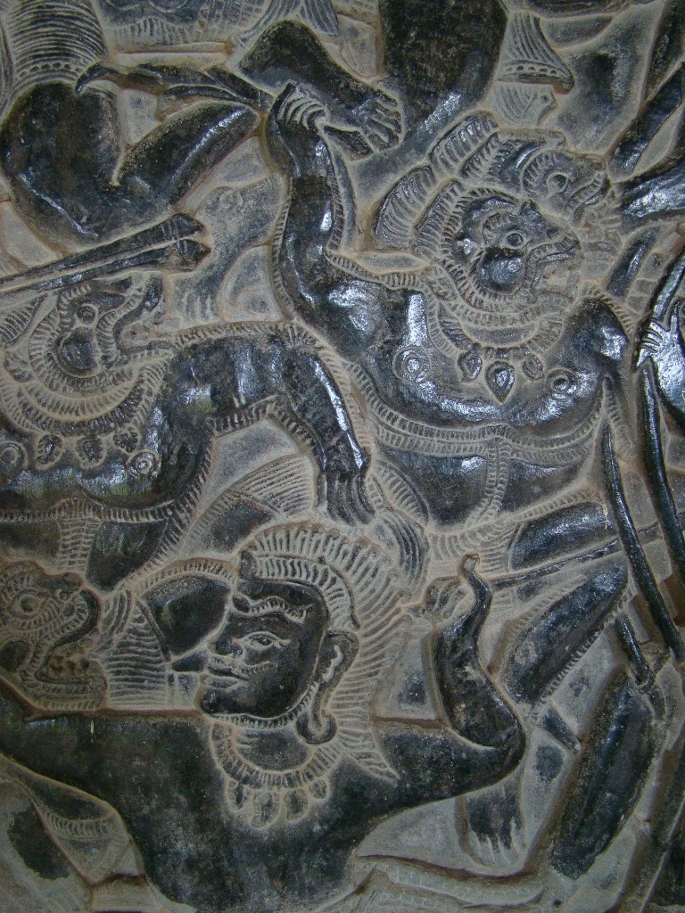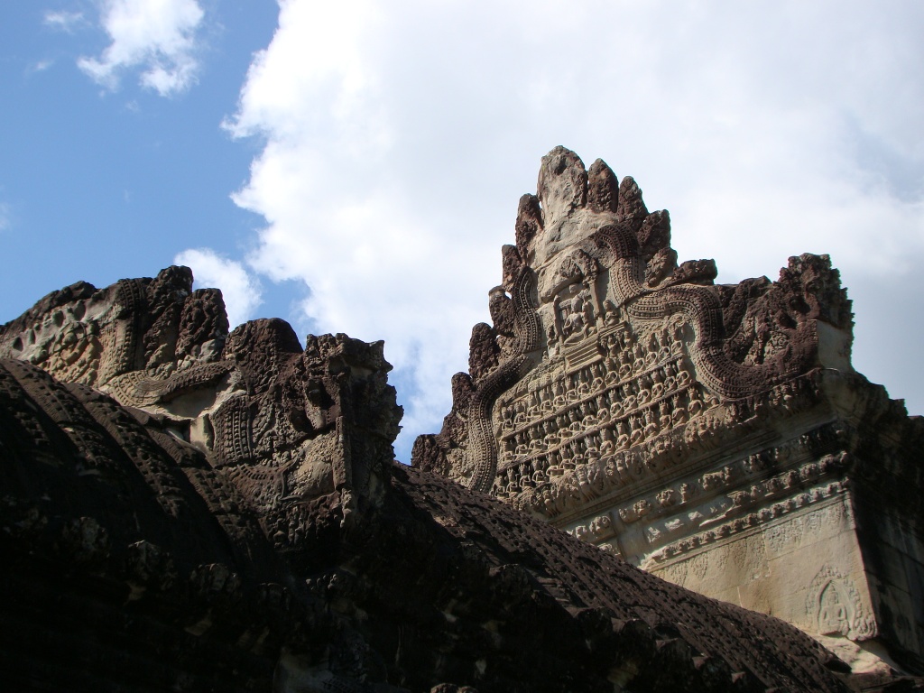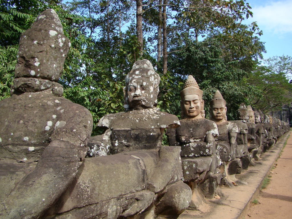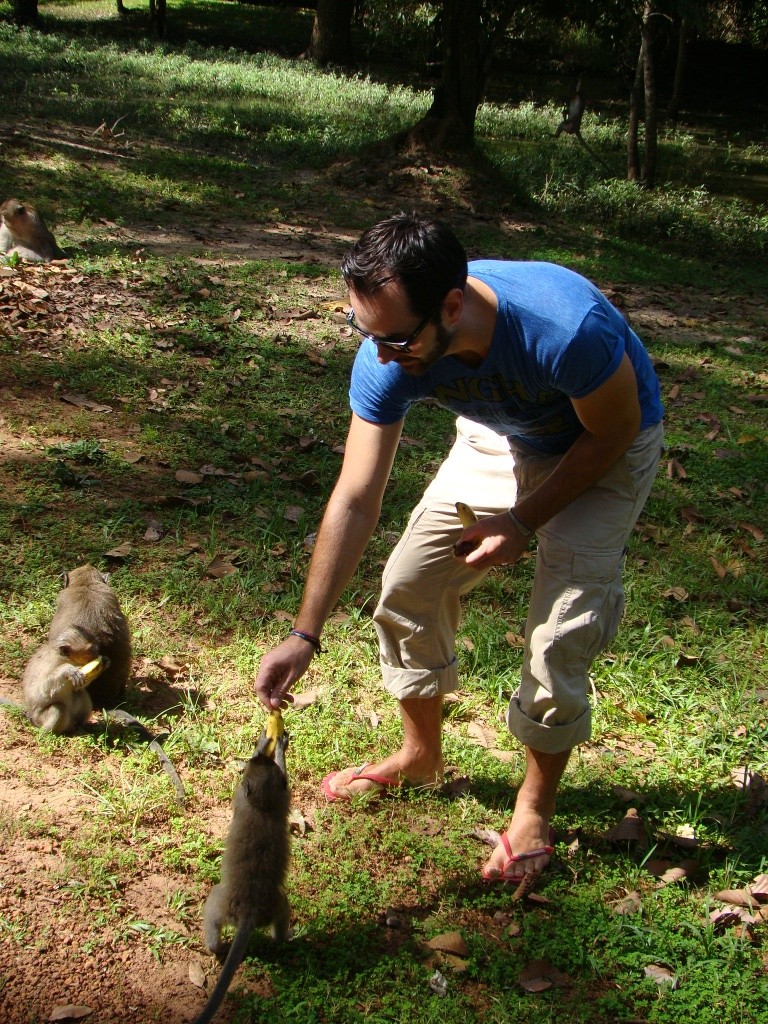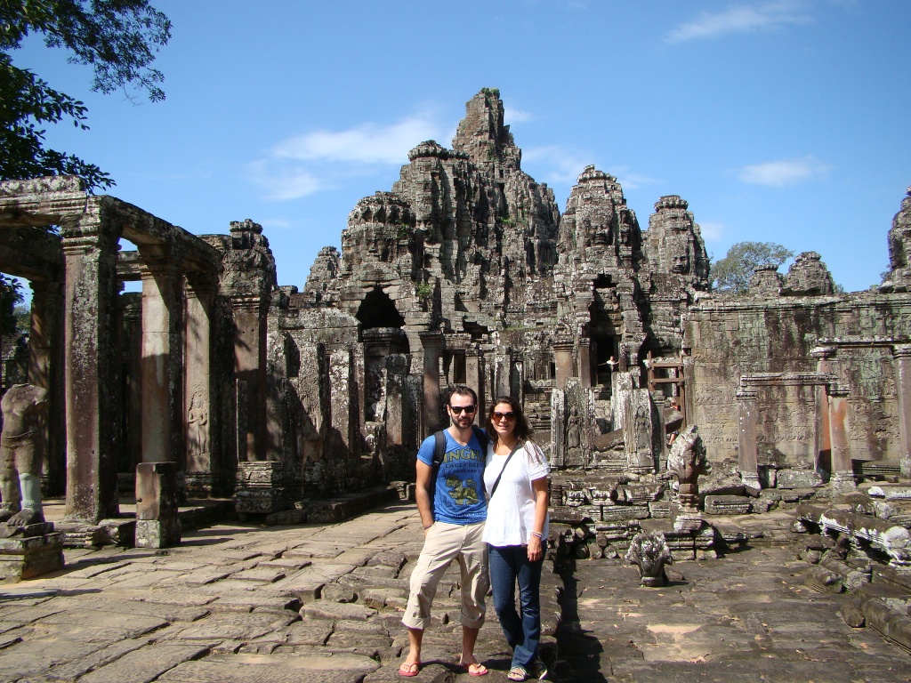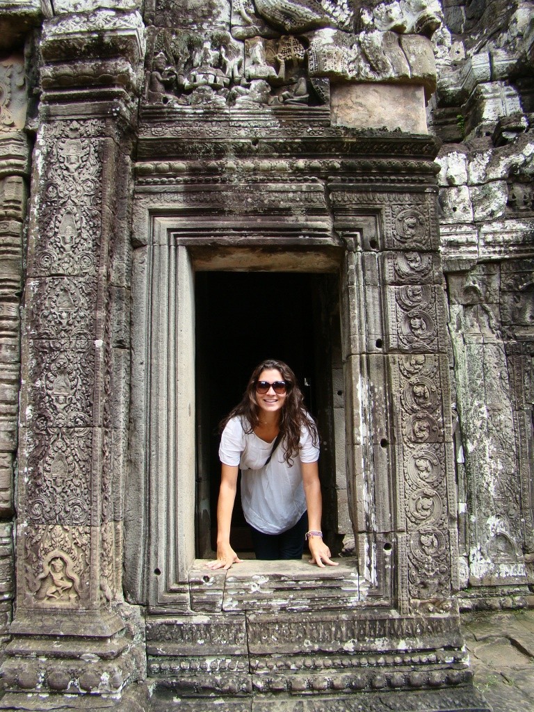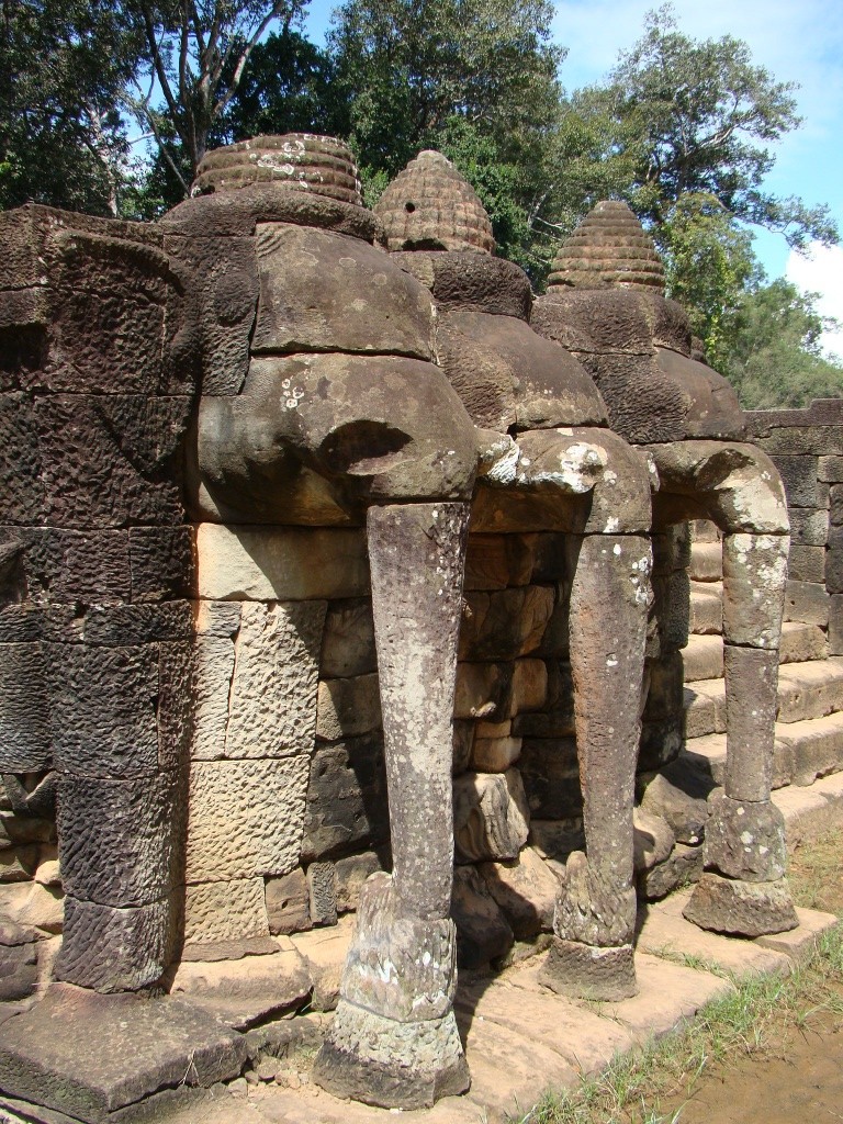 Chameroun (or Mike), picked us up at 8:30am the following morning and we tuk tuk’ed our way to the Angkor complex. Unknown to us was the fact that Angkor Wat is just one of over a thousand temples built by the Khmer Empire during their rule of Southeast Asia between the 9th and 15th centuries (the empire spanned across modern day countries like Thailand, Laos, Myanmar, Malaysia and Vietnam). The descendants of the Khmer people are present day Cambodians and the legacy of the Angkor temples speaks of their glorious past. We also quickly learned that we would be seeing several temples in our 2 day tour, not starting with Angkor Wat. Instead we kicked off with the Angkor Thom complex (meaning “Great City”), which houses the amazing Bayon temple (or Temple of Beaming Faces”), among other galleries and smaller temples. En route we passed by a small colony of roadside hungry yet friendly monkeys and just couldn’t resist – they were too cute. So we stopped and fed them some bananas which they quickly snatched from my hand. Then it was on to the heavily guarded South Gate which offered a sample of what laid ahead. Two rows of warriors or guardians carved from stone lined the road that led up to the elaborate South Gate – a massive head centered in the middle of the gate is said to be symbolic of the Khmer King (Jayavarman VII), who commissioned the “Great City” during the 12th century. Brigitte started her photo session while Mike gave us more historical background on the city and temples. He also told us that Bayon has 51 towers each with 4 faces, the same one we saw on the South Gate. Whether the faces represent the king or Buddha is still debatable between historians and archeologists but undeniably the faces of Bayon made for an awesome sight. Being in the presence of vestiges from such a historic powerhouse of an empire felt empowering, spiritual and jolly! After climbing down from Bayon, we made our way past the Elephant Terrace, a 900 foot long terrace taking its name from the elephant carvings on its walls. According to Mike this is where elephants used to get trained during the days of the Khmer Empire. The impressive terrace also comprised other carvings – lion headed guards (singhas) and mythical bird/man warriors (garudas).