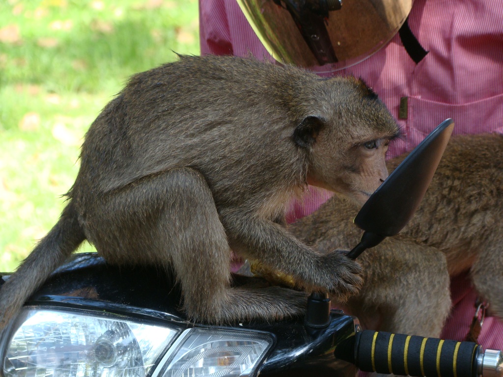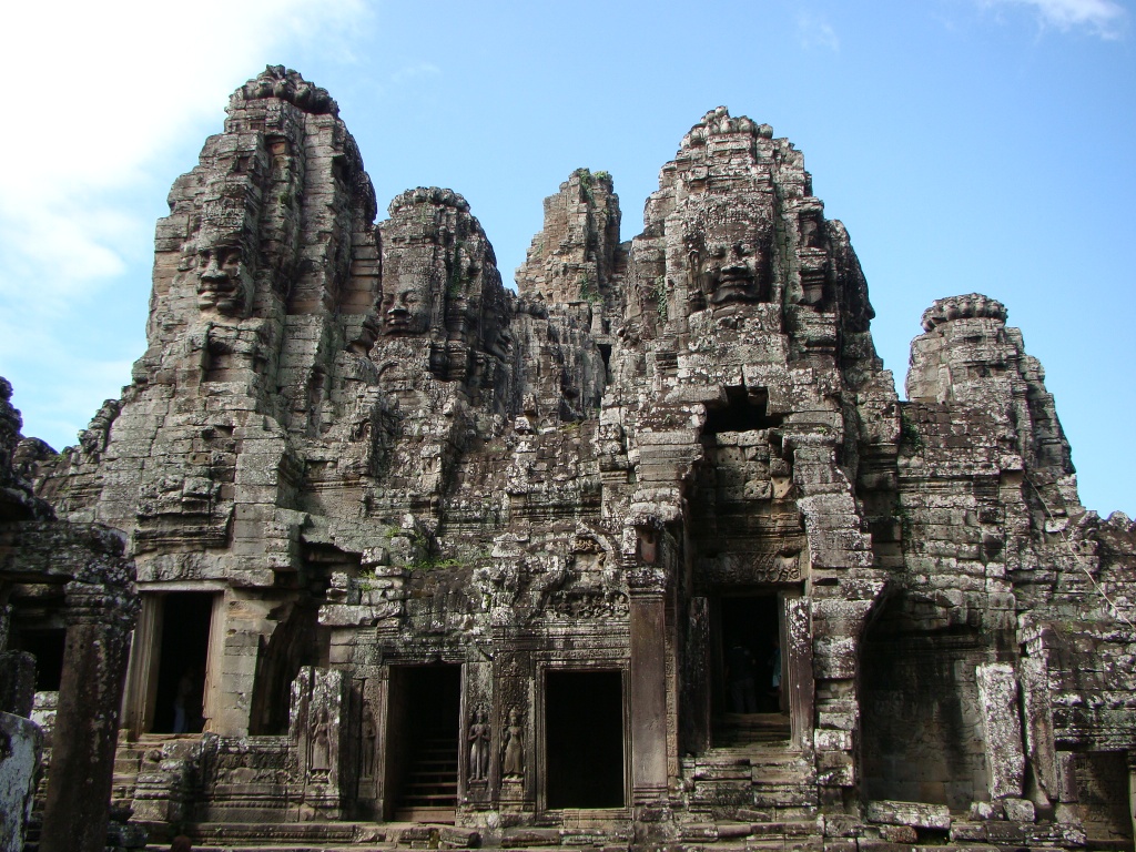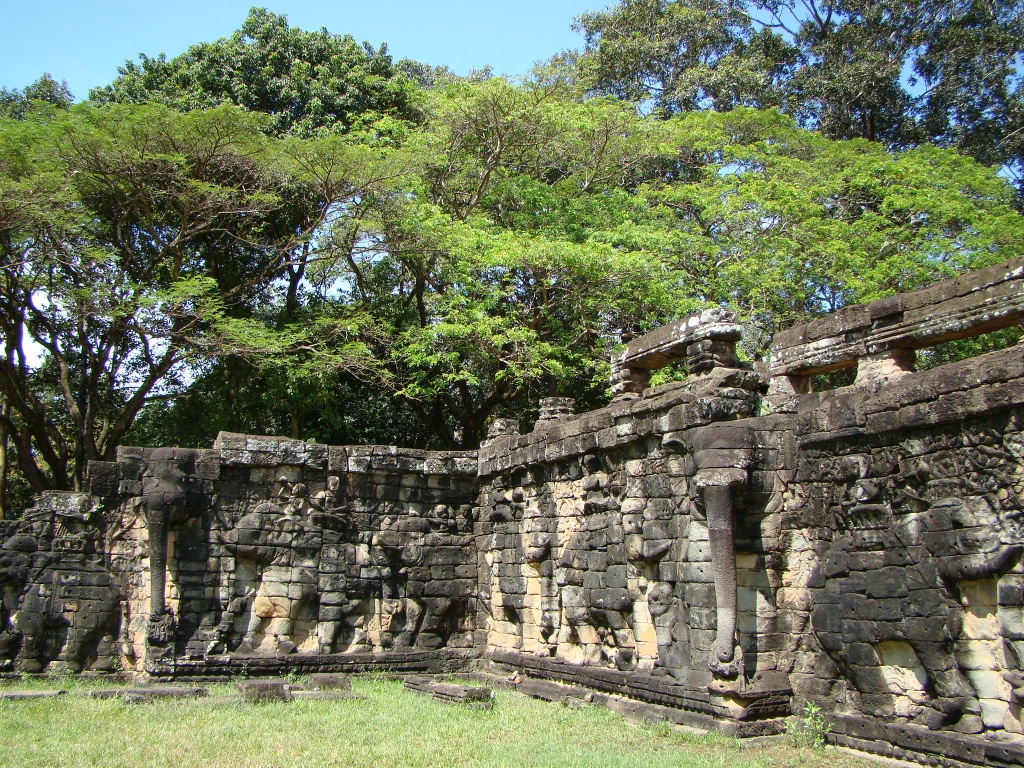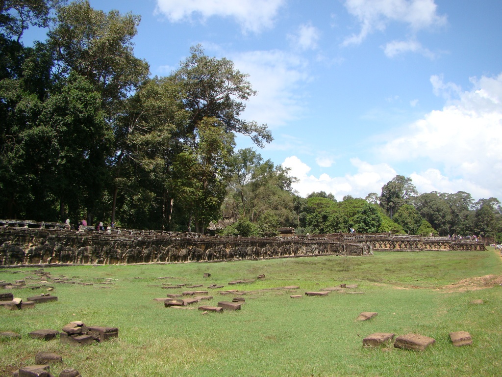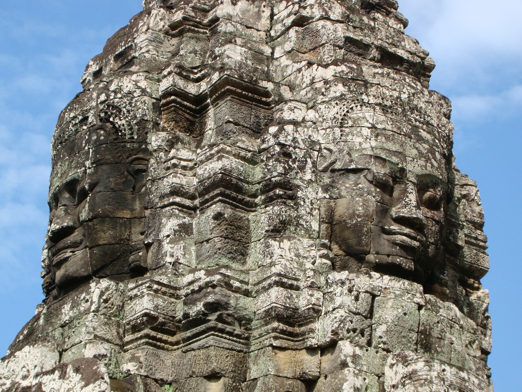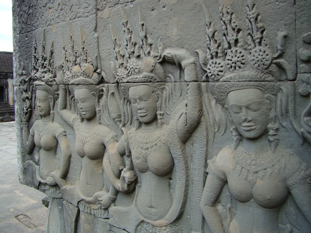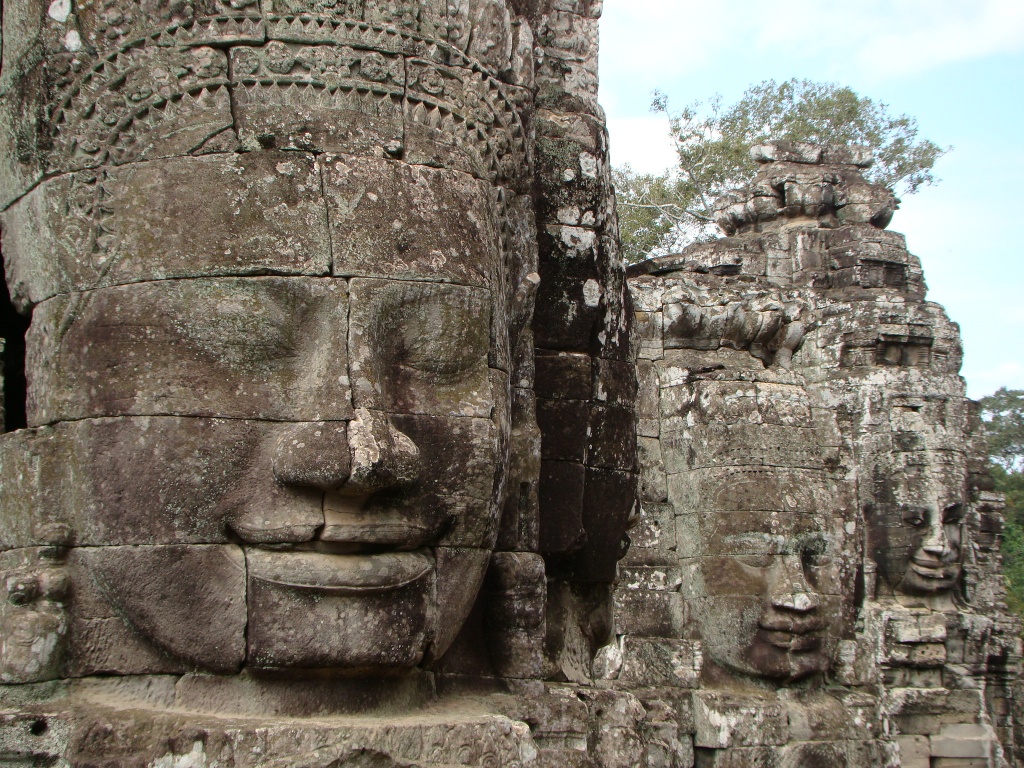 Chameroun (or Mike), picked us up at 8:30am the following morning and we tuk tuk’ed our way to the Angkor complex. Unknown to us was the fact that Angkor Wat is just one of over a thousand temples built by the Khmer Empire during their rule of Southeast Asia between the 9th and 15th centuries (the empire spanned across modern day countries like Thailand, Laos, Myanmar, Malaysia and Vietnam). The descendants of the Khmer people are present day Cambodians and the legacy of the Angkor temples speaks of their glorious past. We also quickly learned that we would be seeing several temples in our 2 day tour, not starting with Angkor Wat. Instead we kicked off with the Angkor Thom complex (meaning “Great City”), which houses the amazing Bayon temple (or Temple of Beaming Faces”), among other galleries and smaller temples. En route we passed by a small colony of roadside hungry yet friendly monkeys and just couldn’t resist – they were too cute. So we stopped and fed them some bananas which they quickly snatched from my hand. Then it was on to the heavily guarded South Gate which offered a sample of what laid ahead. Two rows of warriors or guardians carved from stone lined the road that led up to the elaborate South Gate – a massive head centered in the middle of the gate is said to be symbolic of the Khmer King (Jayavarman VII), who commissioned the “Great City” during the 12th century. Brigitte started her photo session while Mike gave us more historical background on the city and temples. He also told us that Bayon has 51 towers each with 4 faces, the same one we saw on the South Gate. Whether the faces represent the king or Buddha is still debatable between historians and archeologists but undeniably the faces of Bayon made for an awesome sight. Being in the presence of vestiges from such a historic powerhouse of an empire felt empowering, spiritual and jolly! After climbing down from Bayon, we made our way past the Elephant Terrace, a 900 foot long terrace taking its name from the elephant carvings on its walls. According to Mike this is where elephants used to get trained during the days of the Khmer Empire. The impressive terrace also comprised other carvings – lion headed guards (singhas) and mythical bird/man warriors (garudas).