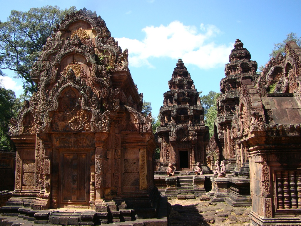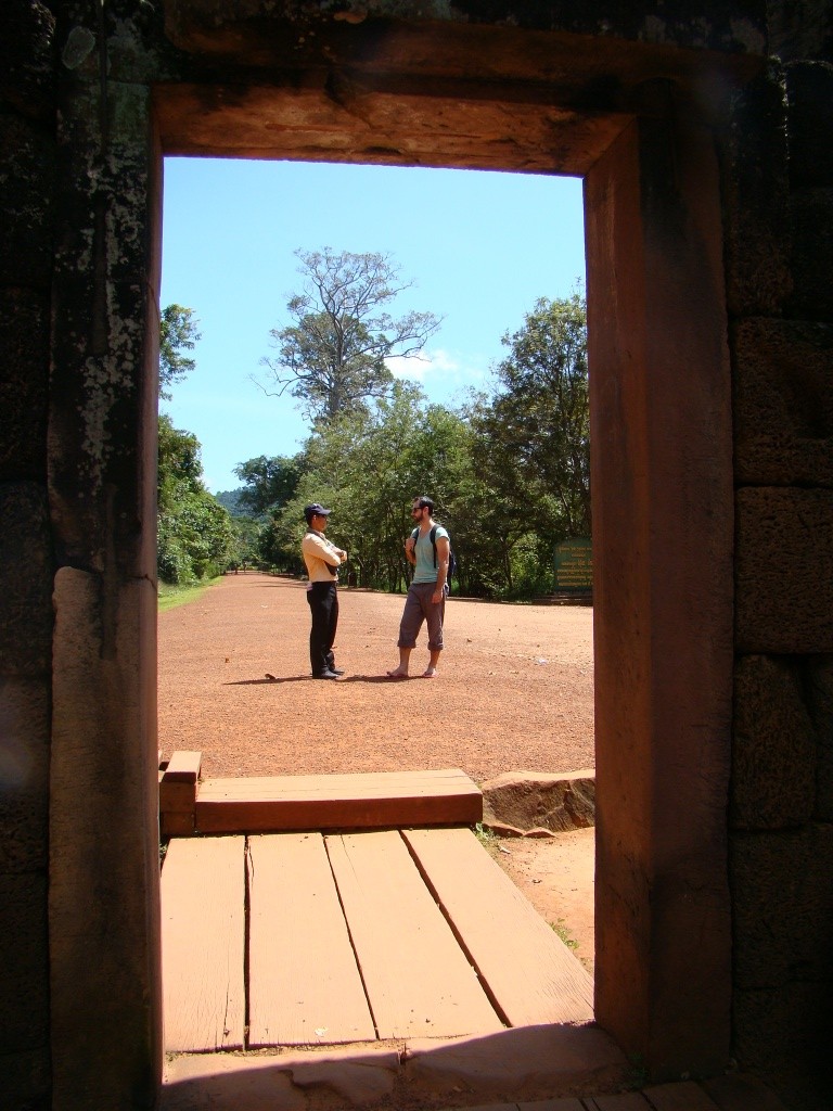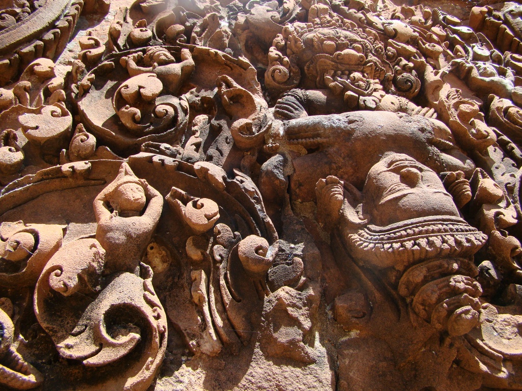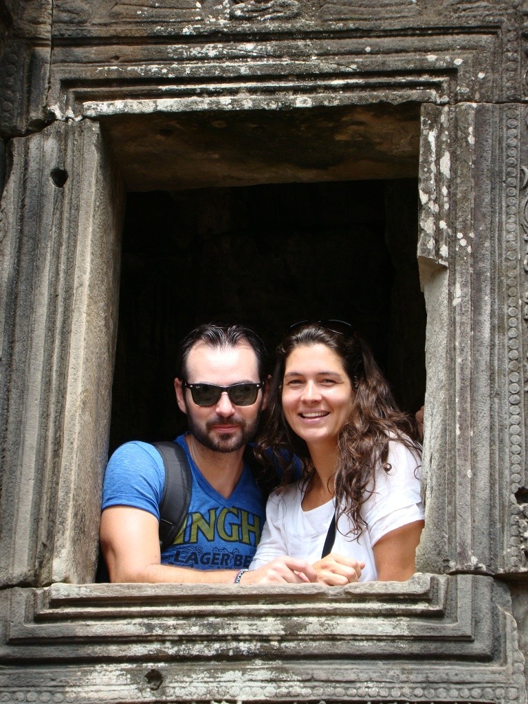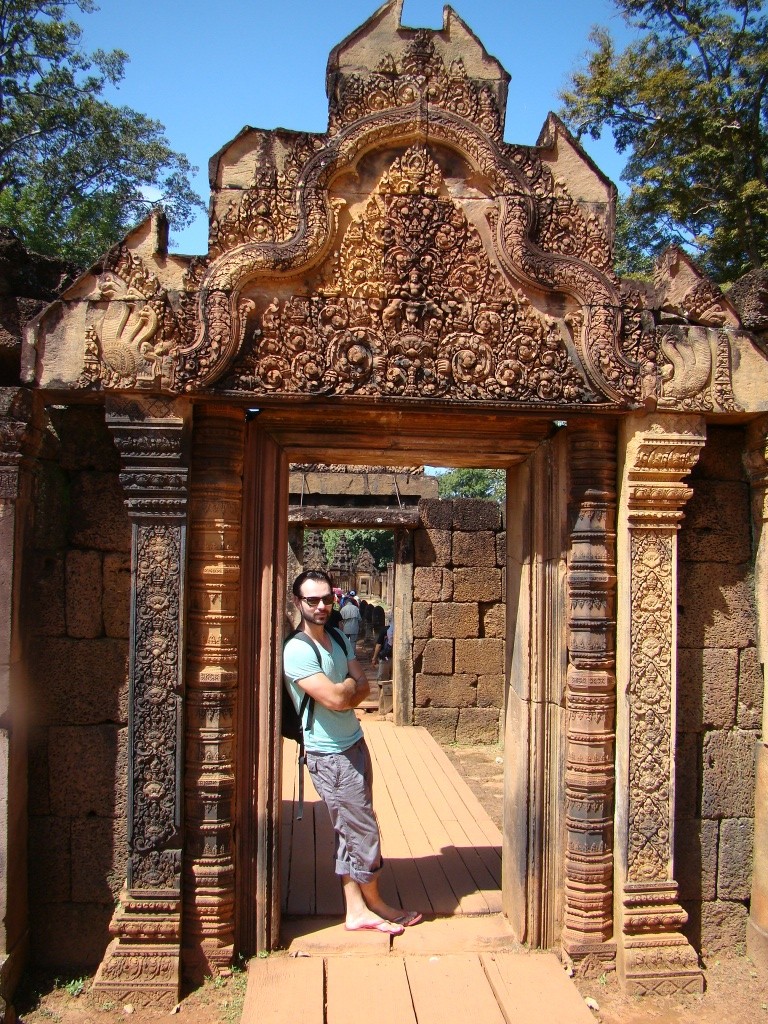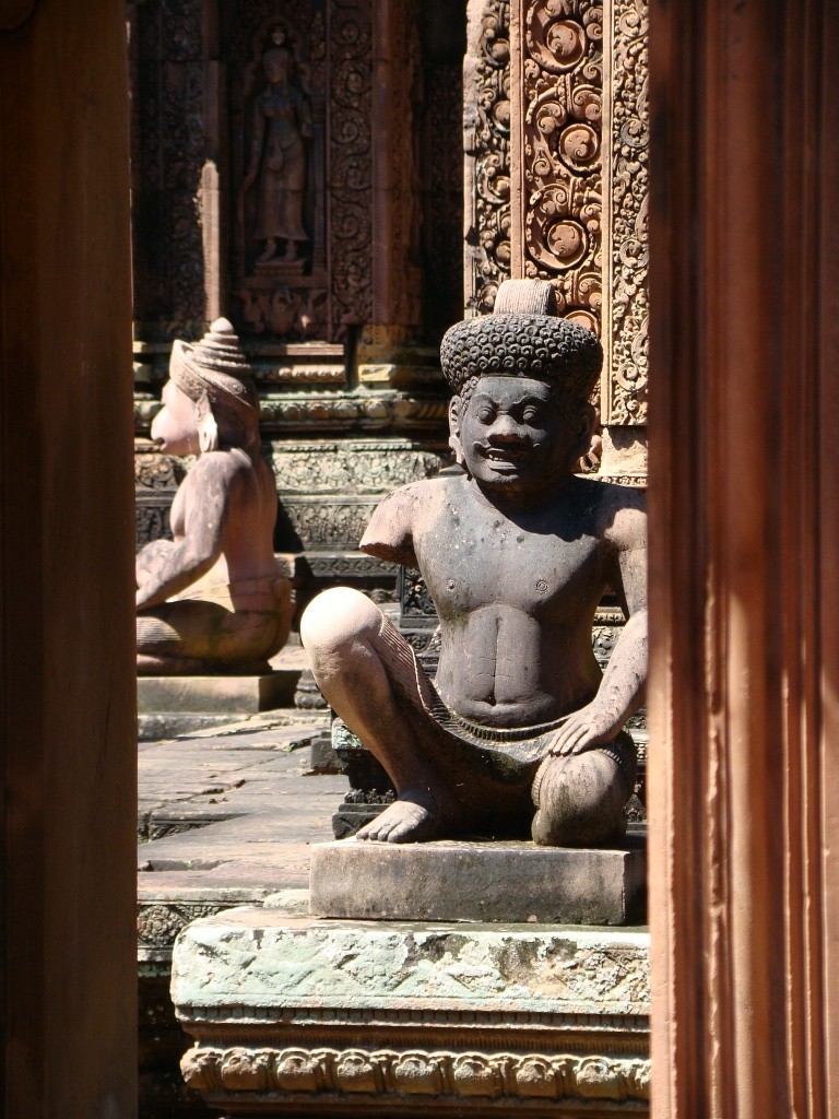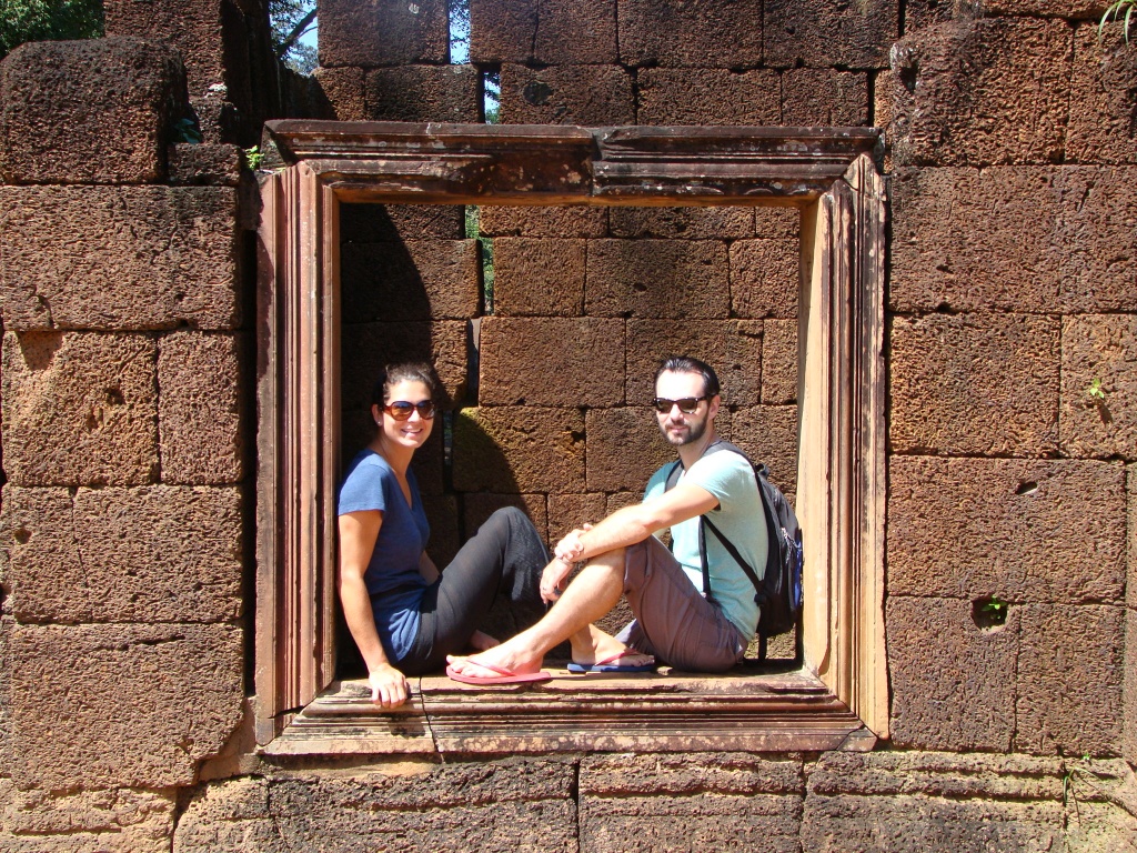Next was Banteay Srei or “Lady Temple”. It was similar to Pre Rup in its reddish color but that’s where the parallels ceased. Banteay Srei had one level only (ground level). As we approached it Mike stopped right in front of its gate and informed us about the elaborate carvings of Hindu deities (Shiva and Vishnu), depicted throughout the temple. The legends were animated as were some of the temple’s accents – the steadfast guardian monkeys and garudas on all four sides of temple’s center. But one of our favorite features were the picture frame windows, architecturally and artistically endowed. We had fun putting on some of our best poses while Mike snapped a few shots. The gentile Banteay Srei was yet another temple of impressive magnitude that totally wow’ed us.