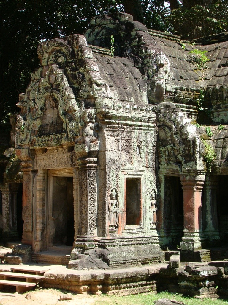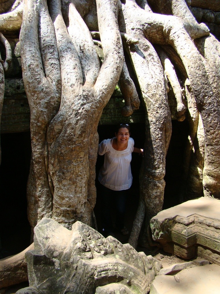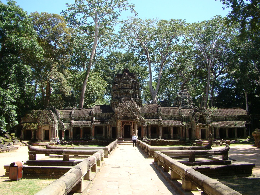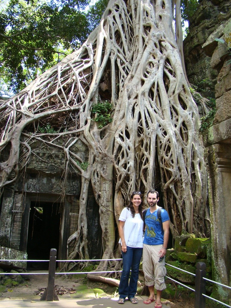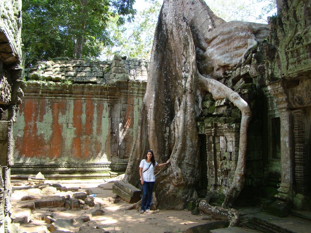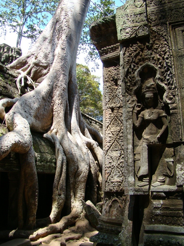 From Bayon we made our way past a couple of other temples (including the beautiful Takeo). Next it was on to Ta Prohm, made famous in the movie Tomb Raider. What’s amazing about most temples is their location. The entire Angkor complex lies on a 390 square mile area densely covered by forests (with intermittent pools, moats and rivulets), making for a magical setting. Going from one temple to another typically meant covering anywhere between one to several miles (which is why the tuk tuk came in very handy). Although on most occasions we had to walk from the tuk tuk through parts of the forest in order to access some temples. This was the case with the picturesque Ta Prohm, as we made our way by lush green vegetation and across a small body of water left over from the past week’s heavy rain. And then smack in front of us was Ta Prohm; the temple that seems to coexist with the silk cotton trees whose roots virtually grow on, through, and from various parts of the temple itself. What an amazing yet bewildering sight!
