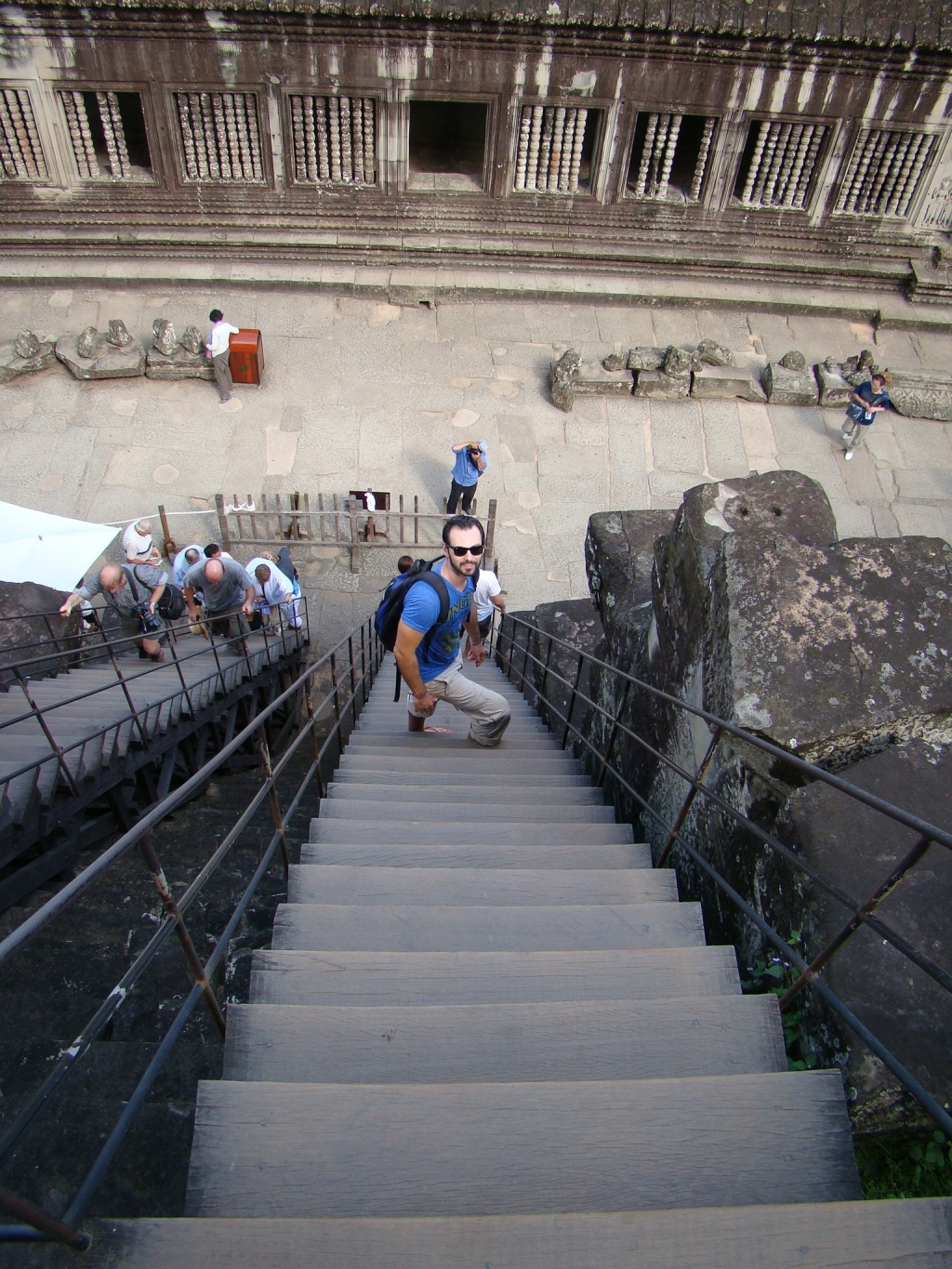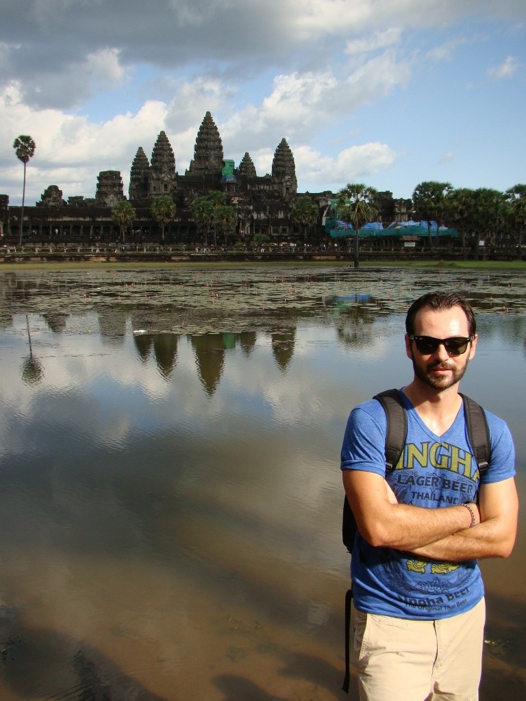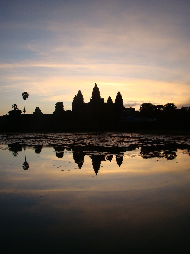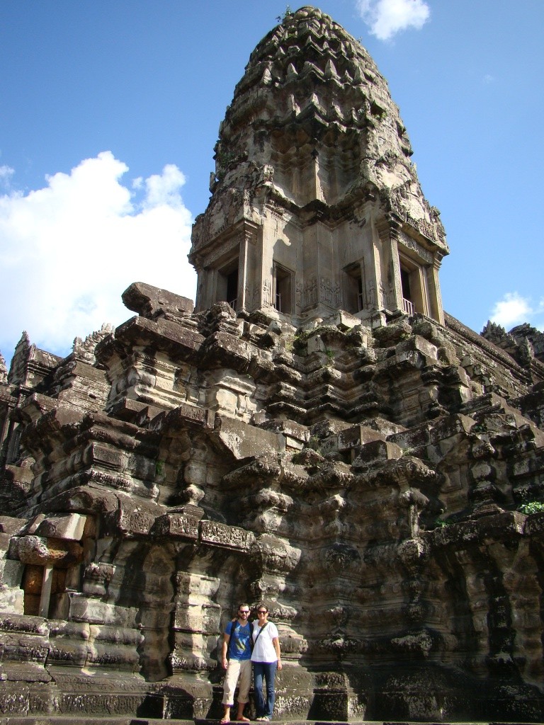 After lunch it was time to finally take on Angkor Wat (or “City Temple”). The ancient Hindu temple was constructed in the 12th century and dedicated to the god Vishnu. However as the Khmers later changed their religion to Buddhism, so the did the tones and accents on Angkor Wat. Today it still remains the largest religious building in the world – very true as it took us close to 3 hours to navigate it. We approached Angkor Wat from the East Gate (the back), which seemed peculiarly quiet with no-one in sight. Were we to have this marvel all to ourselves or was this just a selfish delusion (yup, a delusion it was – by the time we left there were hoards of people everywhere). As we entered the complex Mike dropped more knowledge about Angkor Wat’s architectural style, the meaning of its carvings, its galleries or levels and its westward orientation (not East as is the case with Buddhist temples). The immense structure served up a heaping platter of positive impressions. The raw architecture composed of sandstone and laterite with black and grey hues gave off a sense of antiquity. Close inspection of the erect towers (massive stones laid on top of stones without mortar), amplified the temple’s fortitude integrity. And the delicate polished carvings of Apsara dancers, deities and mythical characters completed Angkor Wat’s trifecta of subliminal multi-dimensionality. Brigitte and I walked up the temple’s highest level and explored the square-shaped grounds. Seeing a couple of young monks up there confirmed the temple’s authentic pulse, as opposed to just serving as an attraction to curious tourists (about 2 million annually). As we further walked about its grounds, Angkor Wat’s appeal seemed to have permanently set into our veins. It’s the kind of place you keep giving looks to over your shoulder as you walk away. For us it meant exactly that plus a return trip early the following morning to watch the sun rise over it. 5:20am and surrounded by hundreds of other camera armed “insomniacs” is what we had got ourselves into – unforgettable in many ways and well worth it!