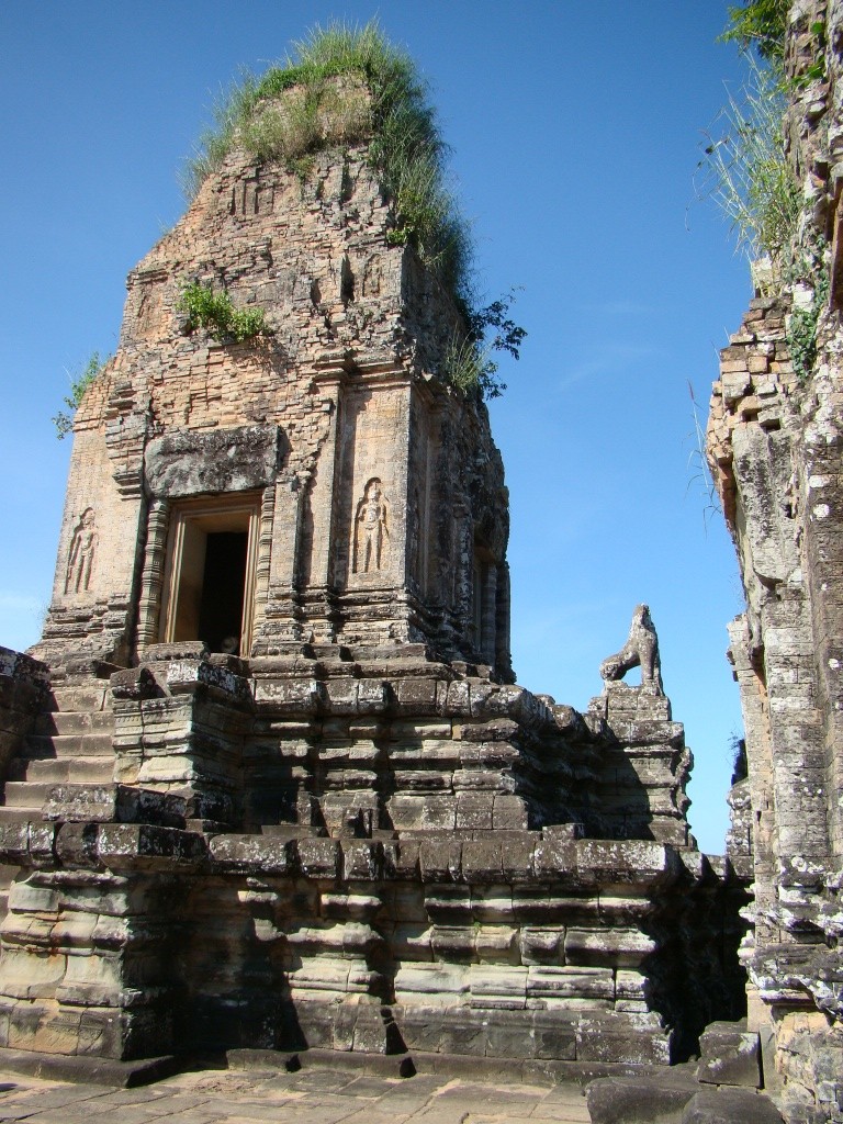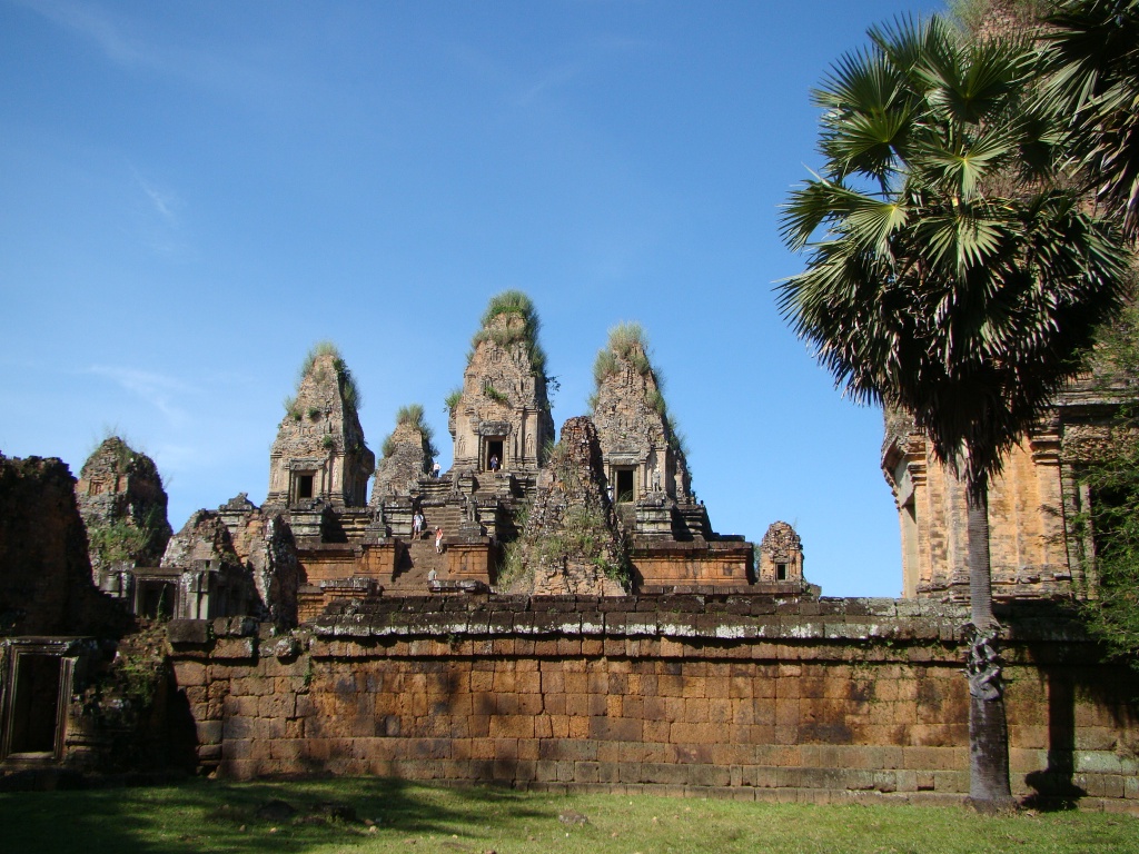 Later that morning we met up with Mike again and started our day 2 exploration. We saw a couple of temples in the morning starting with Pre Rup followed by Banteay Srei. It was about a 1-hr tuk tuk ride to Pre Rup which meant getting an adequate dose of the Cambodian rural scenes. As we passed through small villages little children waved us along with radiant smiles. Shops featuring fabrics, confectionary products (palm sugar candy for one), cold drinks, and other goods lined the road. Patches of rice fields and dispersed livestock (water buffalos and cows), filled our view at times on a backdrop of beautiful blue skies and green distant fields – a dreamy landscape.
