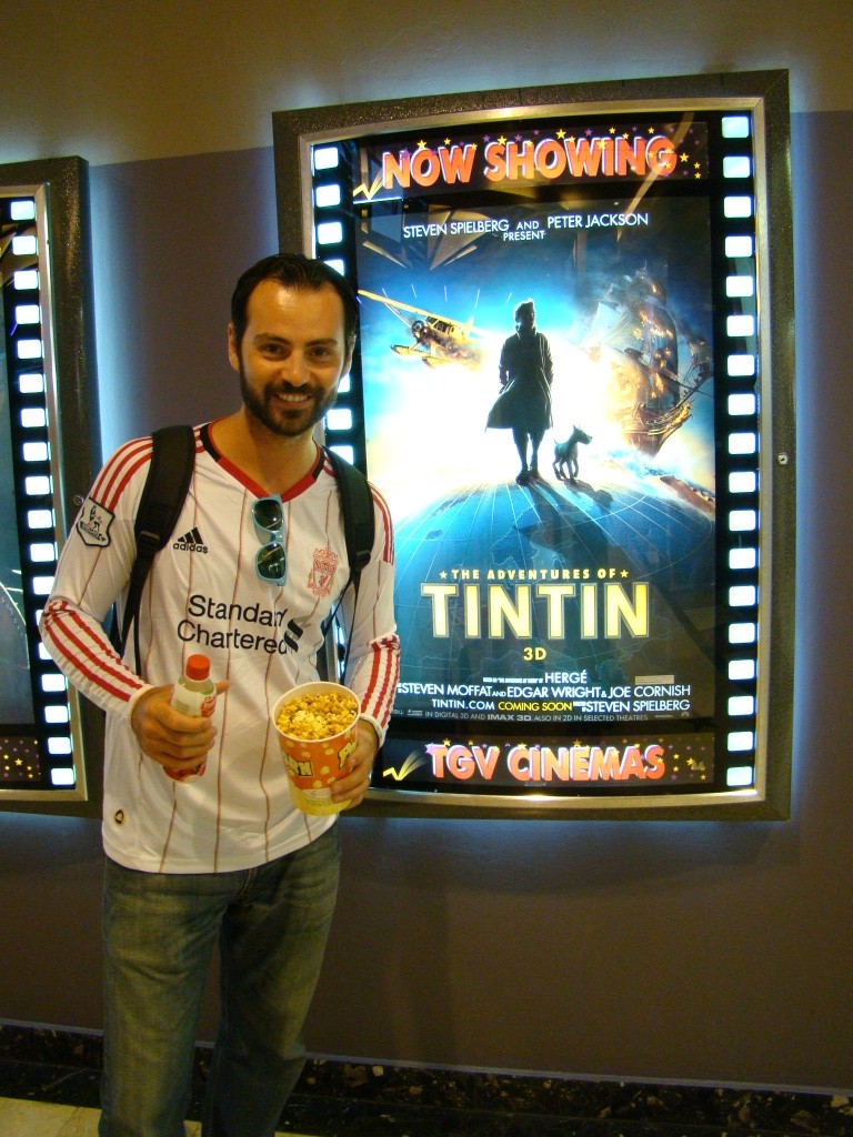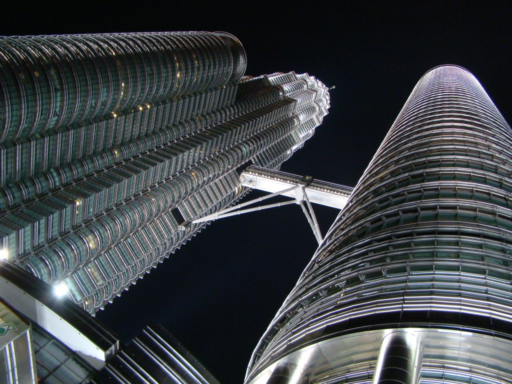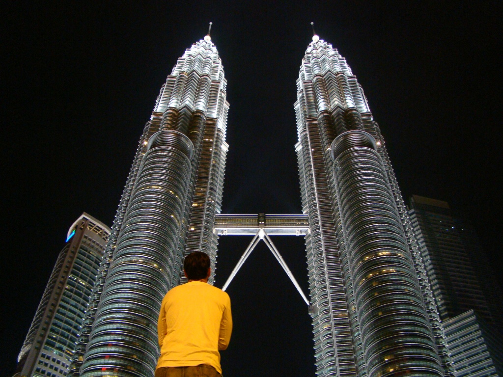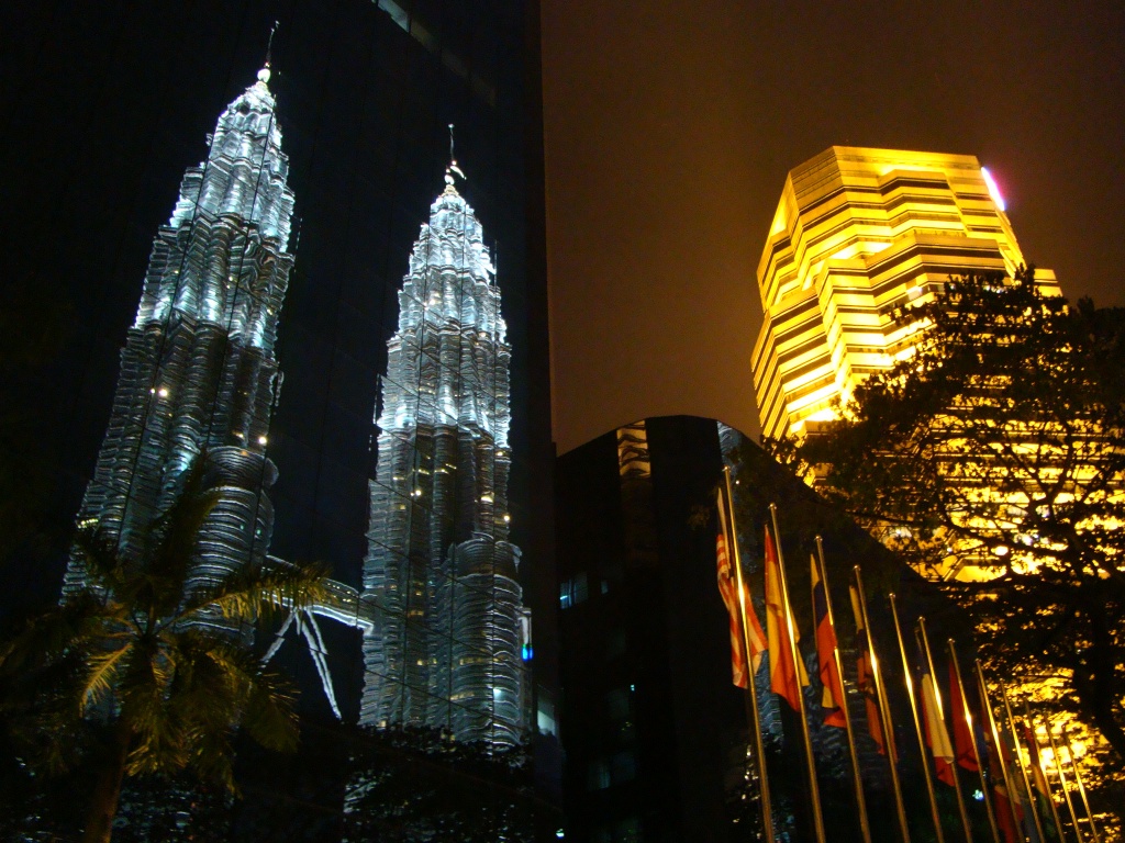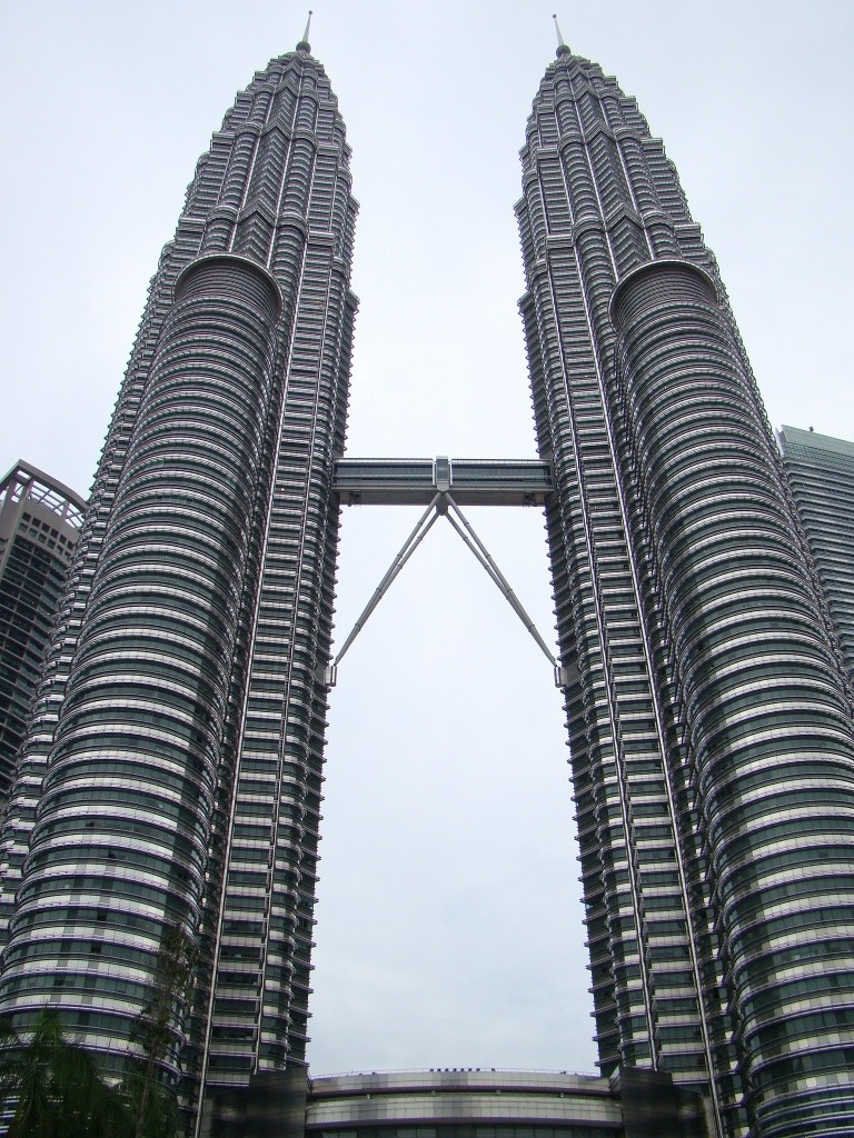 Day 2 saw us covering other parts of KL starting off at the railway station, an artistic structure built in 1910. The nearby National Mosque was also another sighting adorned by rich Islamic architecture but unlike other mosques it was not open to non-Muslim tourists. So we admired it from the outside. Next we made our way through the lush Lake Gardens which gave way to the National Monument, emblematic of Malaysia’s fight and victory for democracy. Next up was the KLCC or Kuala Lumpur Commercial Center which is where the Petronas Towers are located. At last, we stood at the base of the towers in sheer admiration. Tons of reinforced concrete and endless glass blessed by the graces of beautiful Islamic architecture and motifs – BAM! Actually double BAM!! We took a bunch pictures but the overcast sky was unforgiving. So we opted to check out the commercial center which turned out to be “an afternoon at the mall”. KLCC, a vast array of world-class shops for all your purchasing pleasures from Louis V to Rolex, Prada, all the way down to Toys “R” Us and Kinokuniya (a Borders-like bookshop). For a moment we totally felt as though we had been teleported to some fancy mall in South Florida. As luck would have it we later stumbled upon the movie theater and there it was – Tintin the movie – in 3D nonetheless! $17 meant 2 movie tickets and a batch of popcorn plus a lychee juice. An hour and a half full of pure entertainment and adventure but I won’t give away anything as the movie hits theaters in the US in late December (suckers!). By the time we got out of the movie, night had dropped upon KL and we went back to see the towers. The paramount twins glowed with paralyzing beauty. They became our muse for the next hour or so, Brigitte said she needed a bigger camera as I kept rolling film. At night the fraternal giants were simply mesmerizing, beacons of architectural splendors and for us – as New Yorkers – a heartfelt reminder of our late twins. The down side however was that they were closed for tourist visits because of renovations. The bridge on the 41st and 42nd floors connecting the towers is typically a major attraction.