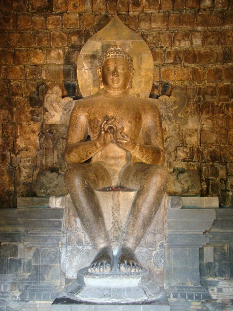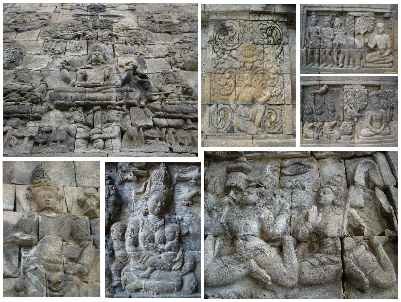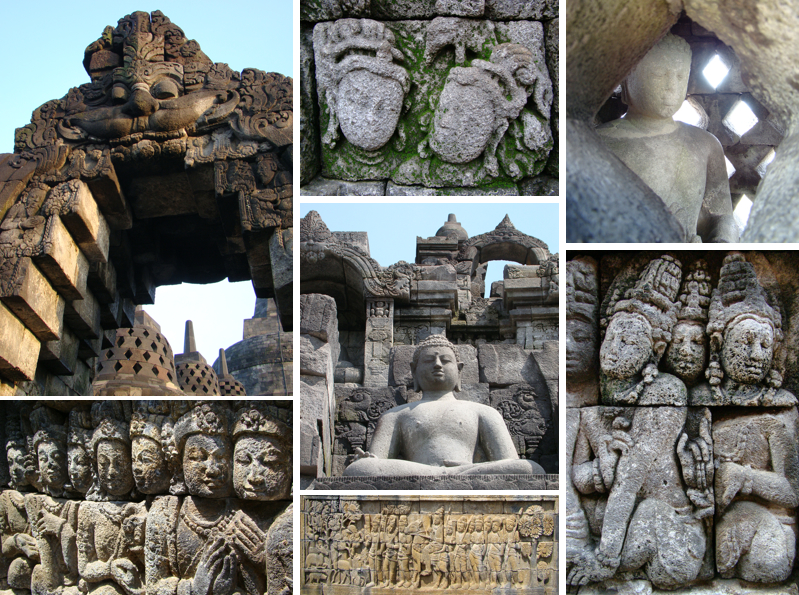 November is the official beginning of Indonesia’s rainy season and downpour is expected pretty much every day. As a result the humidity can be unrelenting and with temperatures in the 90s, Borobudur proved to be one hot affair. We made it to the temple by 9am and the imposing weight of the humidity kicked in overdrive. But so did the magic of Borobudur, the several layers of architectural stone design adorned with reliefs depicting the life of Buddha (on the bottom layers), statues and stupas (on the top layers). There are 72 bell-shaped stupas – one of Borobudur’s defining characteristics – each cocooning a statue of Buddha. The grand stupa (much larger than the other 72), sits at the center of the top layer however there is nothing inside. We explored each level of Borobudur in true pilgrim fashion – entering through the Eastern gate – making our way clockwise around each level and then ascending to the top. Brigitte snapped dozens of pictures of the reliefs with intensity – I see a collage in the making. Upon reaching the top levels the belled stupas started to fascinate us. Why 72? Why the bell shape? Why the circular formation? And why is there a Buddha inside each except for the grand stupa? Answers to some of these questions may remain a mystery as is the origin of the temple’s name itself.