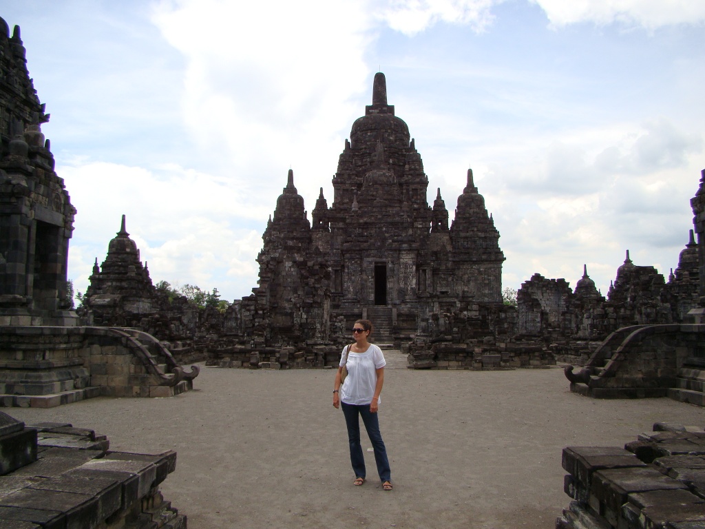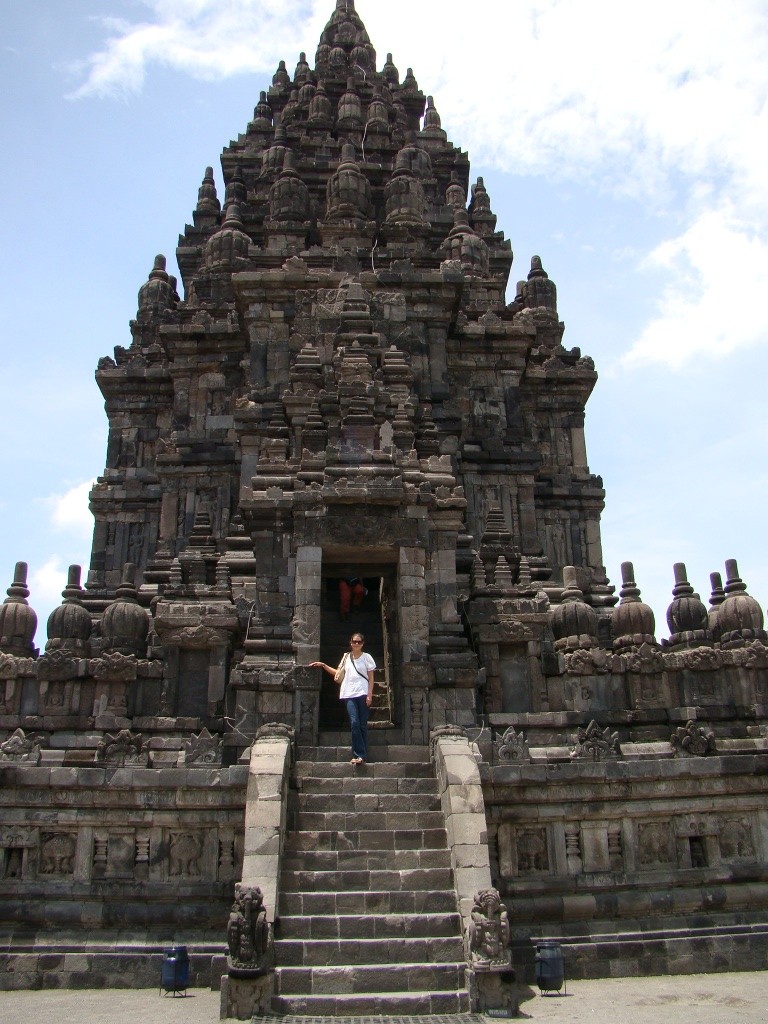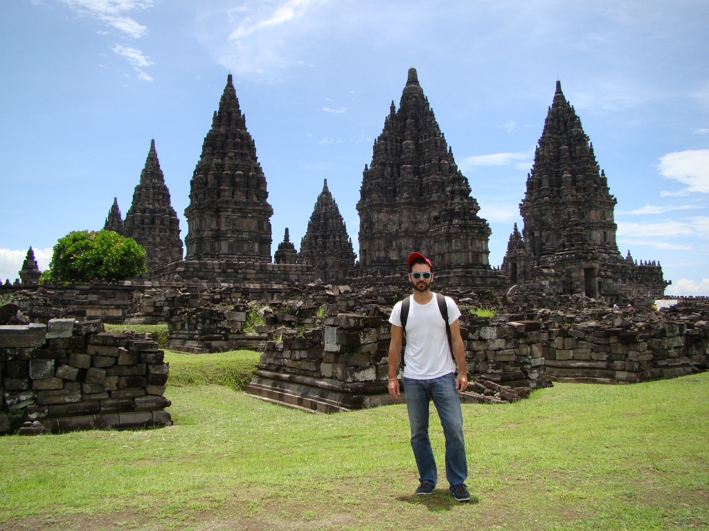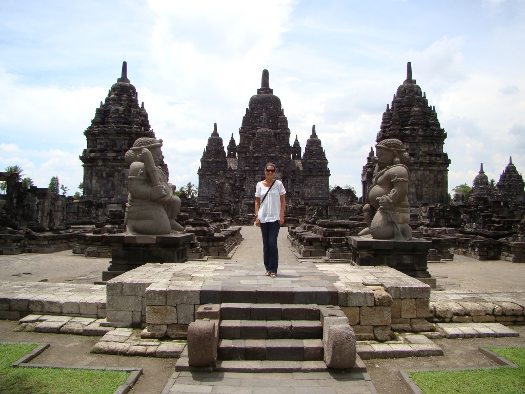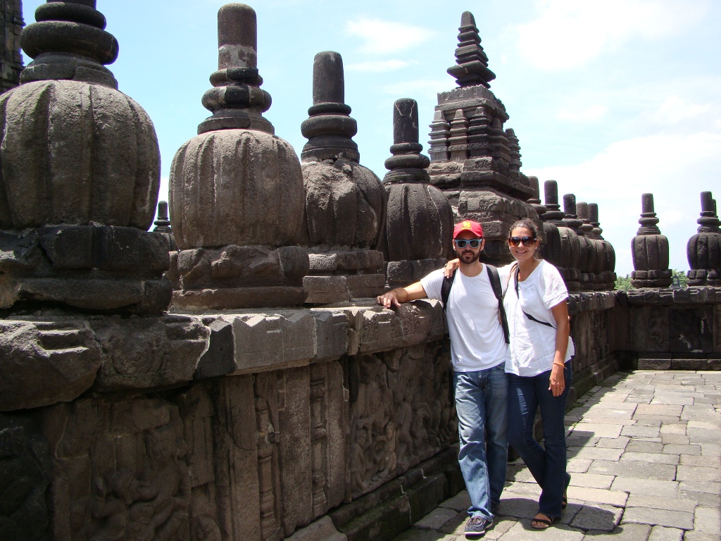 The next morning we made our way to the airport heading for our much acclaimed next destination, Bali. But there was one last stop to make near Yogyakarta and that was the Hindu temple complex of Prambanan. Hinduism has been prevalent throughout Indonesia for centuries and Prambanan is a testament to its impact on Javanese life. The 8th century temple complex is comprised of 3 prominent towers with the middle one standing 47 meters tall in dedication to the god Shiva. Elaborate reliefs decorated the lower levels of all 3 towers depicting various gods, animals and scenes from everyday life. Like Borobudur the Prambanan complex was constructed from andesite stone without use of any adhesive. The dark stones impressively stood out against the bright blue sky amplifying our photo effects. About half mile away sat another impressively beautiful yet unique temple. Sewu, the second largest Buddhist temple in Indonesia, appeared in front of us and best of all there was no-one else in sight. We selfishly relished at having it all to ourselves (for about 20 minutes), daring for a second to feel as though we had “rediscovered” it. Sewu’s towers were topped with bell-shaped stupas reminiscent of Borobudur.