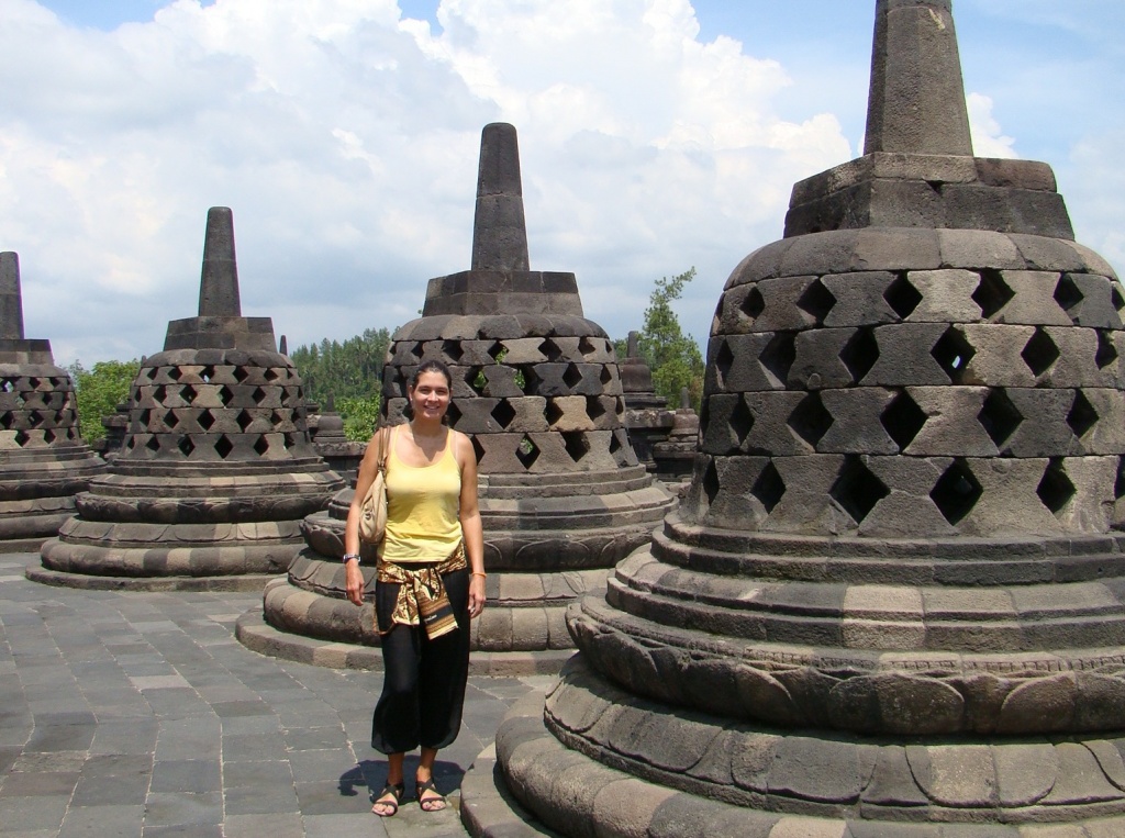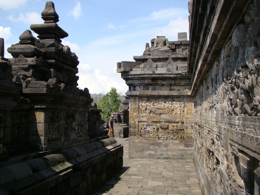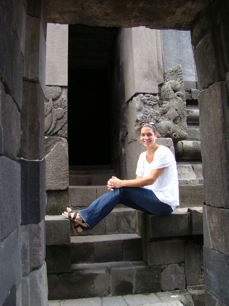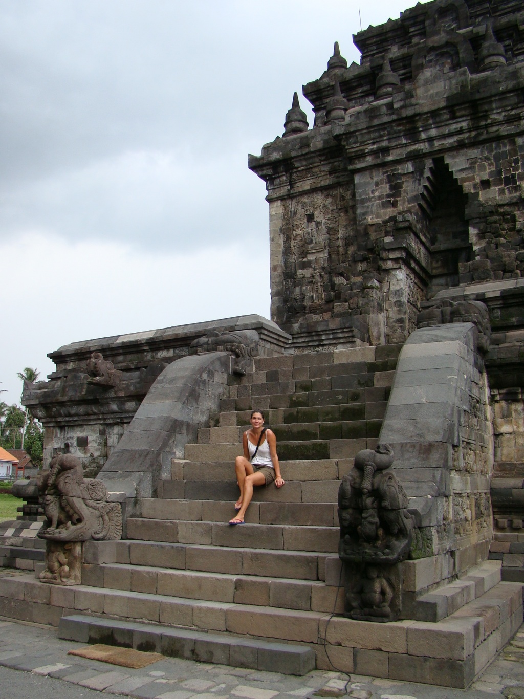 The next morning we made our way to the airport heading for our much acclaimed next destination, Bali. But there was one last stop to make near Yogyakarta and that was the Hindu temple complex of Prambanan. Hinduism has been prevalent throughout Indonesia for centuries and Prambanan is a testament to its impact on Javanese life. The 8th century temple complex is comprised of 3 prominent towers with the middle one standing 47 meters tall in dedication to the god Shiva. Elaborate reliefs decorated the lower levels of all 3 towers depicting various gods, animals and scenes from everyday life. Like Borobudur the Prambanan complex was constructed from andesite stone without use of any adhesive. The dark stones impressively stood out against the bright blue sky amplifying our photo effects. About half mile away sat another impressively beautiful yet unique temple. Sewu, the second largest Buddhist temple in Indonesia, appeared in front of us and best of all there was no-one else in sight. We selfishly relished at having it all to ourselves (for about 20 minutes), daring for a second to feel as though we had “rediscovered” it. Sewu’s towers were topped with bell-shaped stupas reminiscent of Borobudur.