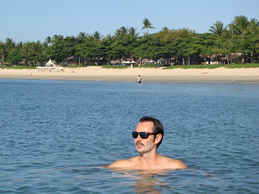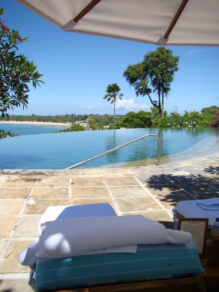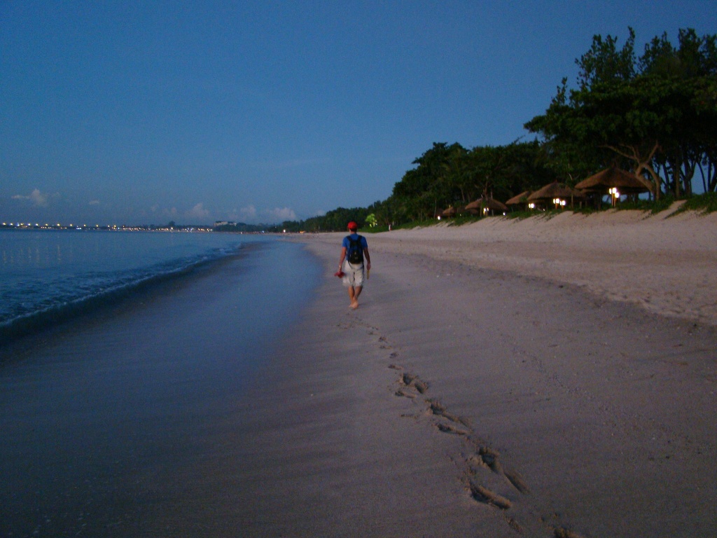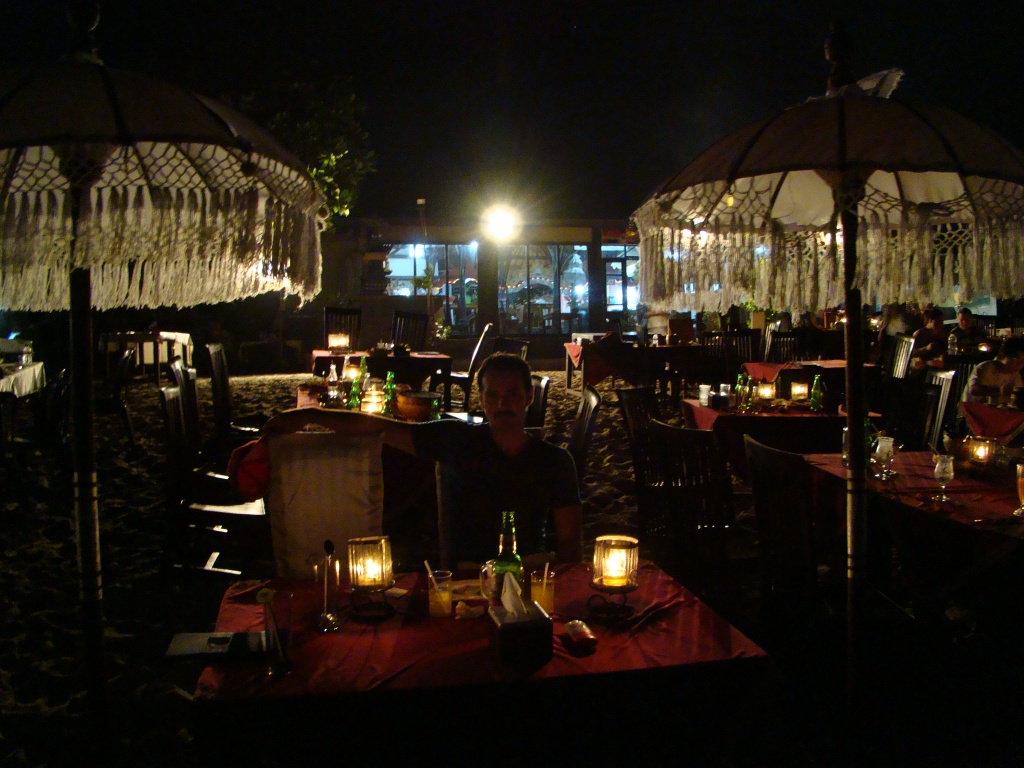 Another day meant another beach, this time it was Jimbaran. Armed with a gift certificate to the Four Seasons Hotel (wedding gift courtesy of Tarek – merci encore!), we hopped in a “taksi” and made our way over for lunch. The impeccably manicured cliff grounds overlooking the bay were stunning. Also impeccable was our lunch, Brigitte’s double salad order and my chicken burger were simply delicious. Not to mention the refreshing glasses of Viognier and Riesling that accompanied our meal. We voraciously imbibed as much of the scenery as possible knowing it was to be ephemeral. But we did get a good sense of how “the other half” lives. At one point we noticed a waiter wiping clean the sunglasses of a patron at the table next to us. Unnecessary and somewhat slave-like in my mind but I suppose when you spend $800 (or more), a night that’s just a common courtesy. The Four Seasons actually didn’t have its own beach but right next door sat the clean whitish sands of Jimbaran beach. We rented 2 beach chairs and lazed about for the entire afternoon and into the evening. It was hot, very hot and the frequent dips in the Indian Ocean helped us cope. Jimbaran offers great sunset views and it’s also littered with beachfront restaurants dishing out local sea fare. After sunset we made our way up the beach for about a mile and a half and settled on a beachfront table at one of the numerous places. The fish was delish!