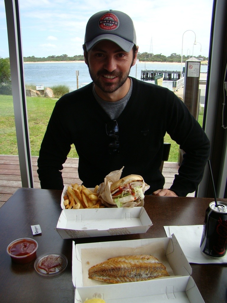 One of the places we chose to stop was Phillip Island, a rich wildlife habitat that’s home to the smallest penguins in the world (the Little Penguin) and plenty of other animals. During one of our days there we started our morning at the Koala Conservation Center, a forest where 30 koalas are permanent residents. Seeing the cute and cuddly balls of fur was a lot of fun (even though most of them were asleep – they sleep about 20 hours a day due to their slow metabolism). We even saw a mother and baby duo (awake!), walking and climbing around. These creatures are irresistibly cute and most people fall in love with them, as did we. Of course Brigitte wants one which means we’d have to move to Australia. After the koala center we had lunch at a fish and chips place in San Remo overlooking Western Port Bay. From the restaurant I spotted what appeared to be giant stingrays by the pier, and upon closer inspection there were actually 4 or 5 of them gracefully gliding in 2 – 3 feet of clear water. It would be amazing to one day swim among these swift creatures.